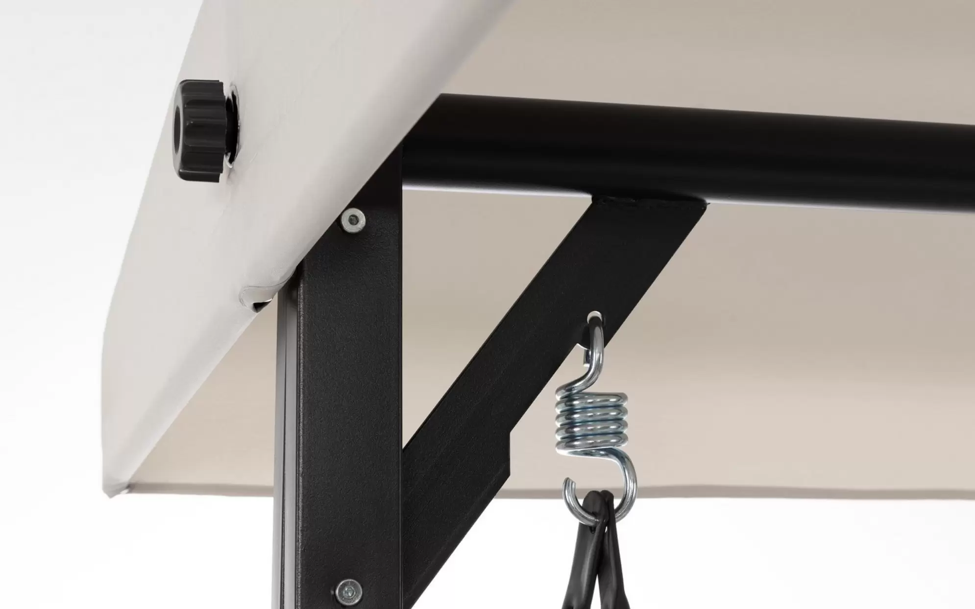 Regulowany daszek poliestrowy 180 g/m² umożliwia dopasowanie kąta nachylenia do aktualnego nasłonecznienia. Całość skręcana jest ocynkowanymi śrubami, co zwiększa odporność na korozję i wydłuża żywotność produktu.