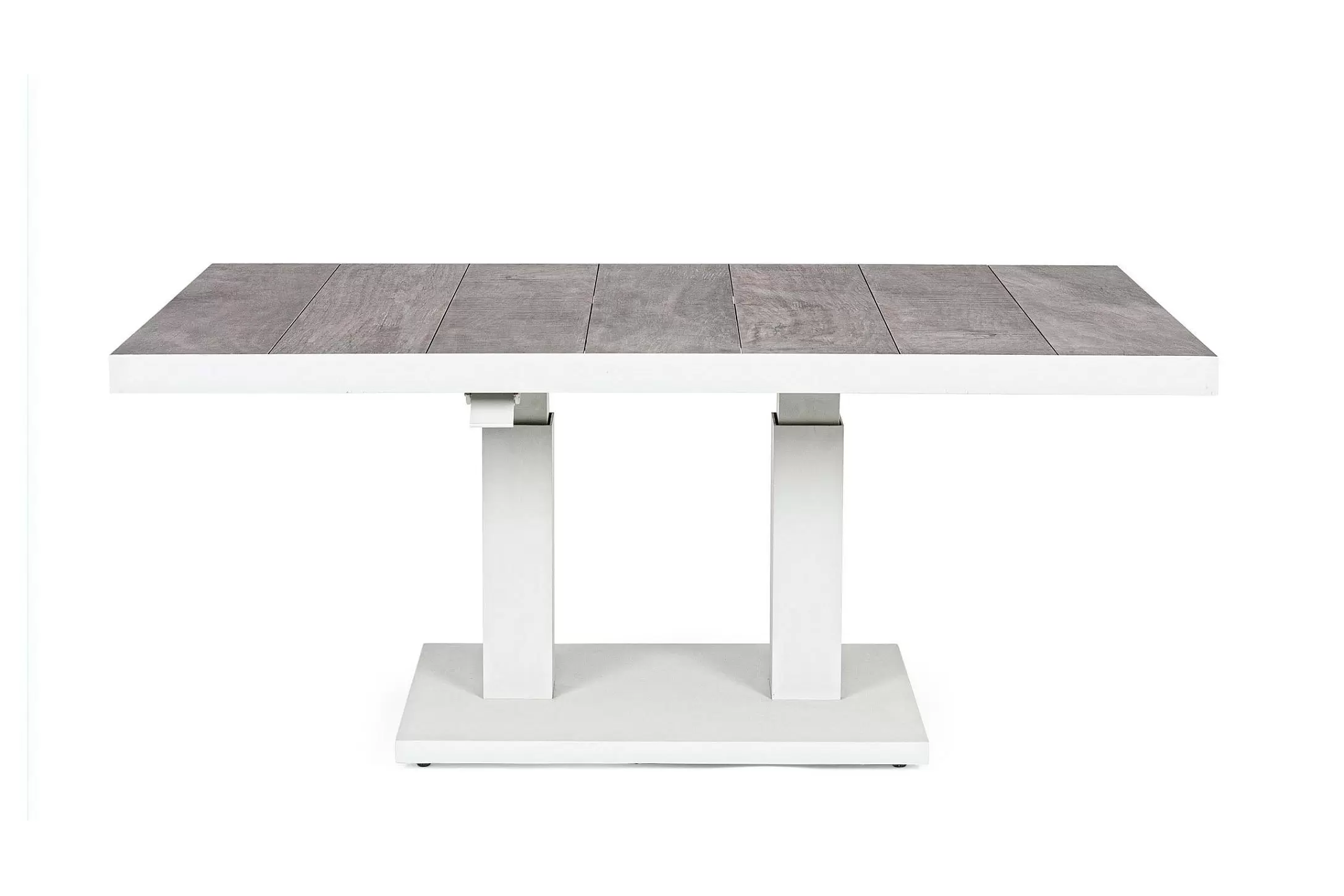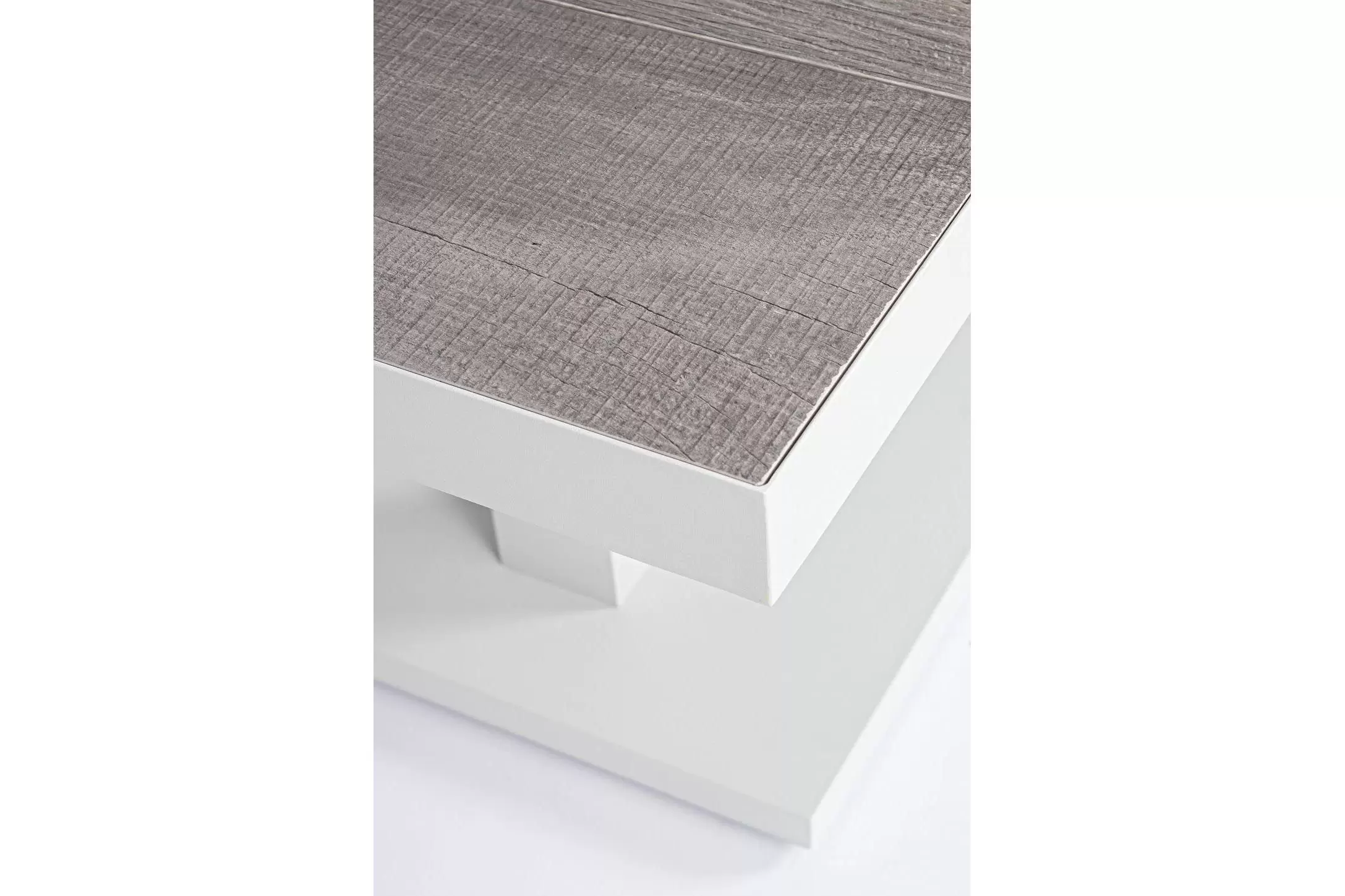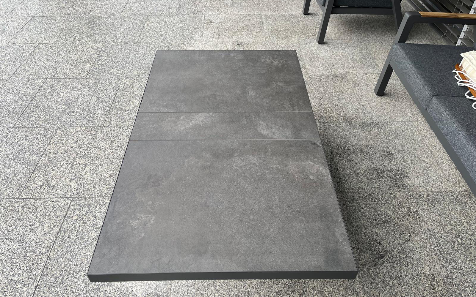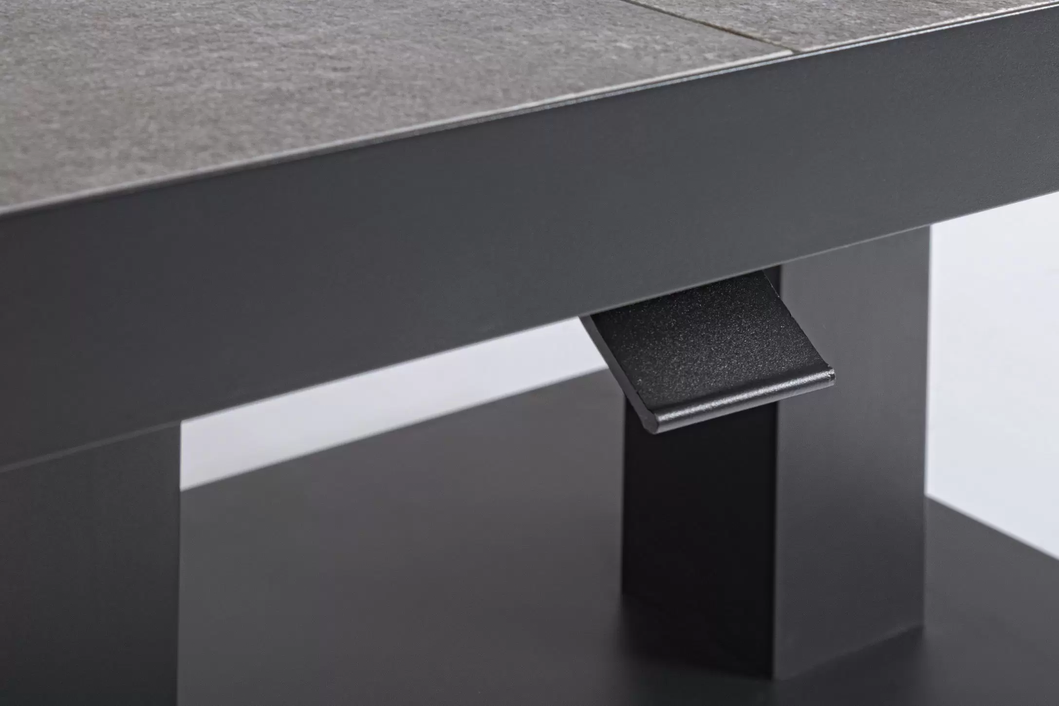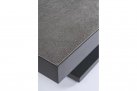 Konstrukcja stołu aluminiowa z blatem z ceramicznych płyt z powierzchnią imitującą naturalny kamień (kolor antracyt) lub z imitacją postarzanego drewna (kolor biały konstrukcji).
