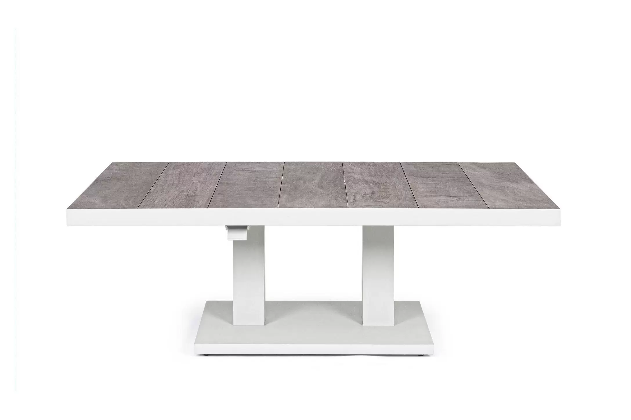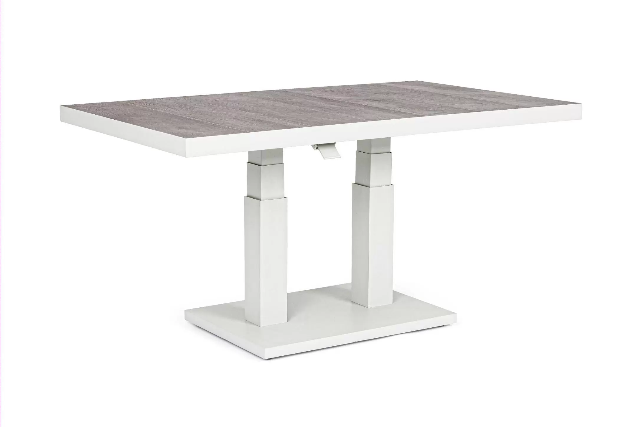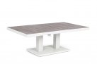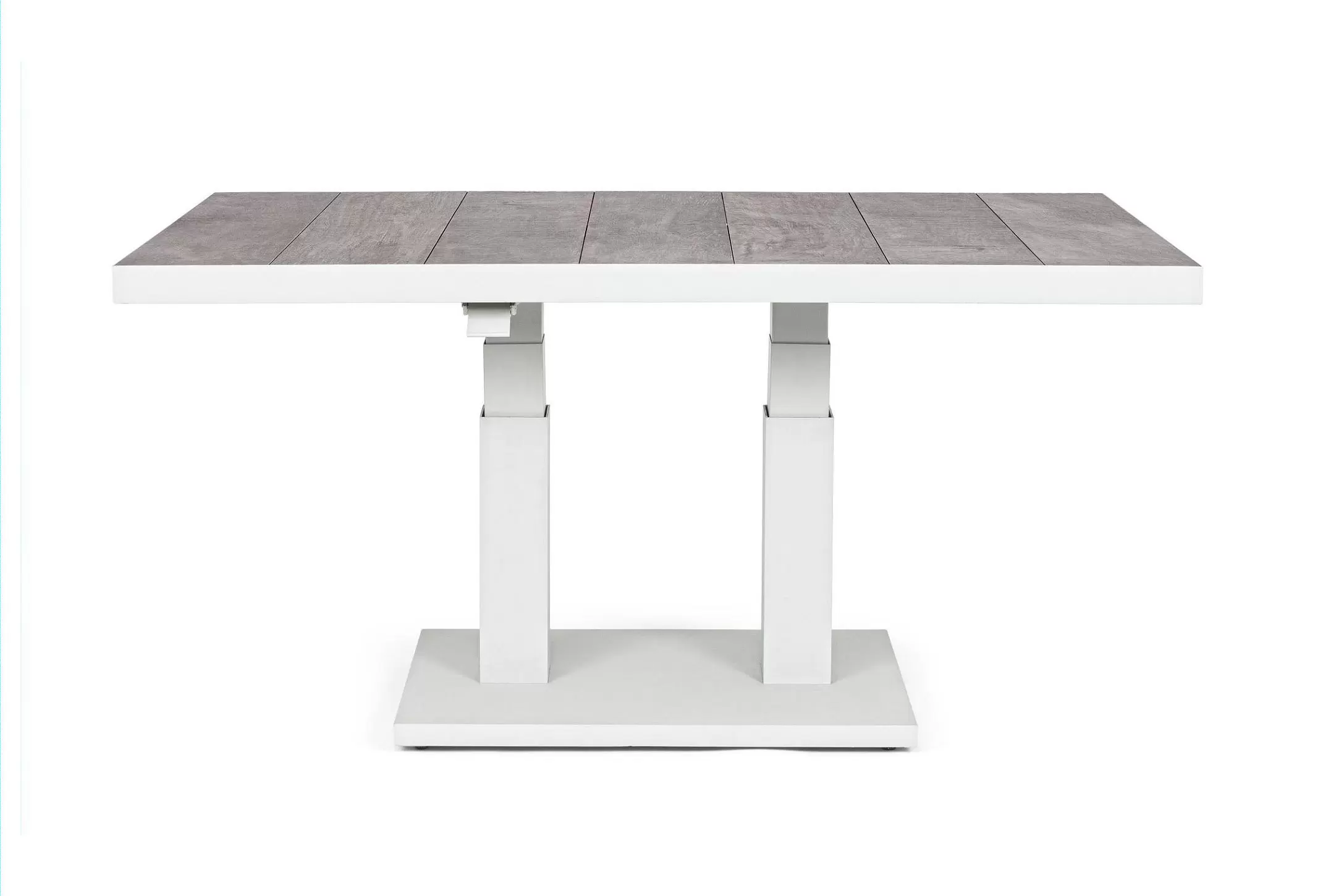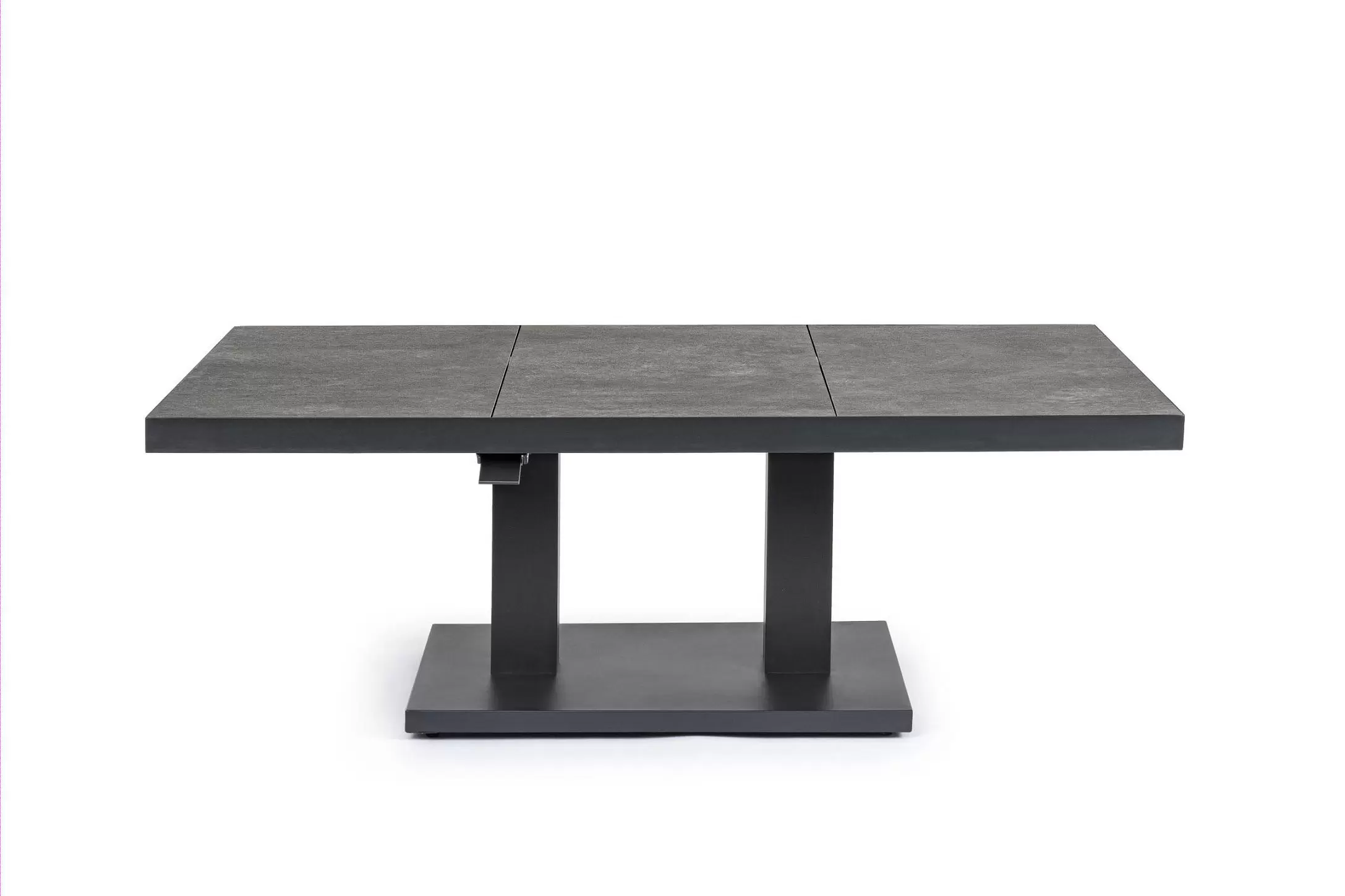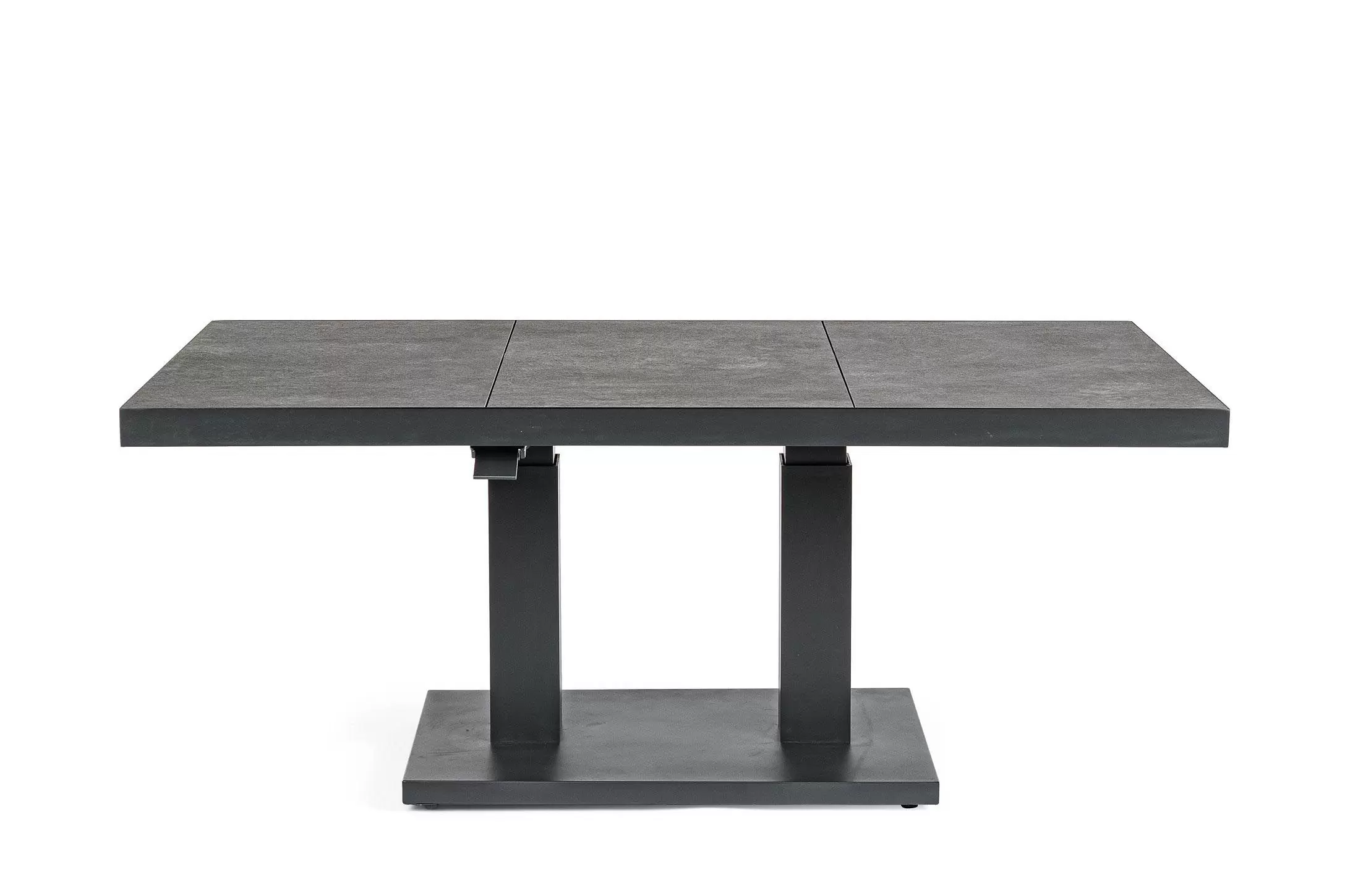 Konstrukcja stołu aluminiowa z blatem z ceramicznych płyt z powierzchnią imitującą naturalny kamień (kolor antracyt) lub z imitacją postarzanego drewna (kolor biały konstrukcji).
