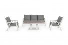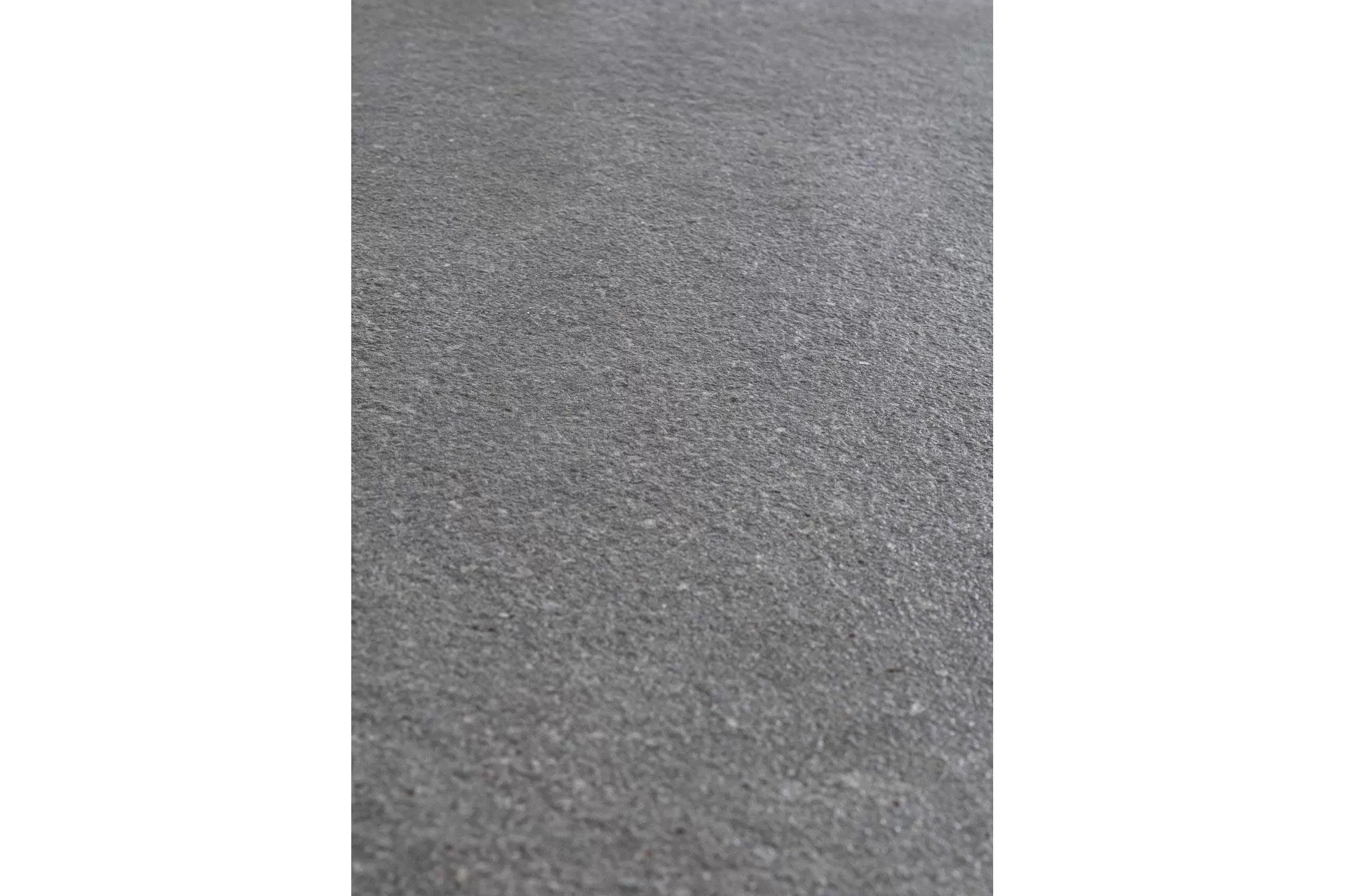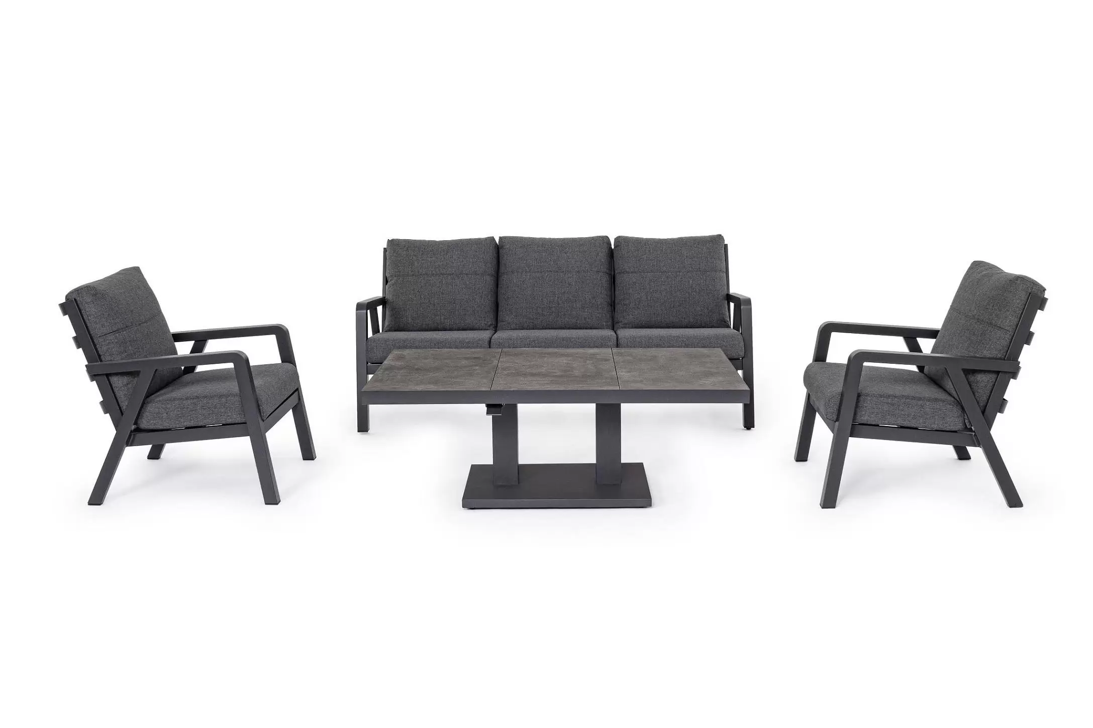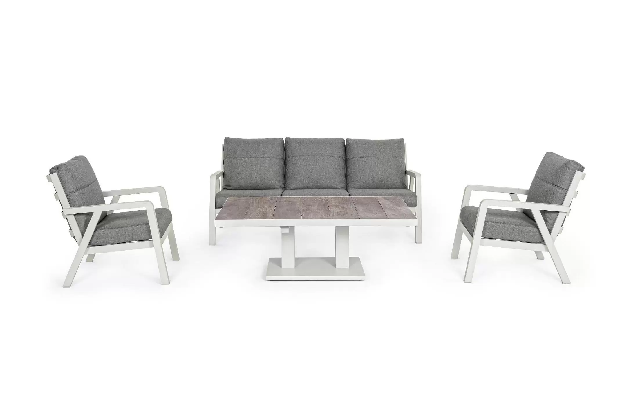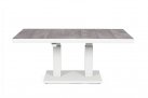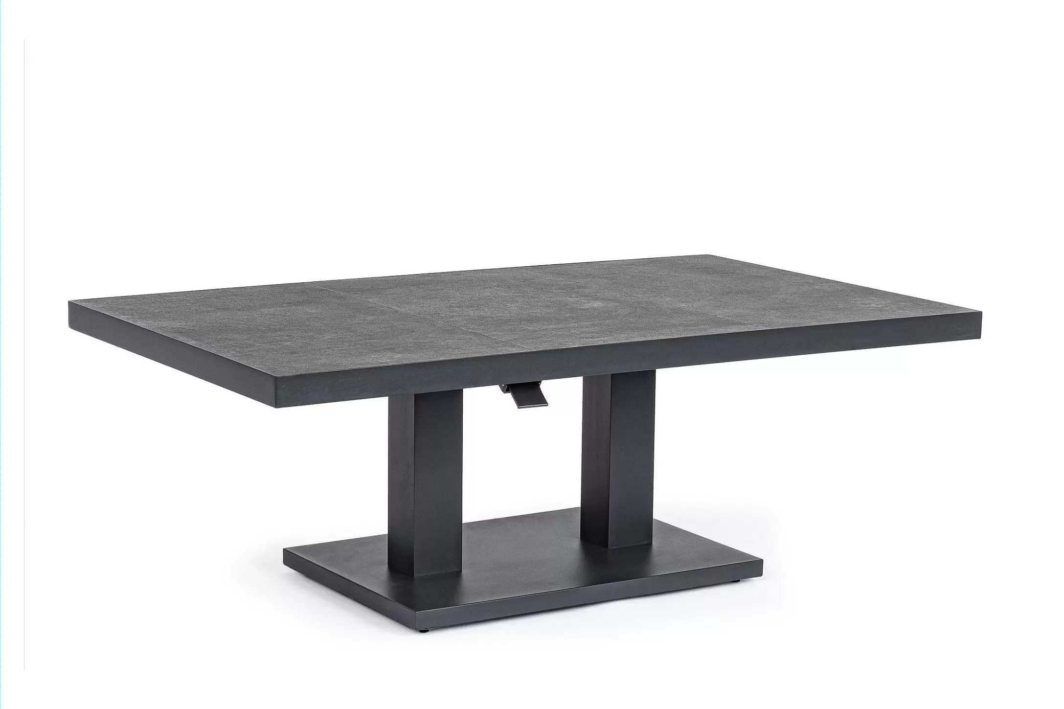 Konstrukcja stołu aluminiowa z blatem z ceramicznych płyt z powierzchnią imitującą naturalny kamień (kolor antracyt) lub z imitacją postarzanego drewna (kolor biały konstrukcji).