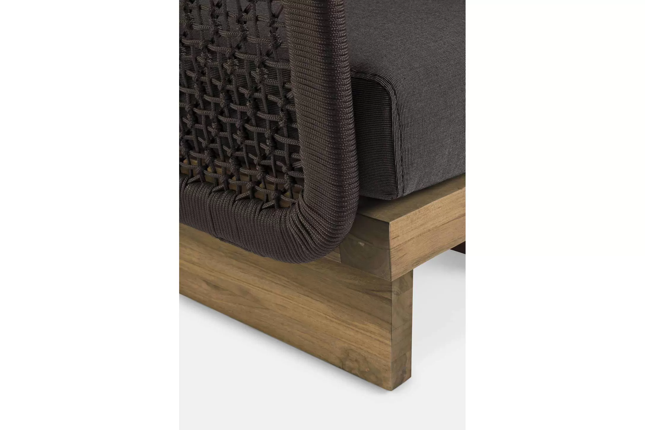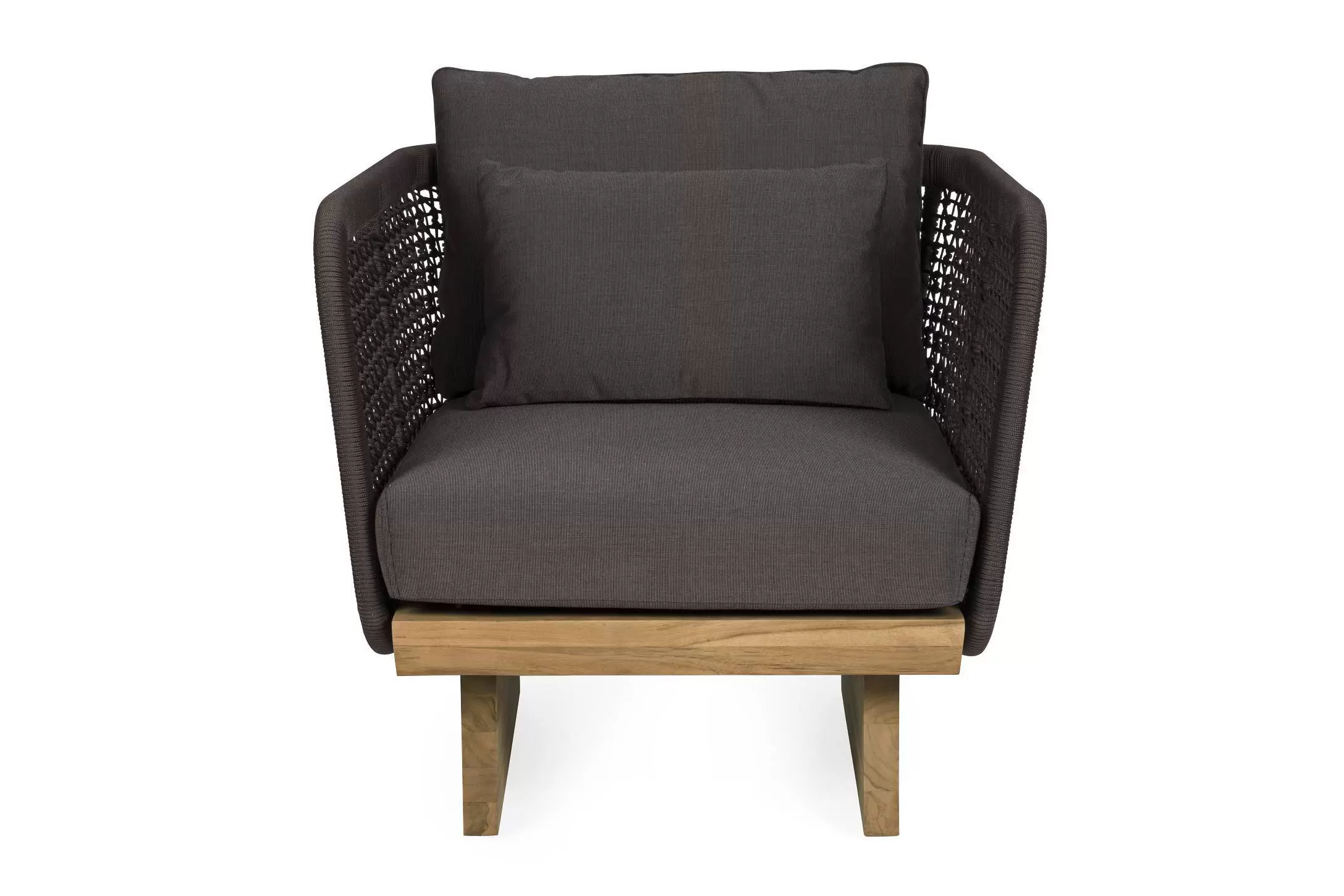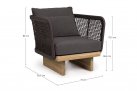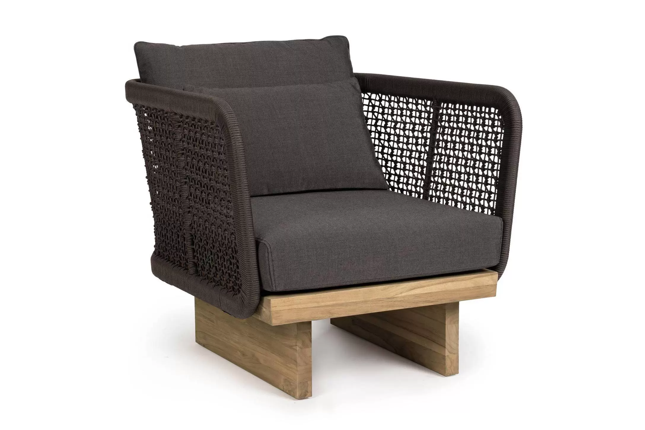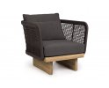 Luksusowy fotel wypoczynkowy na taras. Podstawa z drewna teak w stylu rustykalnym. Oparcie aluminiowe ciemnoszare z plecionką z liny polipropylenowej. Poduszki szybkoschnące z poszewkami z materiału Sunbrella.