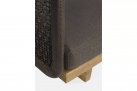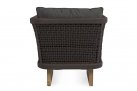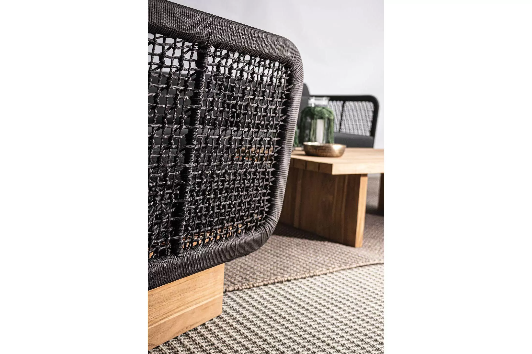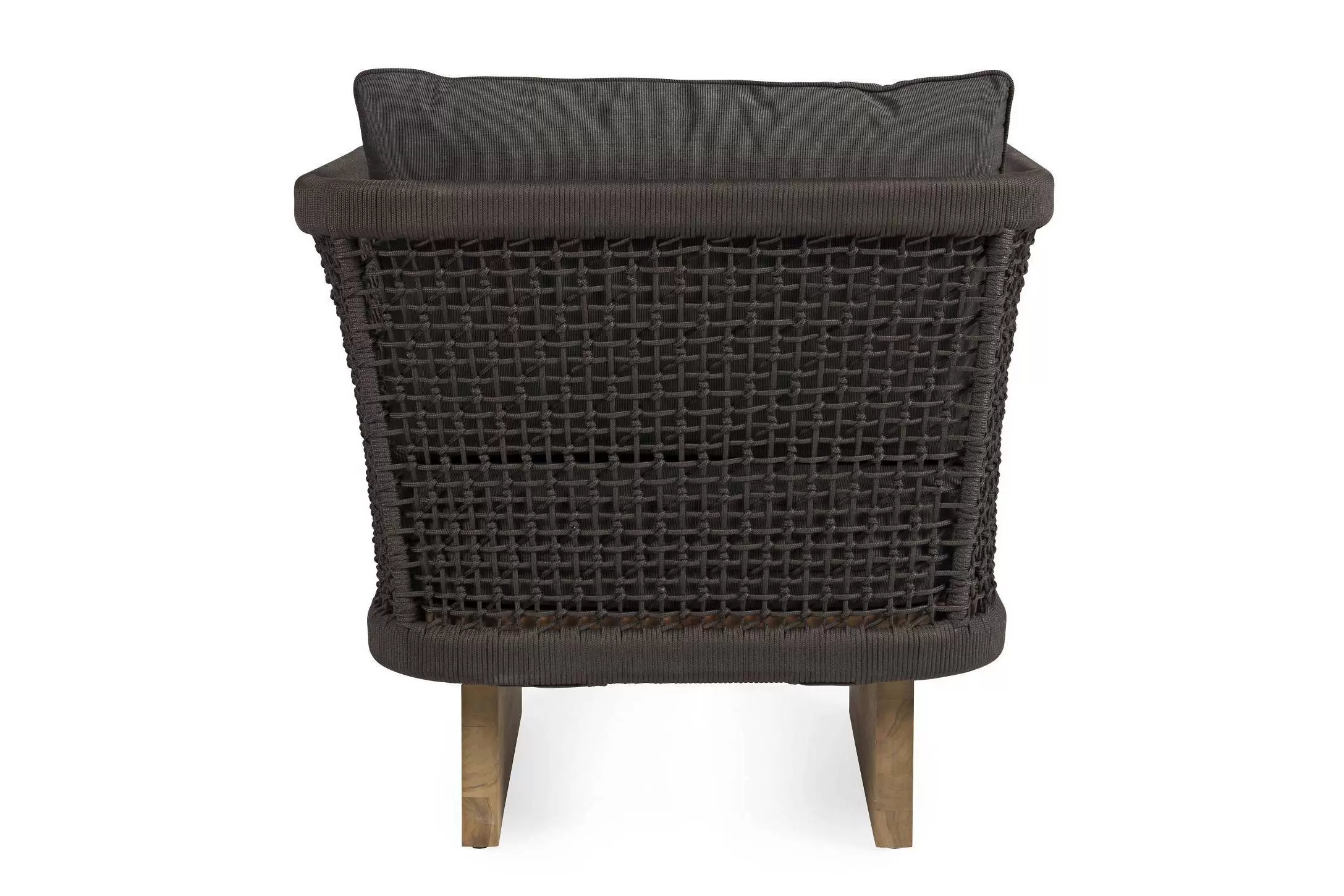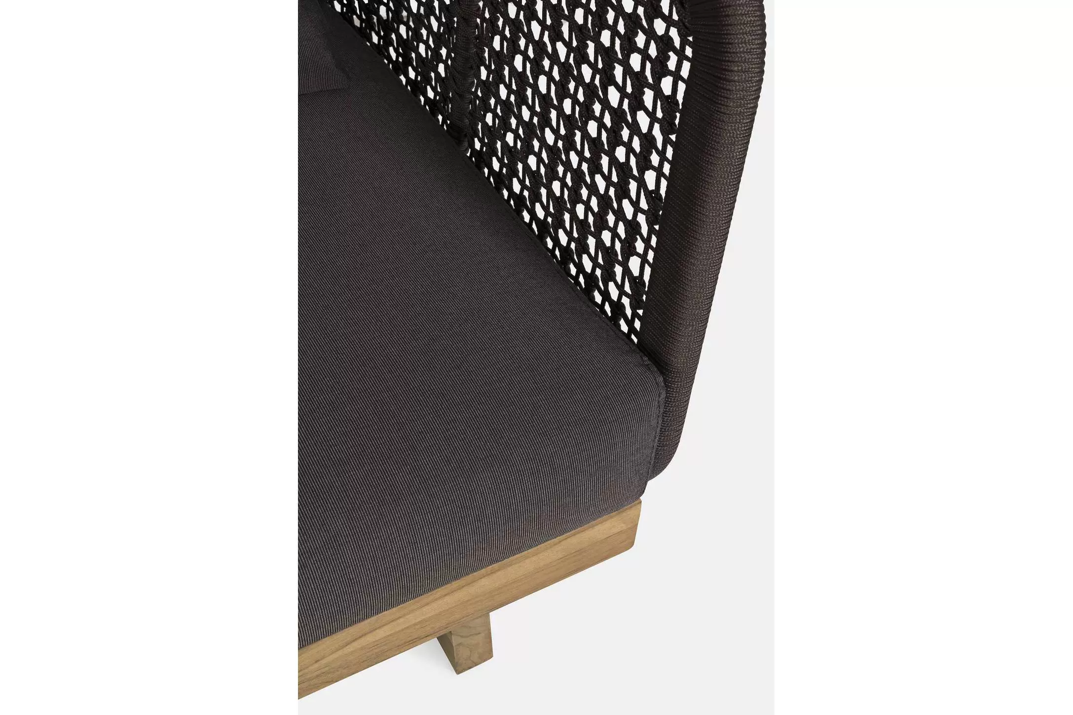 Luksusowy fotel wypoczynkowy na taras. Podstawa z drewna teak w stylu rustykalnym. Oparcie aluminiowe ciemnoszare z plecionką z liny polipropylenowej. Poduszki szybkoschnące z poszewkami z materiału Sunbrella.