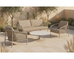 Konstrukcja mebli została wykonana z lekkiego i trwałego aluminium w kolorze beżowym, odpornego na warunki atmosferyczne i korozję. Sofa oraz fotele wyróżniają się dekoracyjną plecionką na oparciach, która nadaje całości subtelnej lekkości i podkreśla elegancki design zestawu.