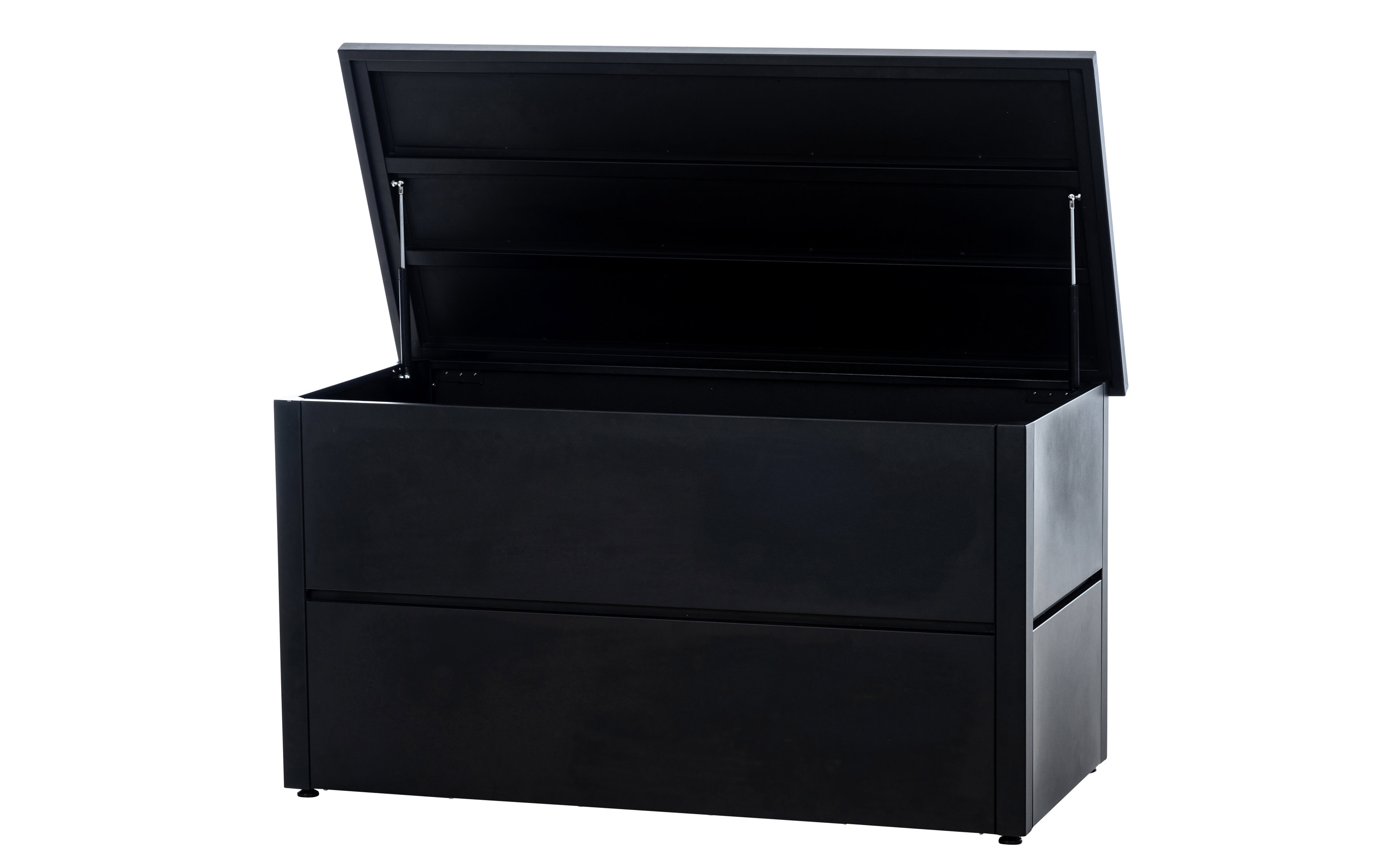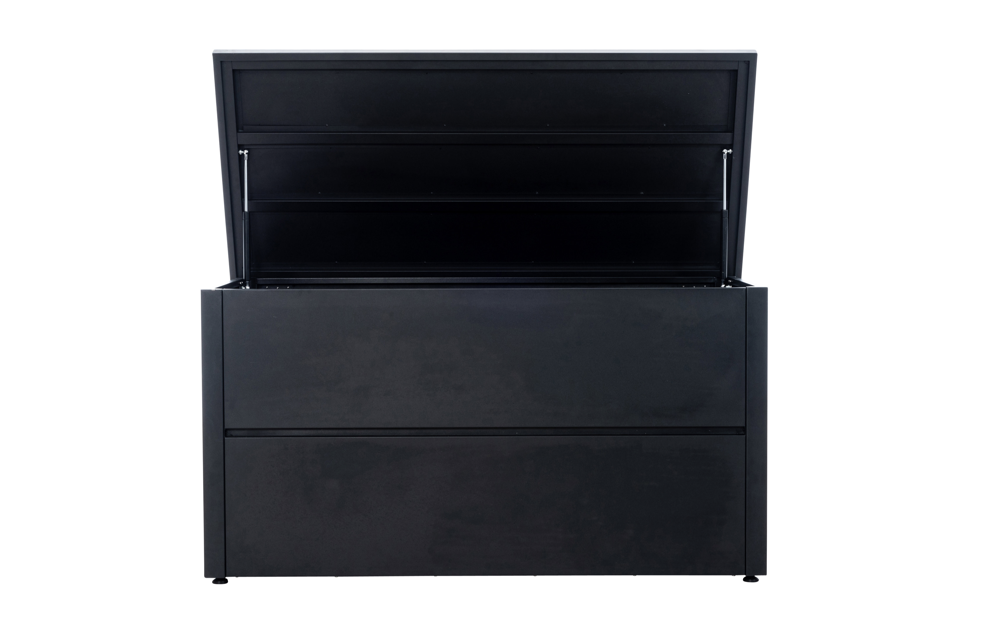 Skrzynia ogrodowa do przechowywania Agrigento to eleganckie i funkcjonalne rozwiązanie do przechowywania poduszek do mebli ogrodowych lub innych ogrodowych drobiazgów. Skrzynka wykonana jest z malowanej proszkowo stali nierdzewnej i chroni meble ogrodowe przed czynnikami atmosferycznymi i korozją. Dwa amortyzatory gazowe na pokrywie zapewniają praktyczne wsparcie i łatwą obsługę - gwarantują delikatne otwieranie i zamykanie. Dodatkowo skrzynka wsporcza posiada cztery regulowane nóżki, które idealnie skompensują niewielkie nierówności podłoża.