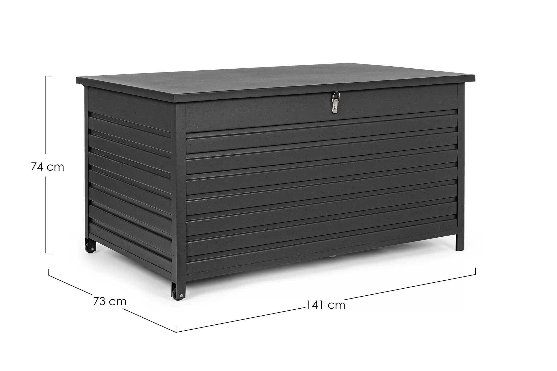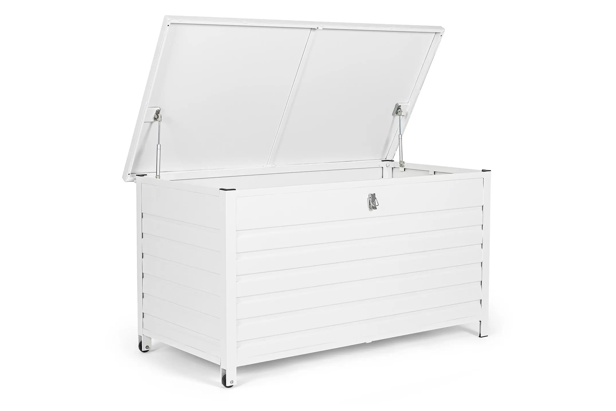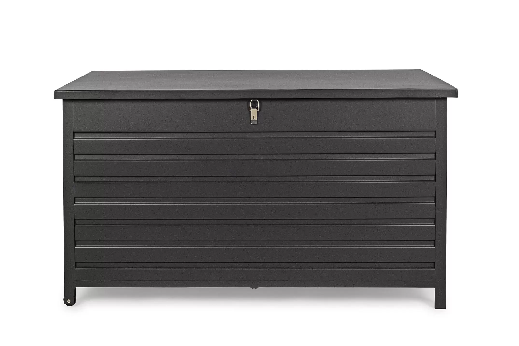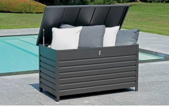 Aluminiowa skrzynia ogrodowa z kółkami pomieści wiele niezbędnych elementów wyposażenia mebli ogrodowych. Kółka pozwalają na przestawianie według potrzeb.