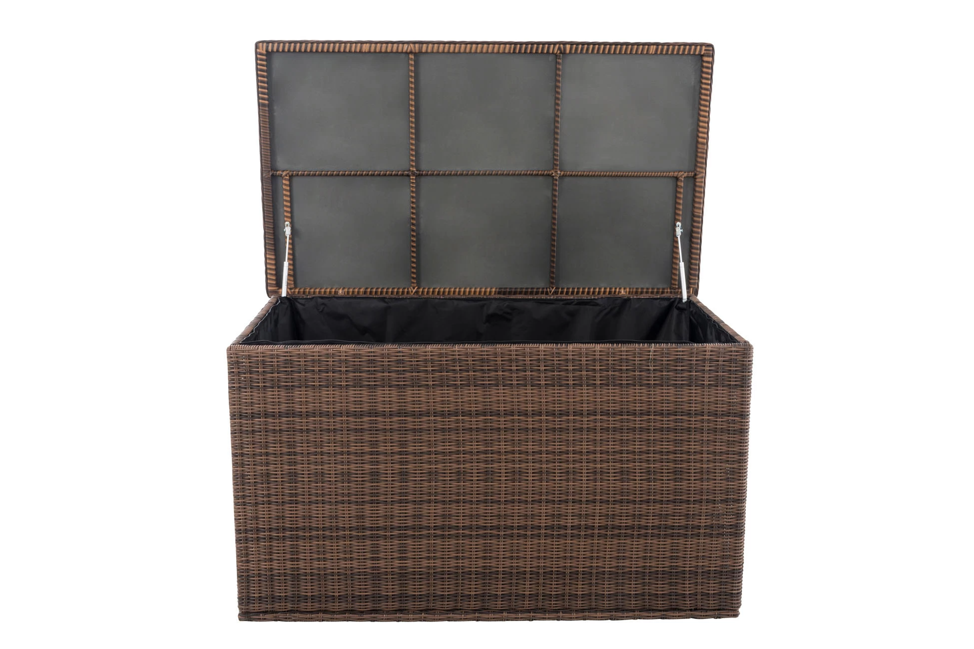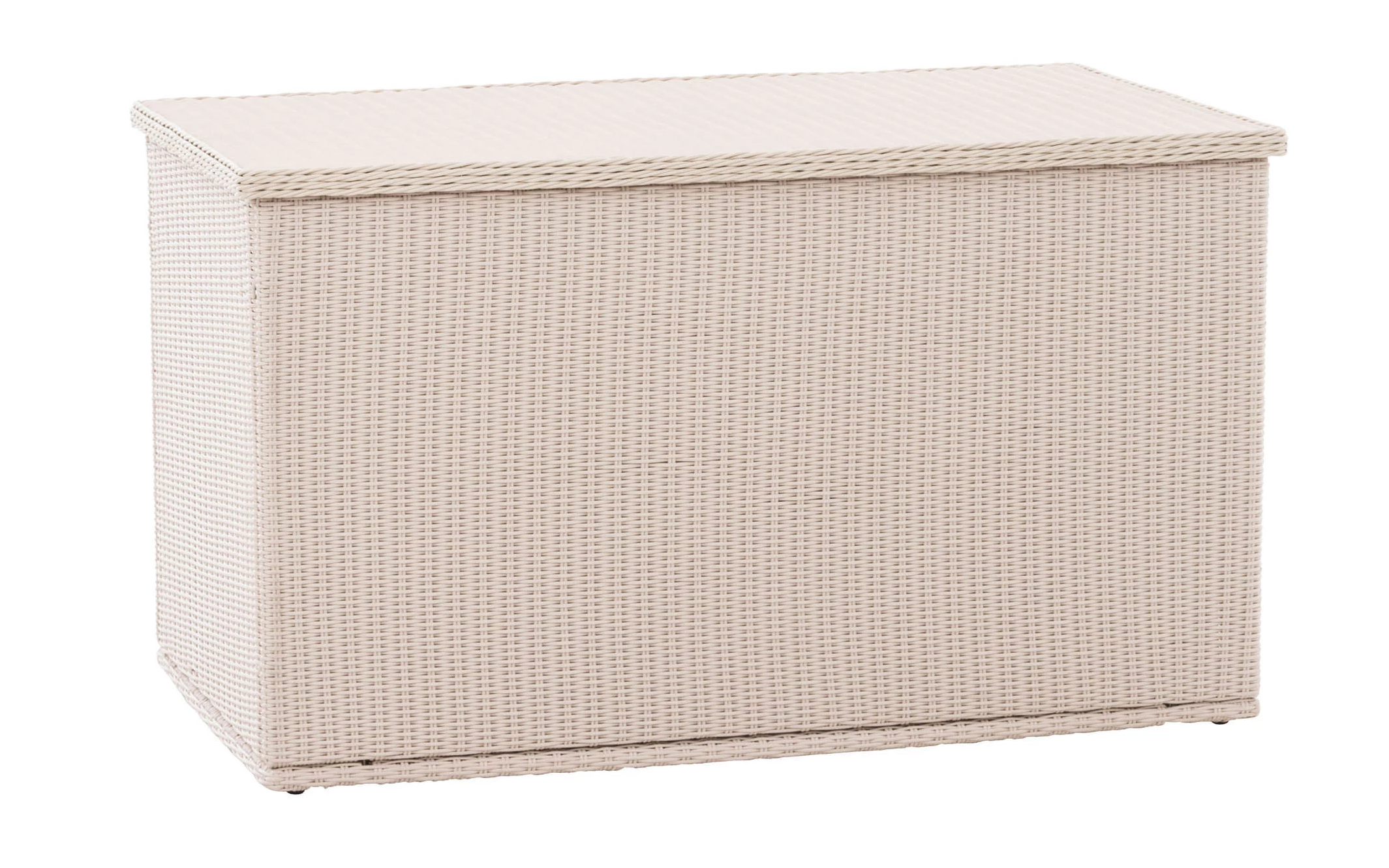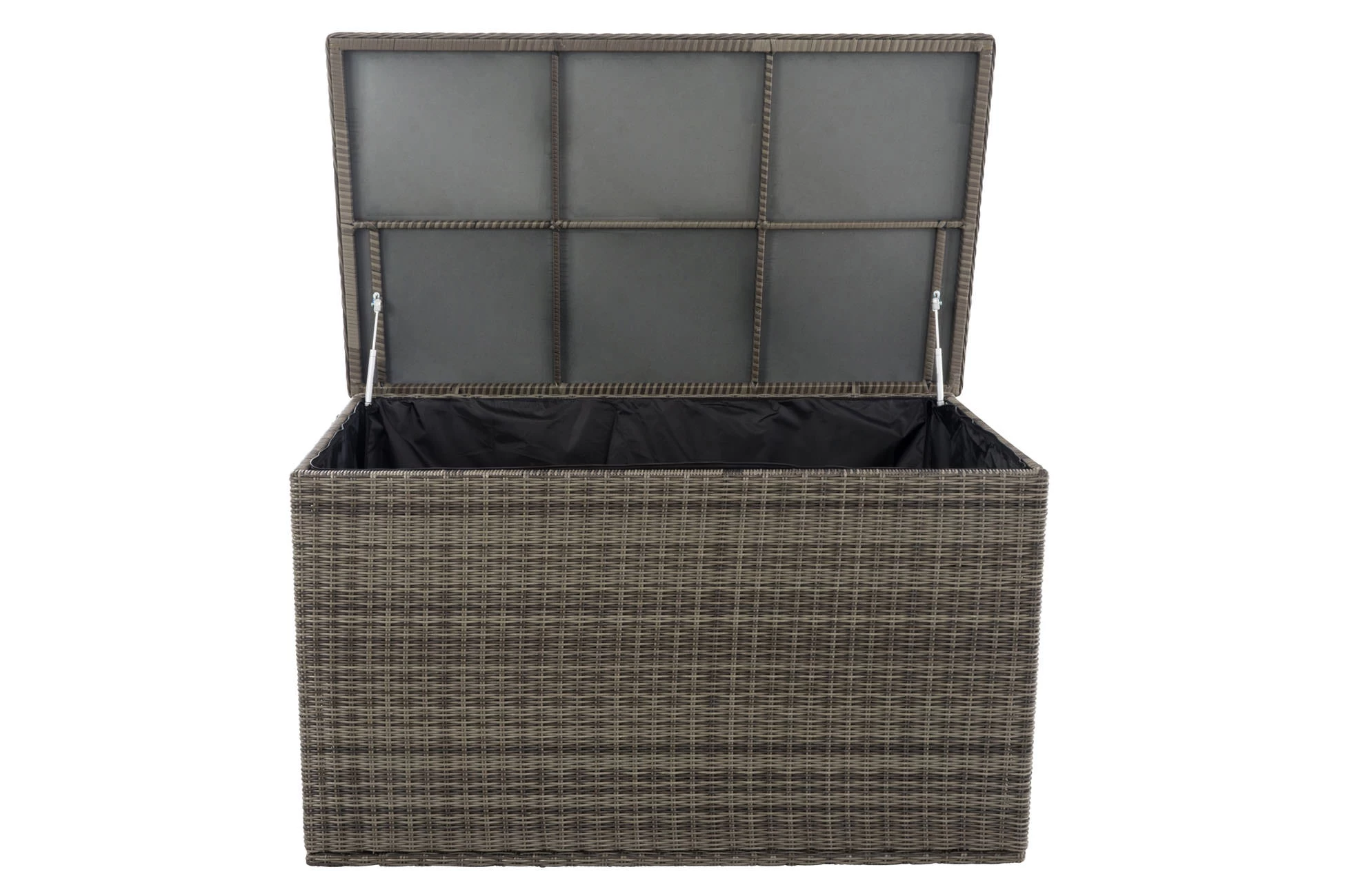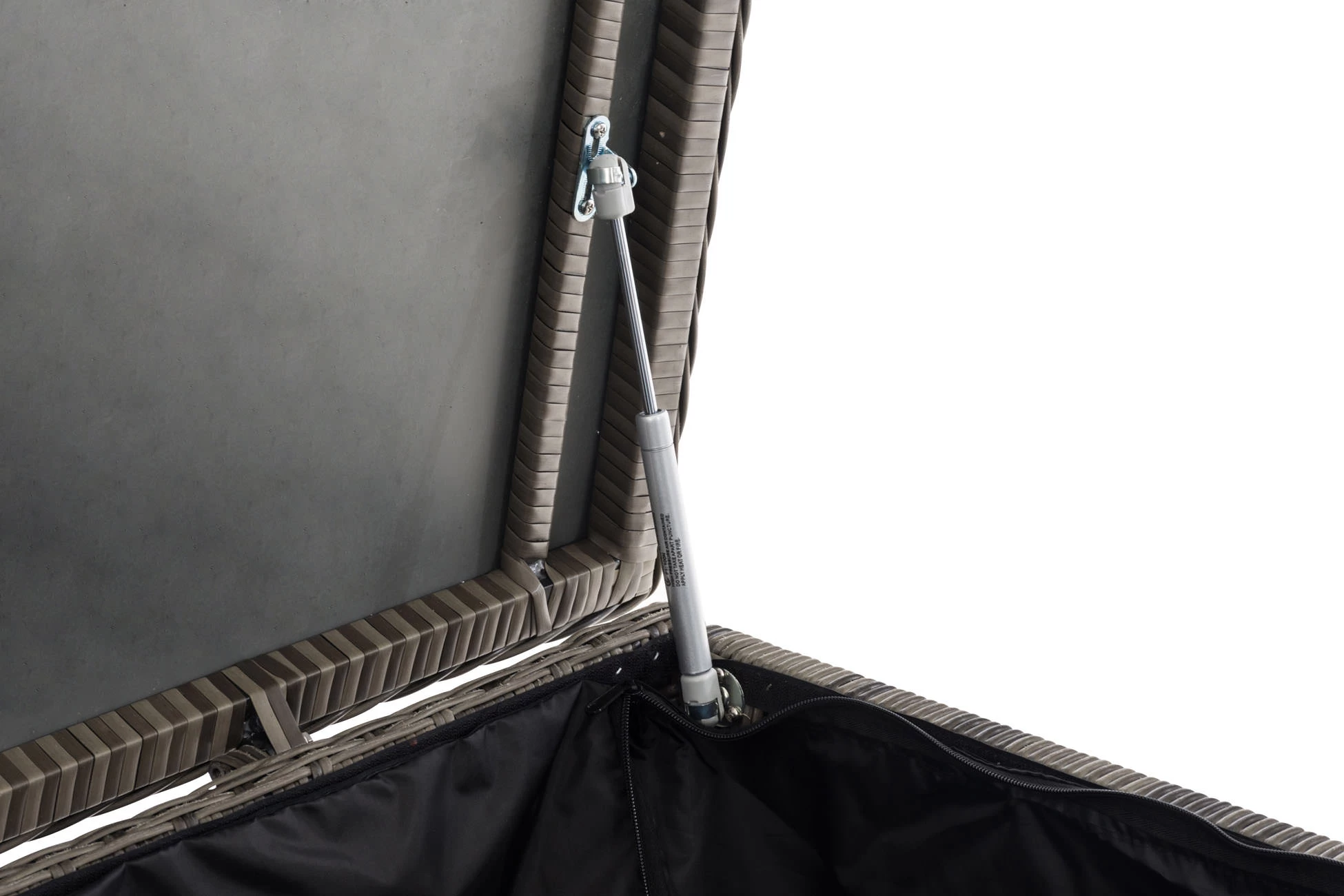 Skrzynie ogrodowa KOMFI to idealne miejsce do przechowywania poduszek mebli ogrodowych. W skrzyni znajduje się osłona przeciwdeszczowa z zamkiem błyskawicznym zapewniająca suchość poduszek ze wszystkich stron. Pokrowiec przeciwdeszczowy można łatwo przymocować i zdjąć za pomocą rzepu. Skrzynia otwierana jest od góry za pomocą pokrywy wyposażonej w 2 amortyzatory gazowe.