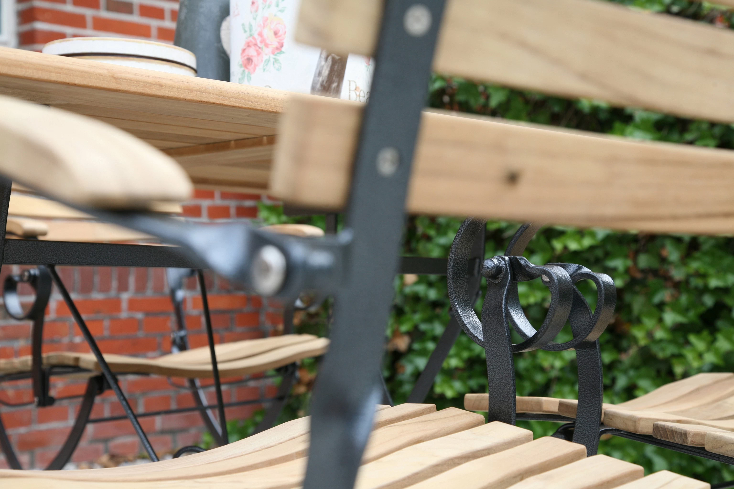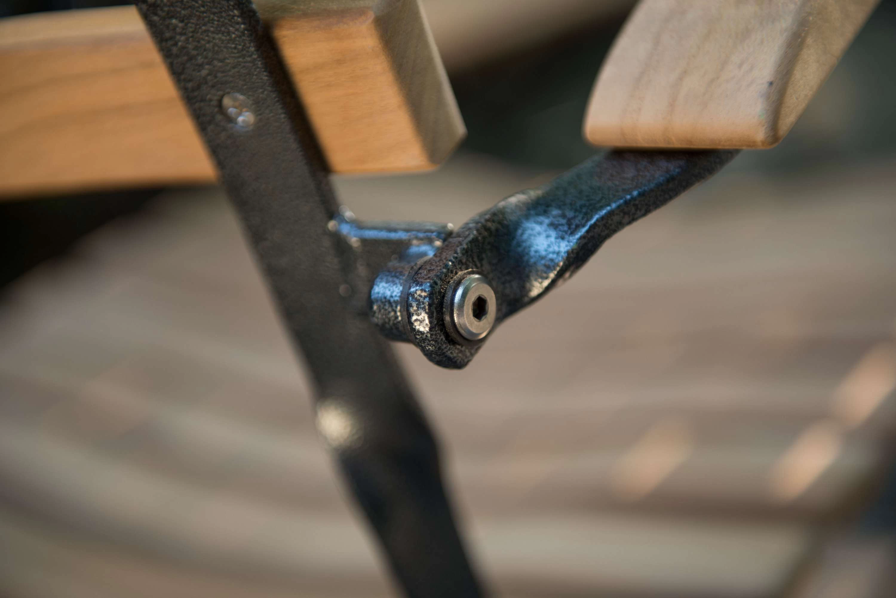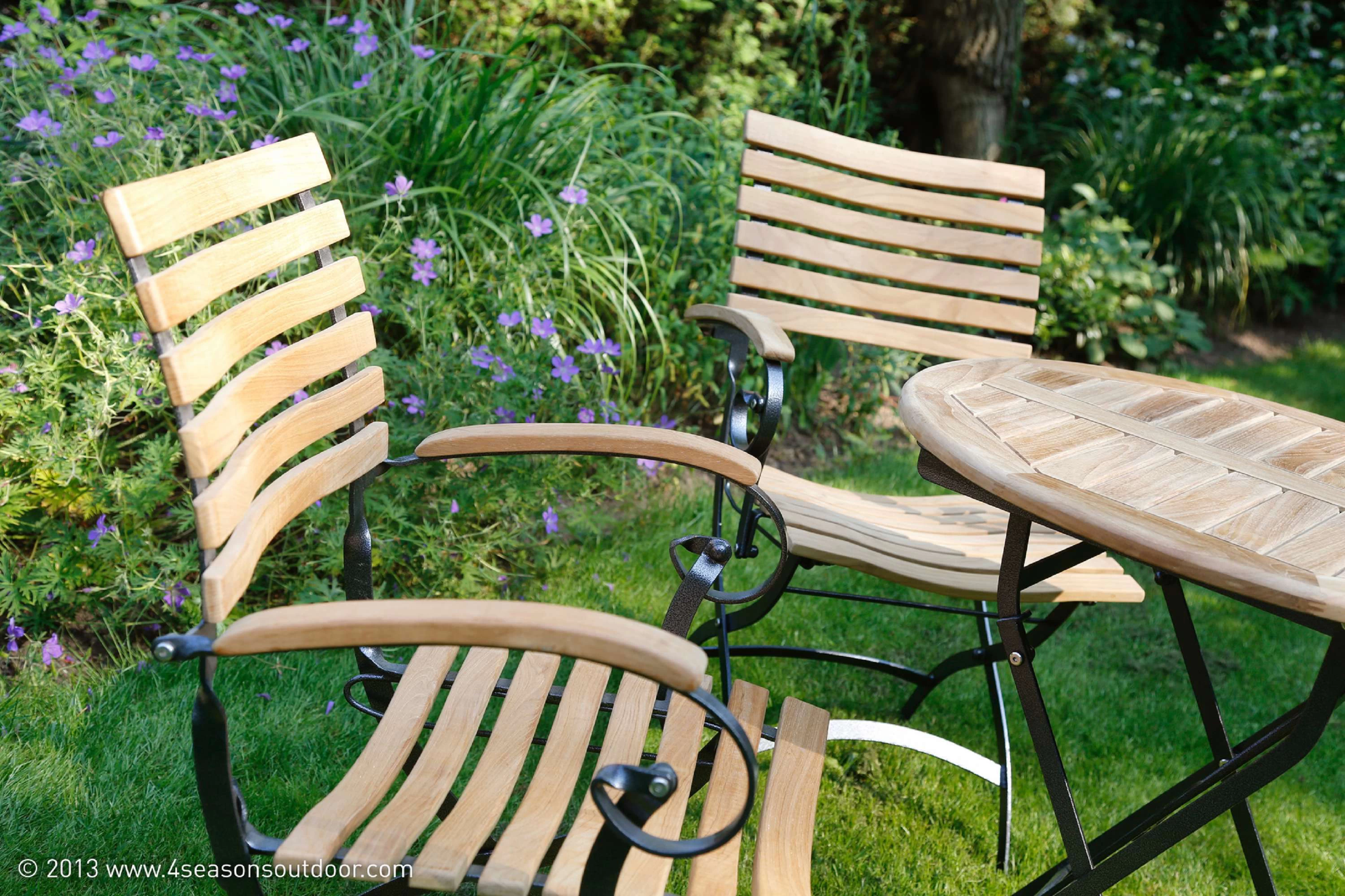 Elegancki klasyczny składany fotel retro z ergonomicznymi łukami siedzisk wykonanymi z drewna teak.