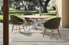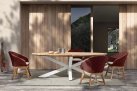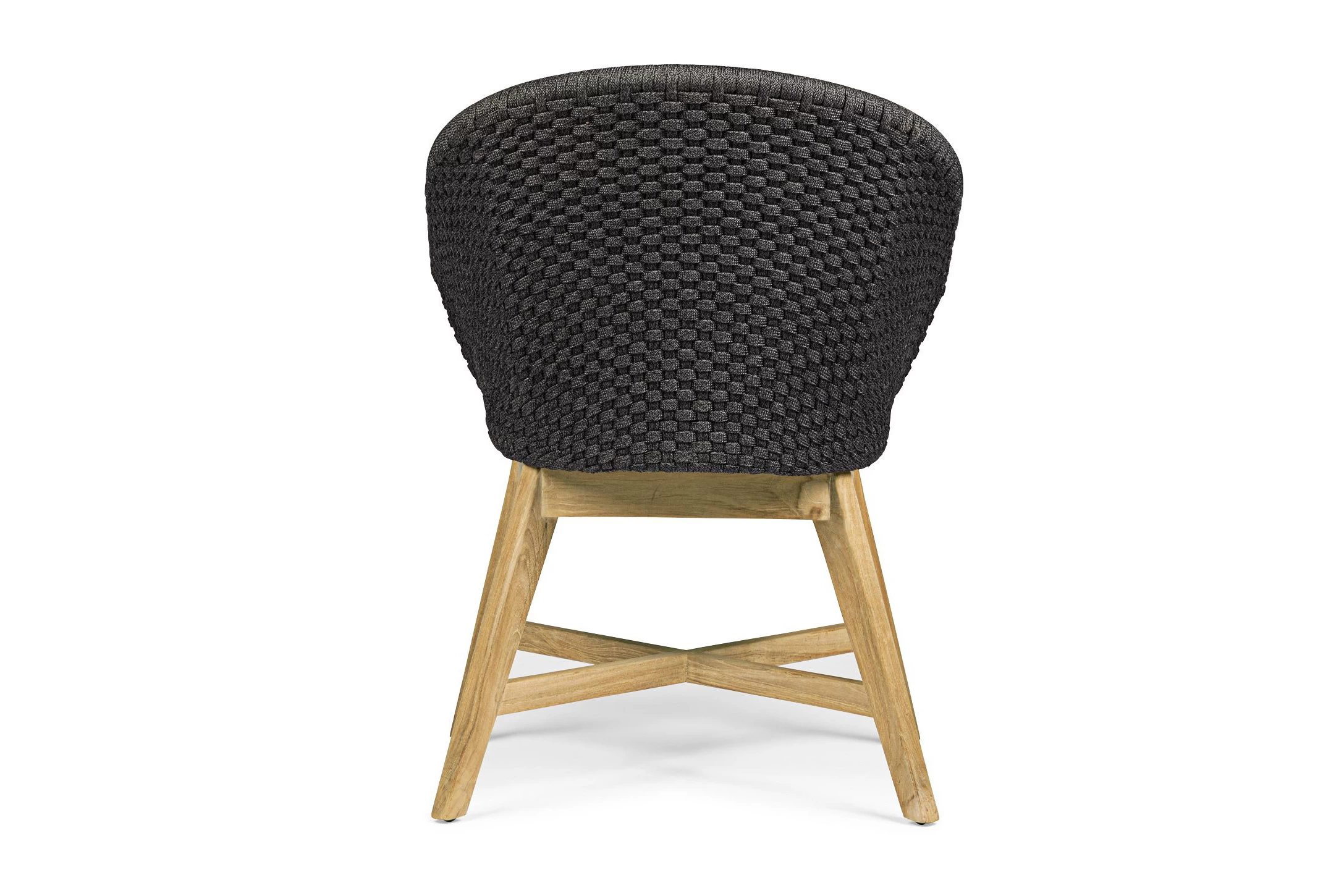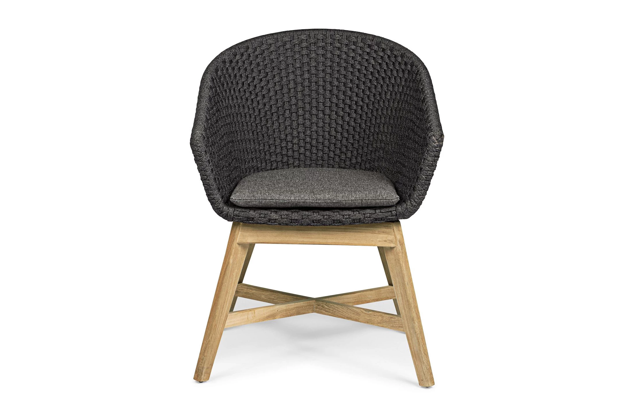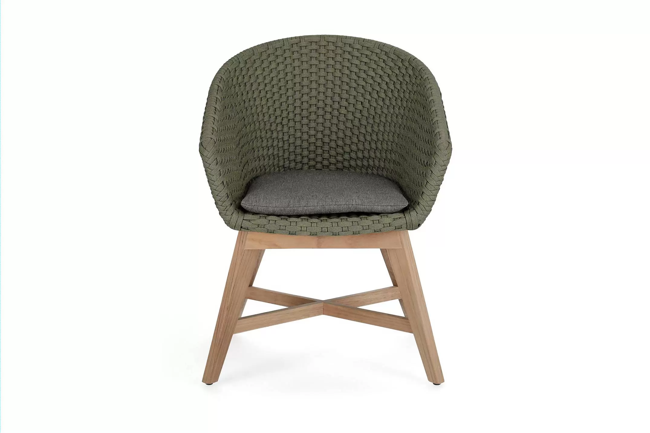 Krzesło stołowe ogrodowe nowoczesne z podstawą z drewna teak i siedziskami wyplatanymi lina polipropylenową. W komplecie poduszka.