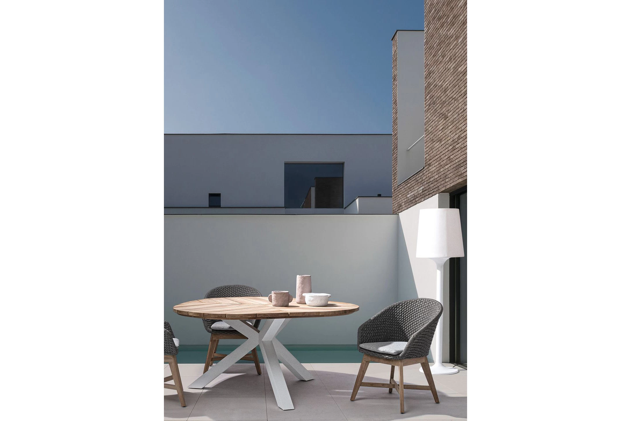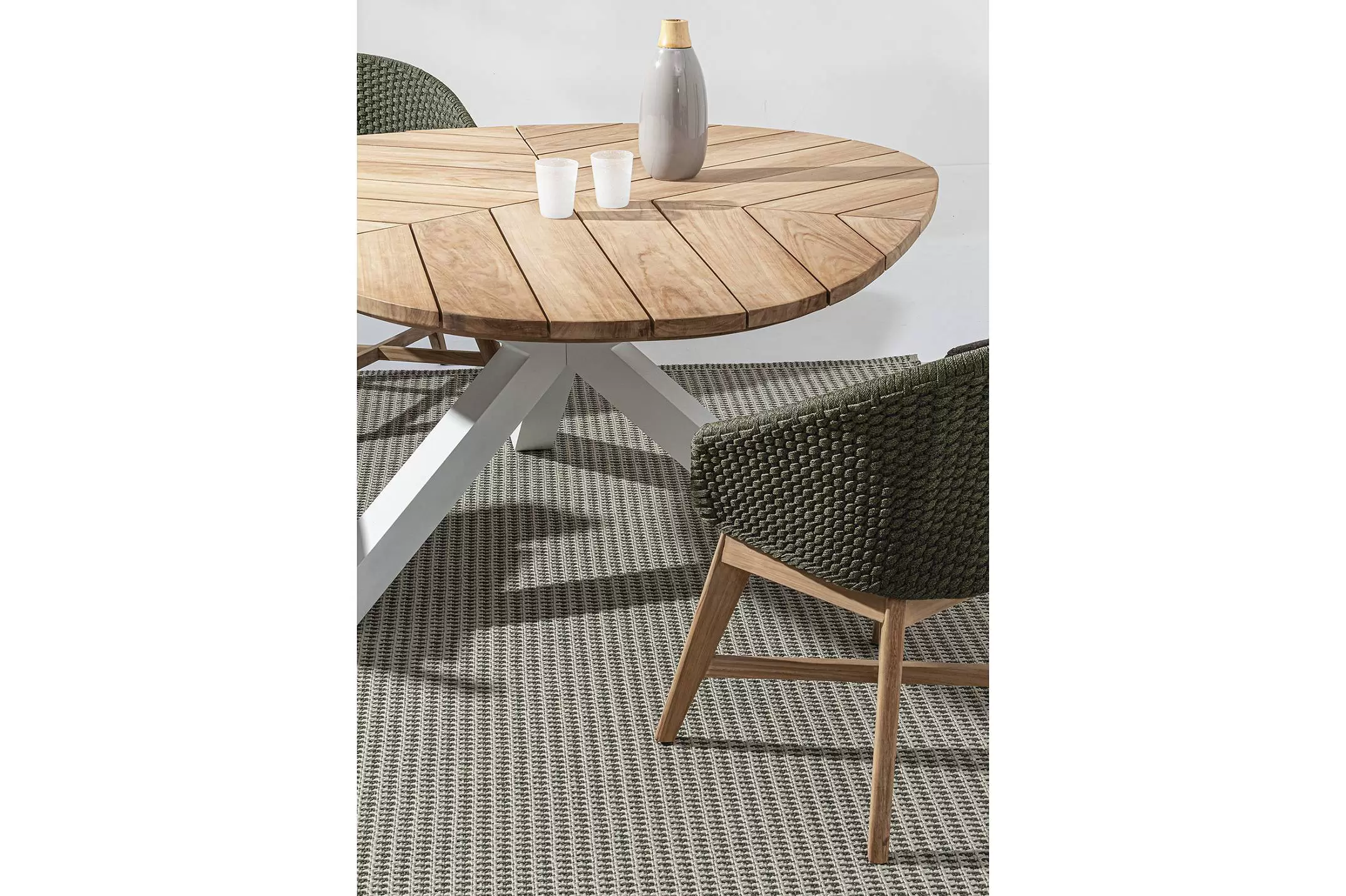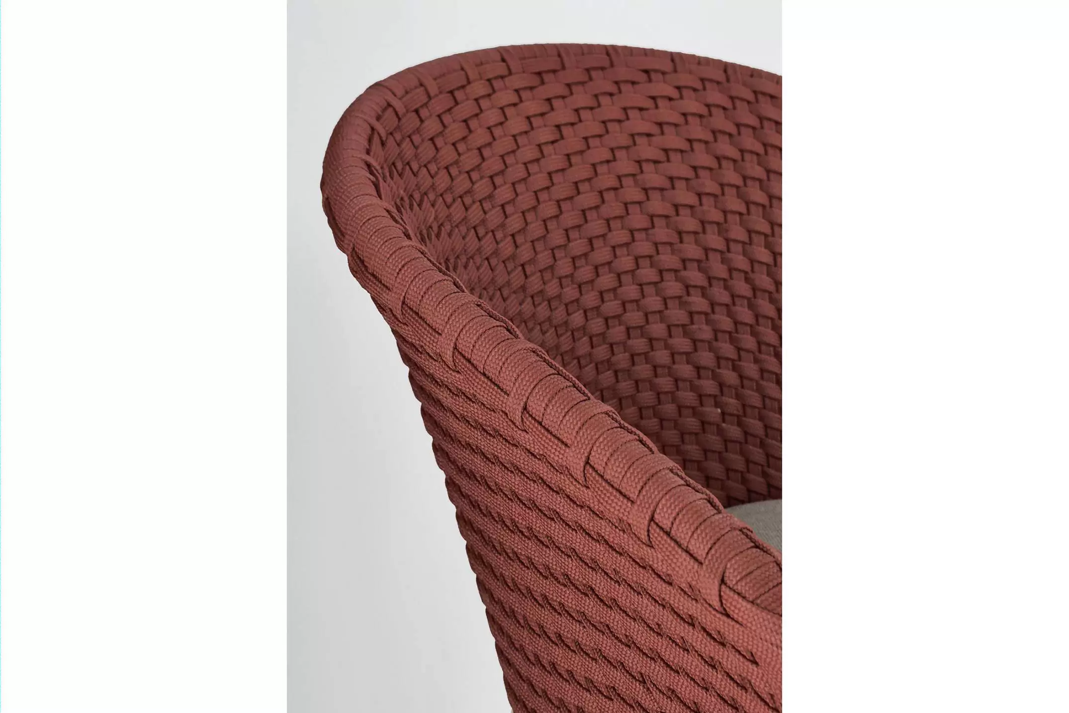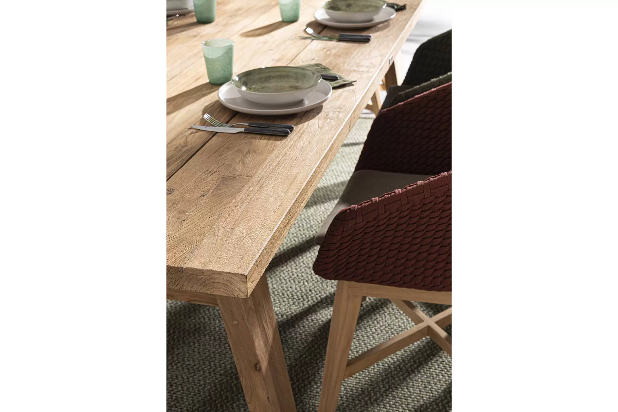 Krzesło stołowe ogrodowe nowoczesne z podstawą z drewna teak i siedziskami wyplatanymi lina polipropylenową. W komplecie poduszka.