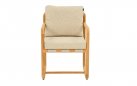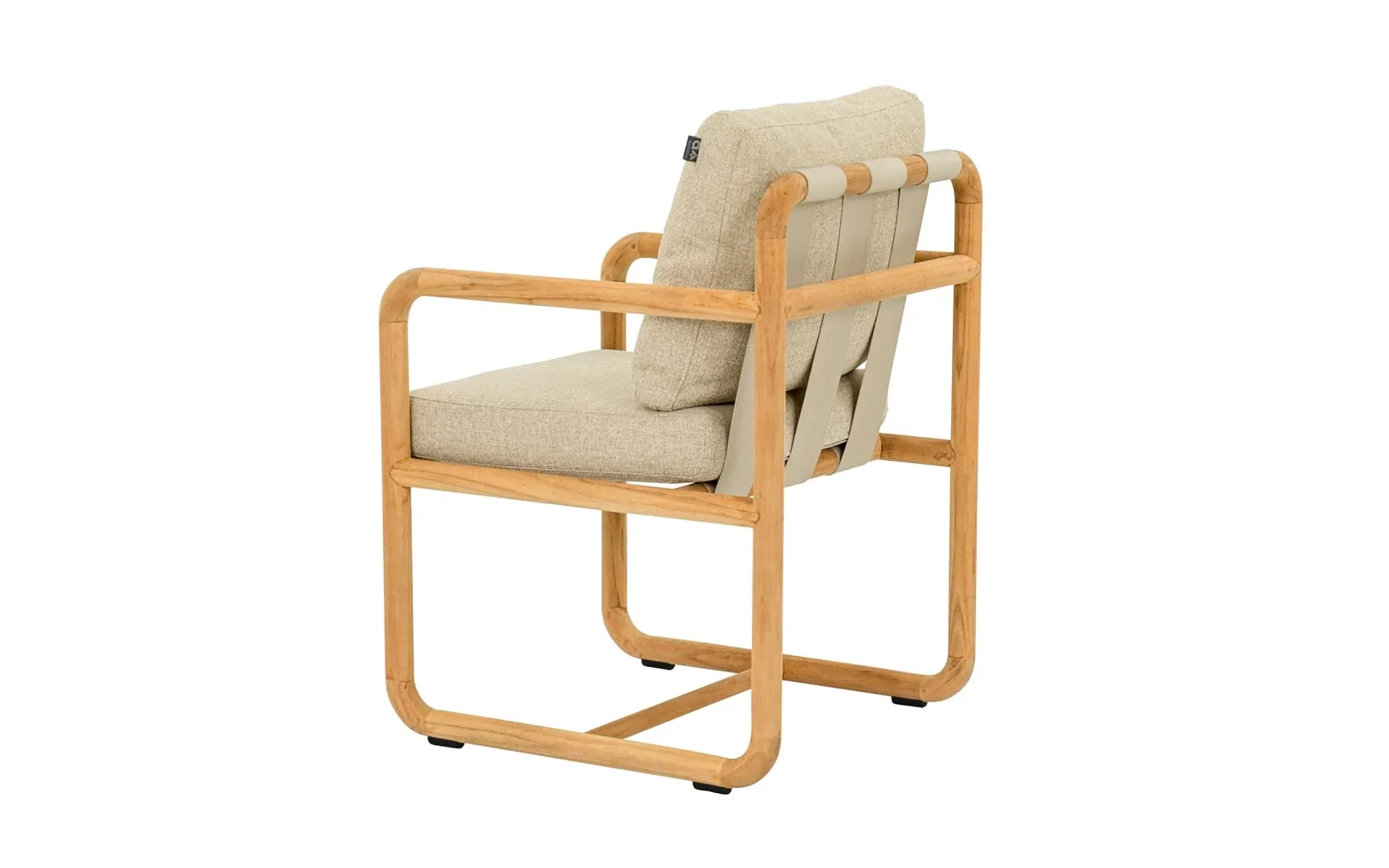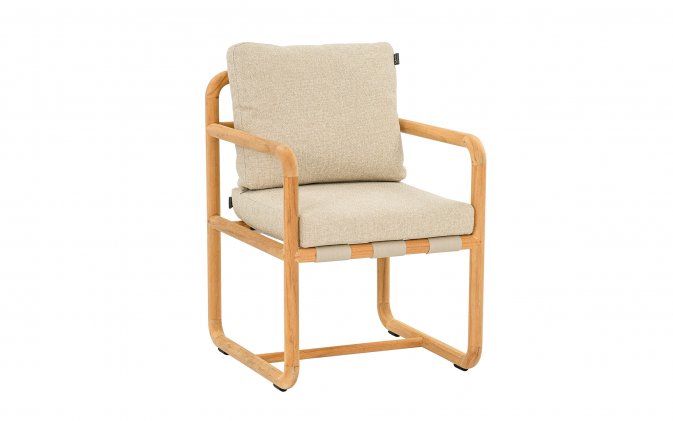 Krzesło ogrodowe DOLCE to elegancki mebel jadalniany z naturalnego drewna teak, inspirowany estetyką lat 70. Zaokrąglone profile, widoczne pasy podtrzymujące poduszkę i miękkie linie konstrukcji tworzą harmonijną całość. Poduszka All Weather Bee Wett w kolorze jasny beż zapewnia wysoki komfort i odporność na warunki atmosferyczne. Krzesło doskonale komponuje się ze stołem DOLCE 240 × 100 cm.