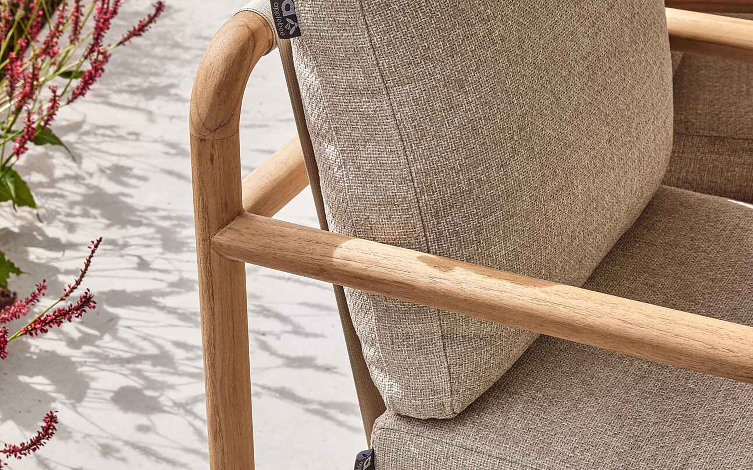 Konstrukcja z naturalnego drewna teak – odpornego na wilgoć, promieniowanie UV i zmienne warunki atmosferyczne. Teak zawiera naturalne oleje chroniące przed pleśnią i insektami. Poduszka z wypełnieniem Bee Wett – szybkoschnąca pianka o otwartej strukturze. Poszewka z tkaniny Olefin – odporna na zabrudzenia, pleśń i blaknięcie, łatwa w czyszczeniu. Wszystkie materiały przystosowane do użytku zewnętrznego przez cały sezon.