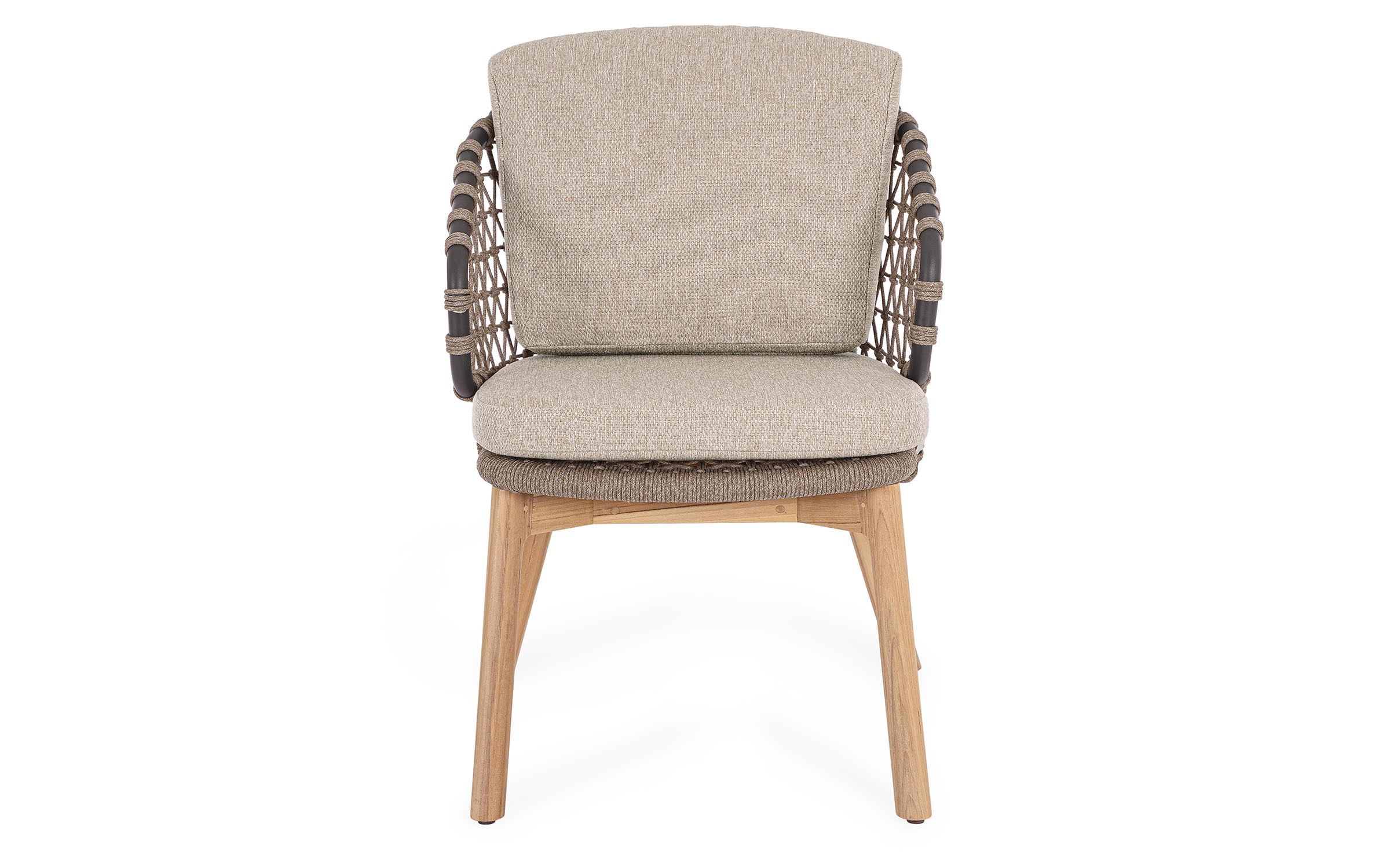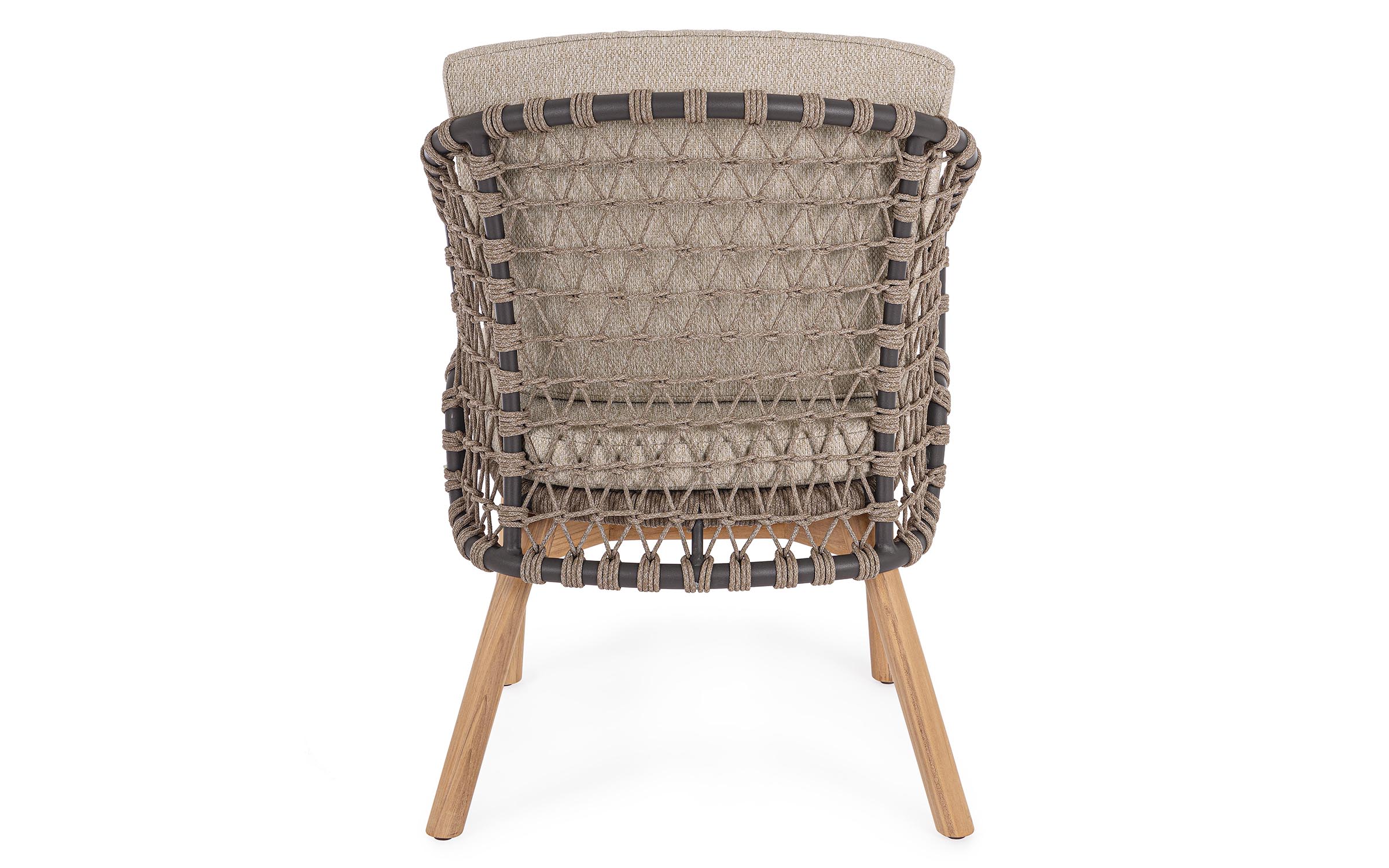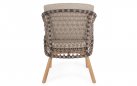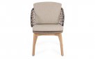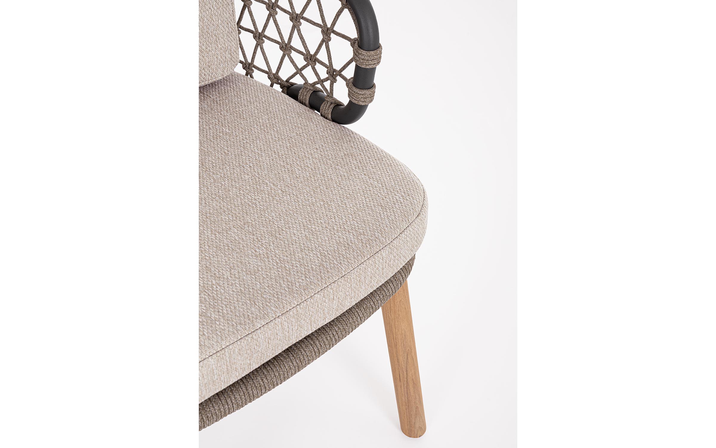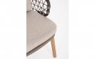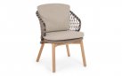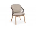 Krzesło ogrodowe z poduszką na siedzisku i oparciu na podstawie z drewna teak. Siedzisko wykonane z aluminiowej ramy w grafitowym kolorze oplecionej sznurkiem polipropylenowym.