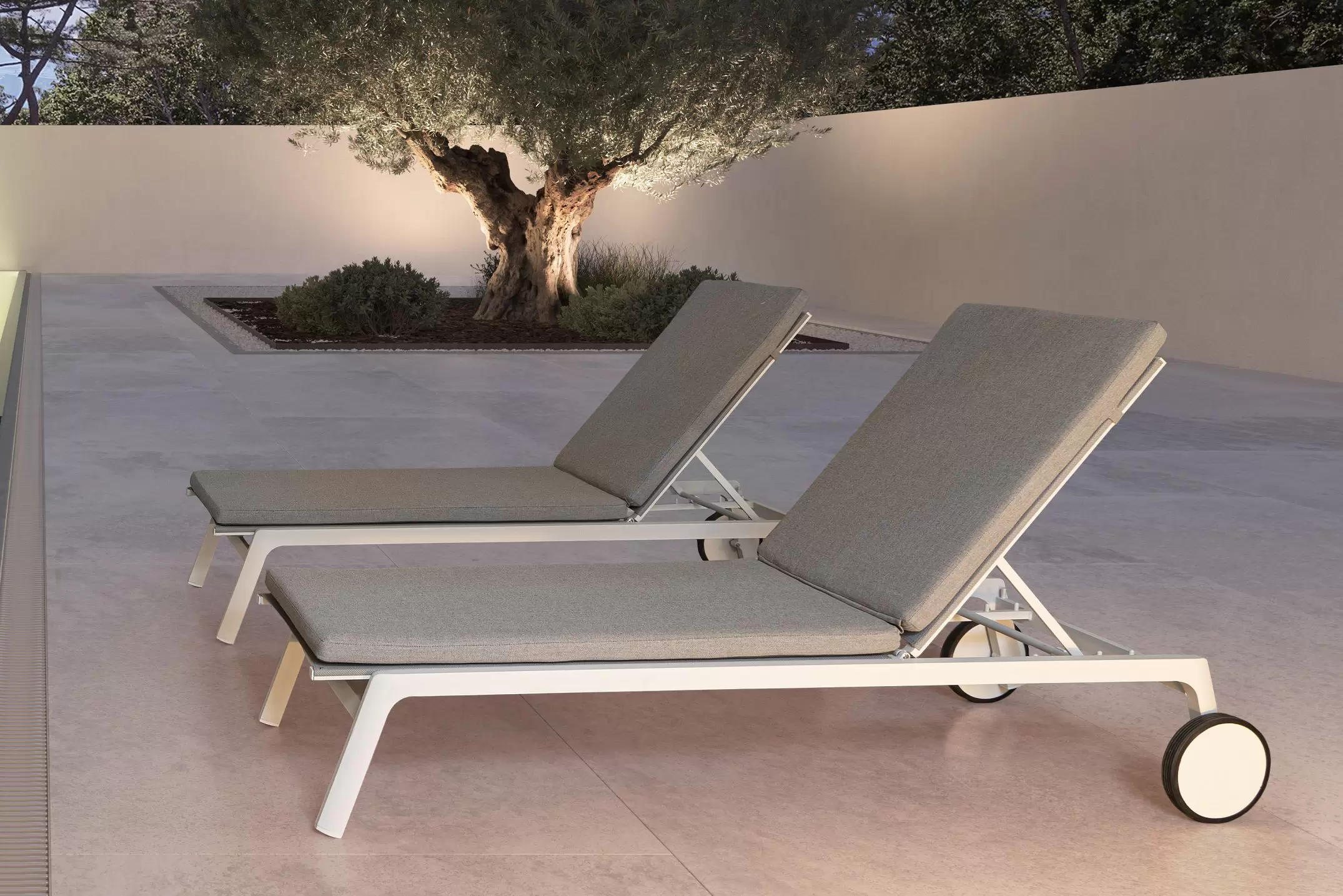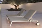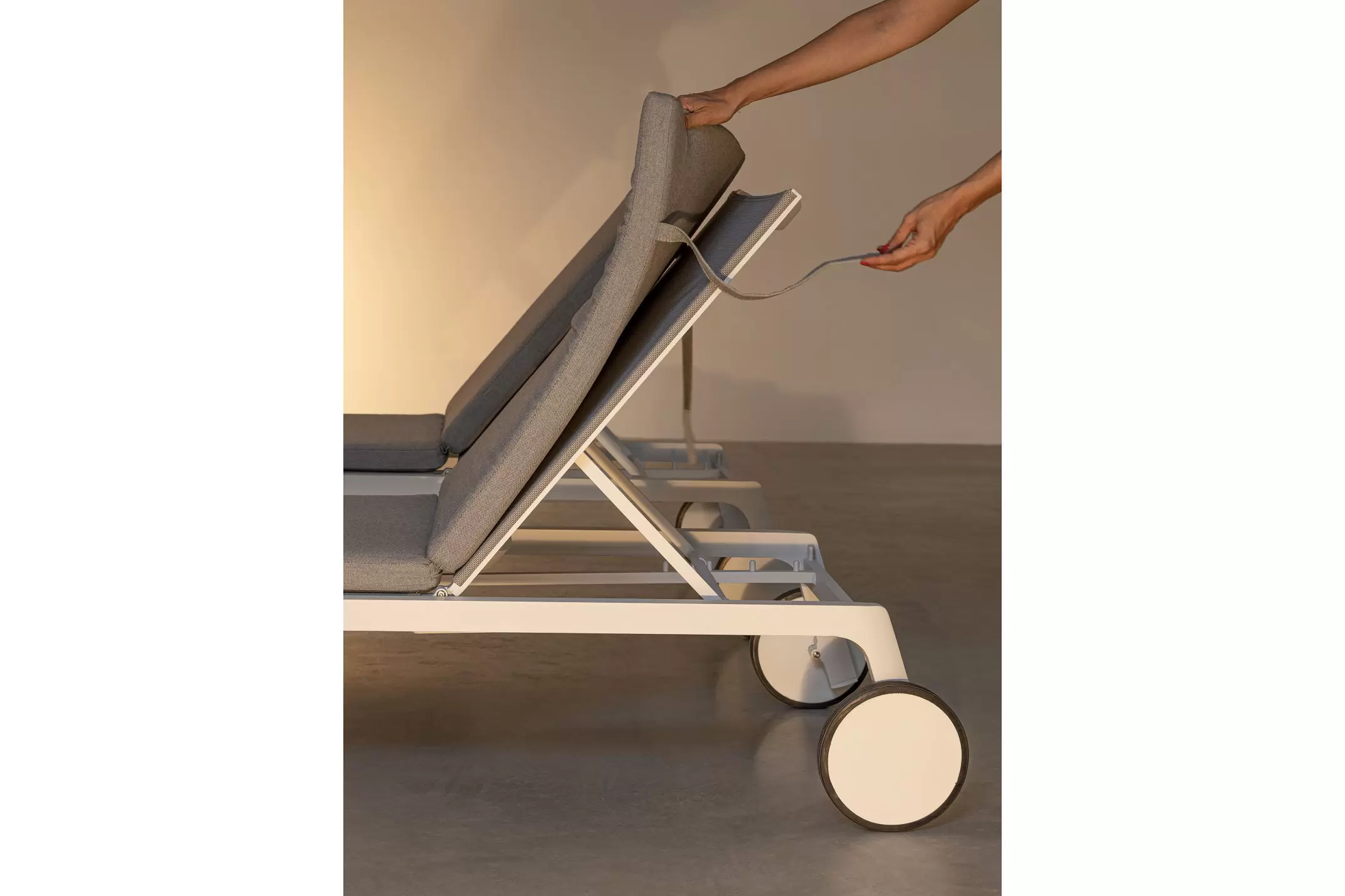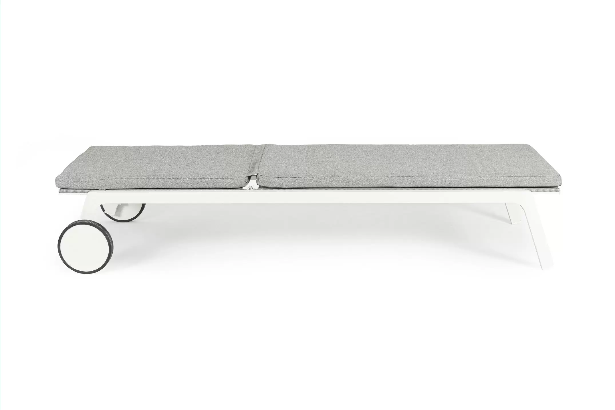 Aluminiowy leżak na taras z materacem z przeznaczeniem do użytku na zewnątrz lub w patio. Lekka konstrukcja, kółka dla łatwiejszego przemieszczania oraz wysokie siedzisko to zalety tego modelu.
