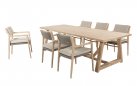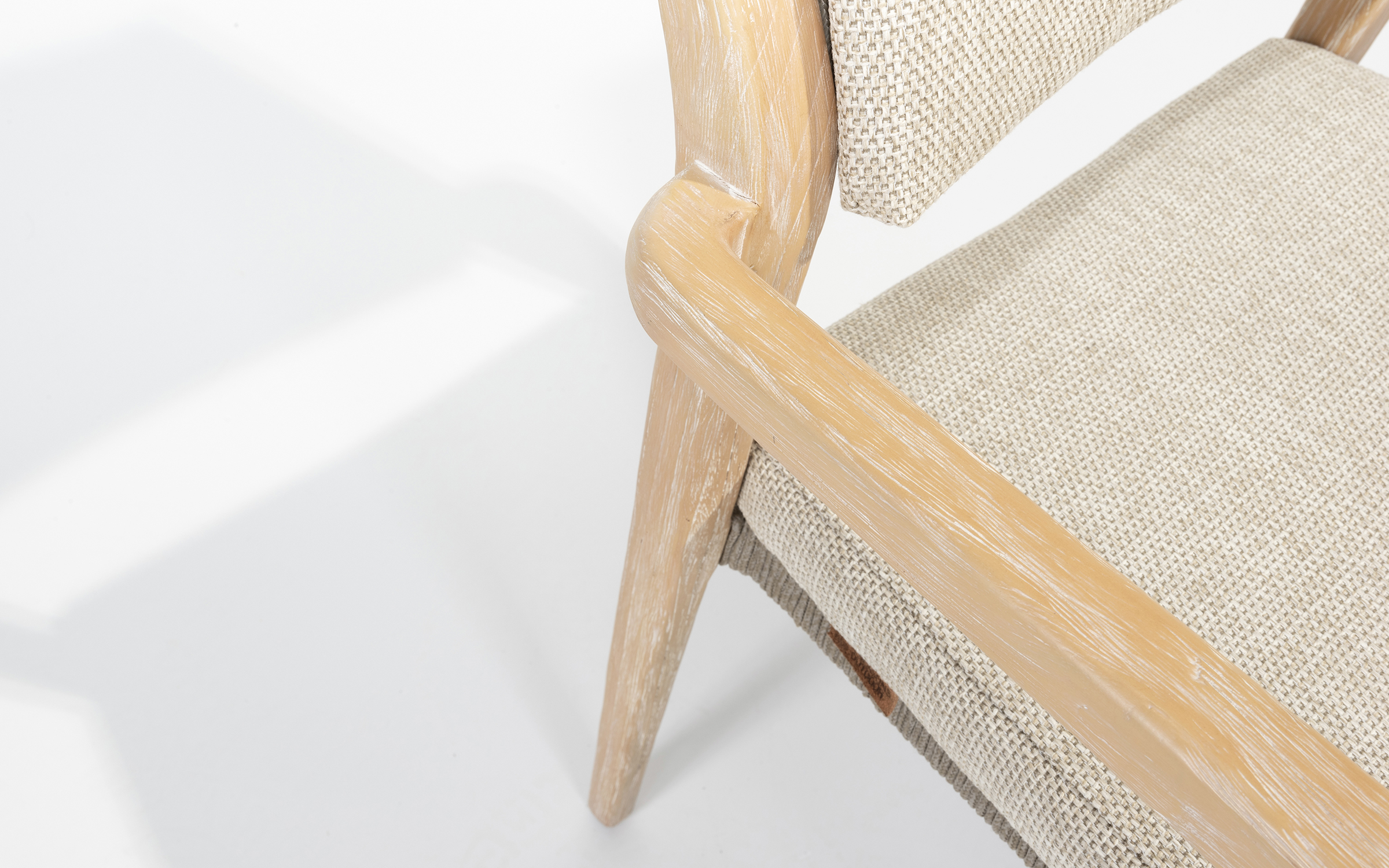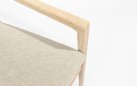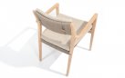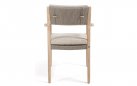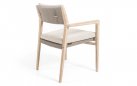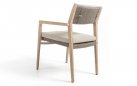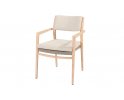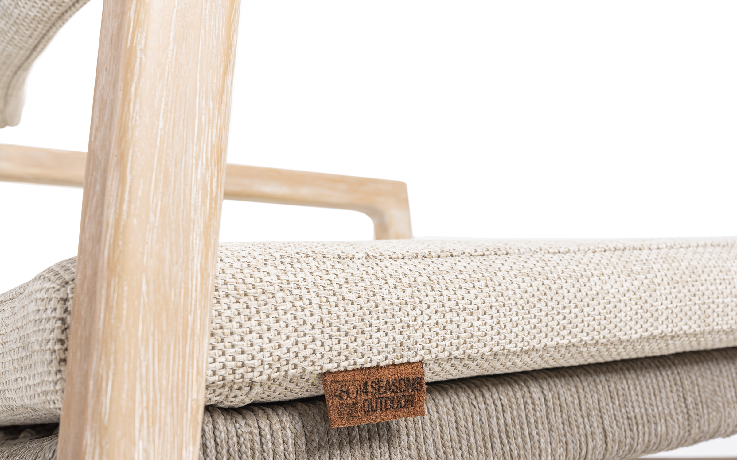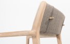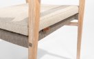 Krzesło jest wyposażone w poduszki i piękną, wysokiej jakości ramę z drewna tekowego.