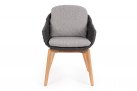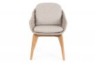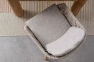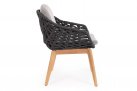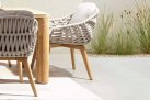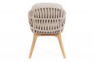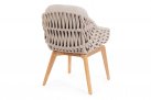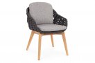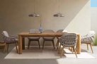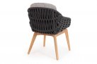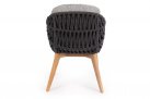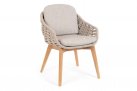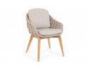 Krzesło stołowe do ogrodowej jadalni z kolekcji TAMIRES. Podstawa z drewna teak. Oparcie o konstrukcji aluminiowej z plecionką z liny polipropylenowej. Poduszki szybkoschnące z poszewkami z materiału Olefin.