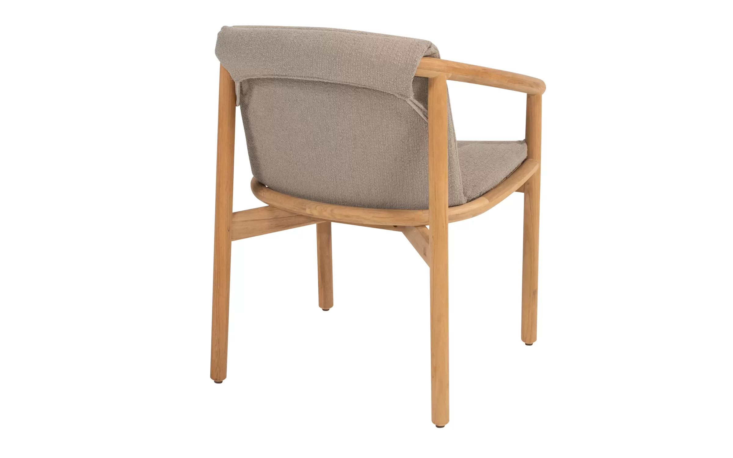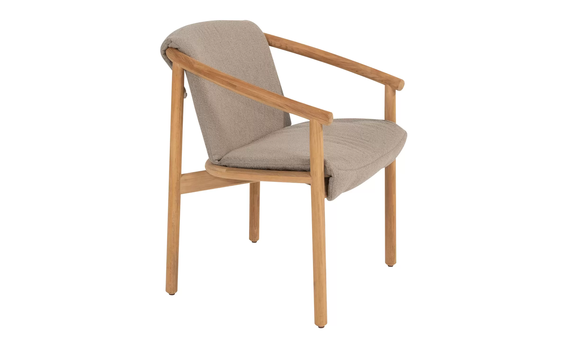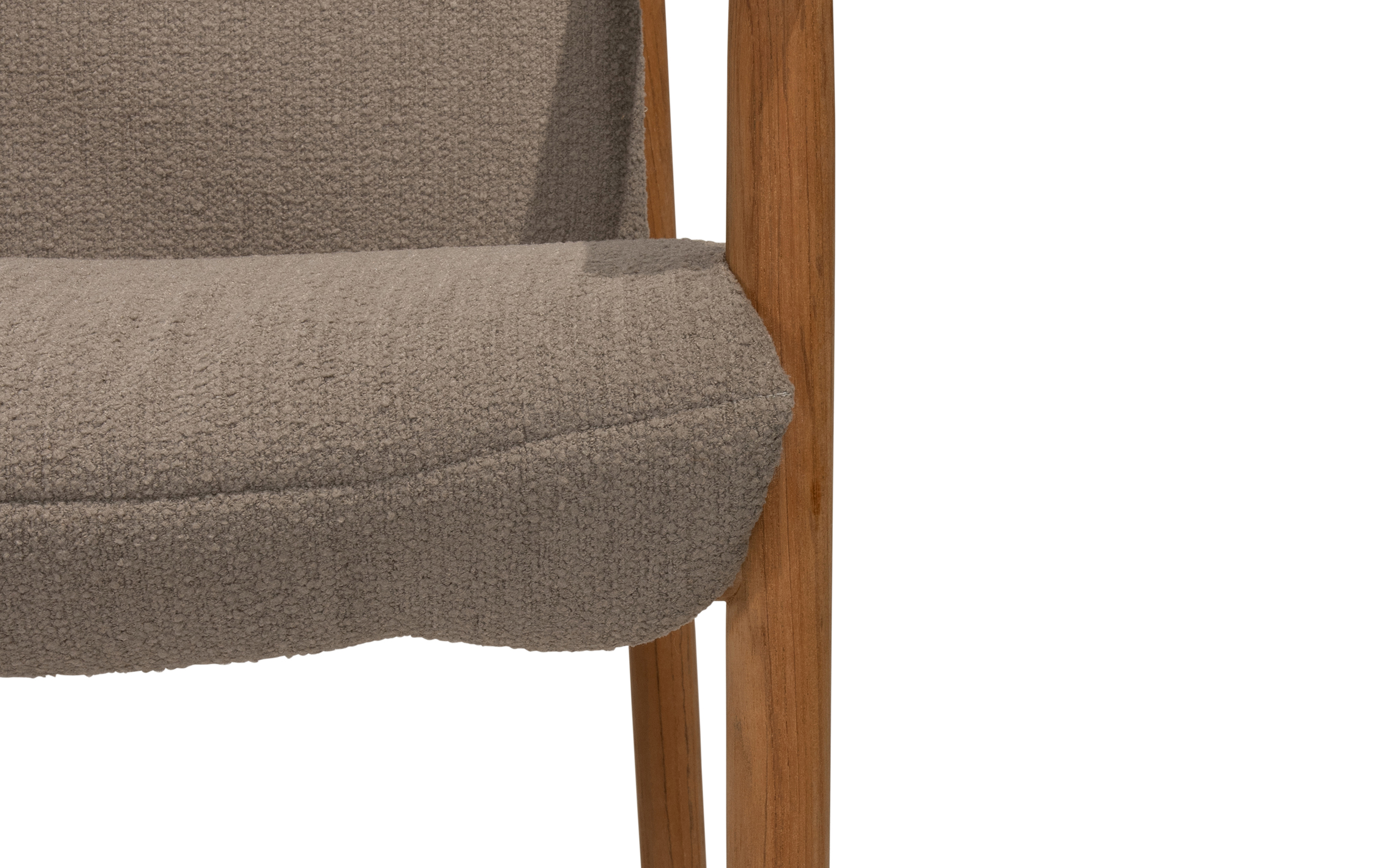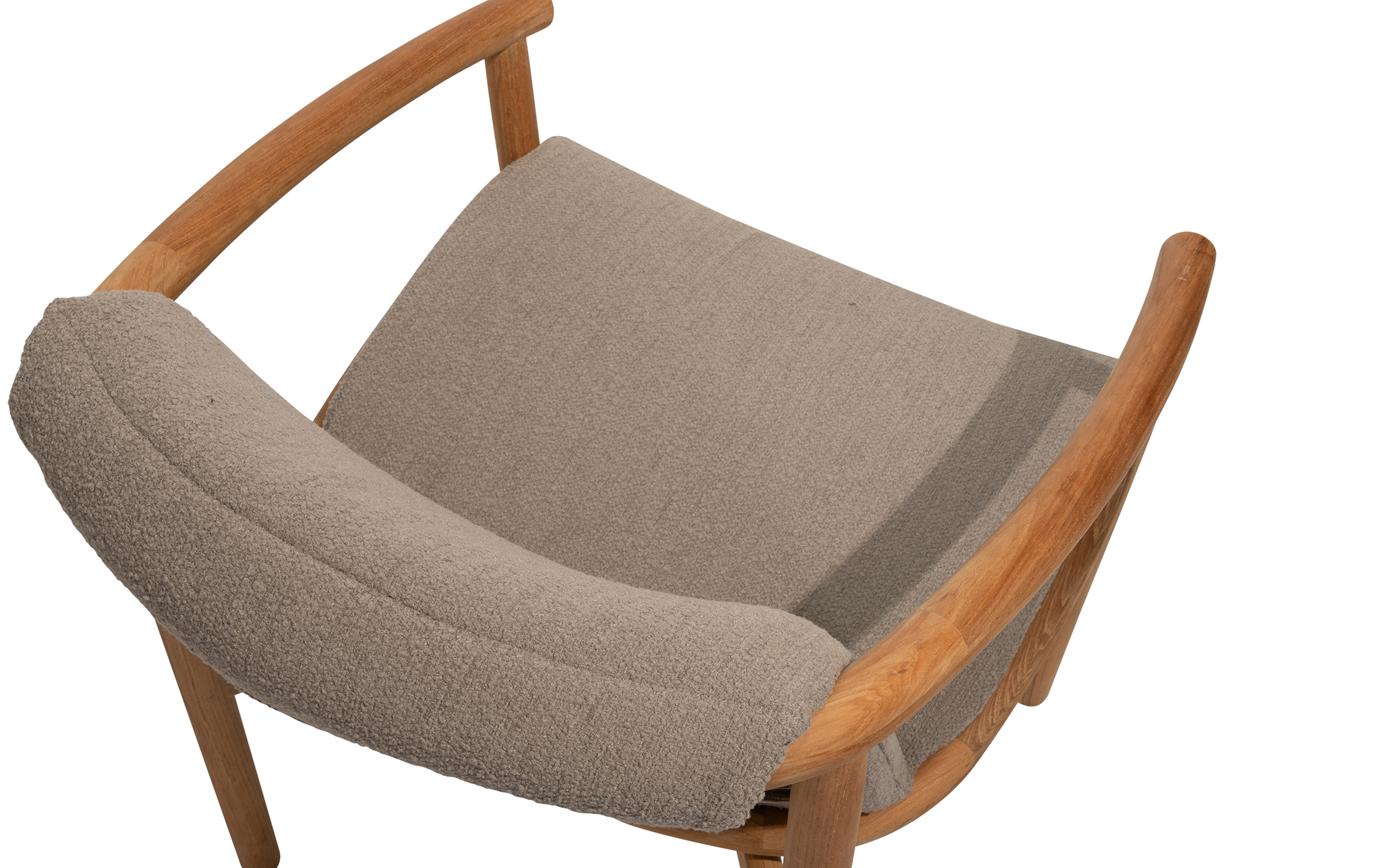 Tkanina w kolorze taupe pięknie łączy się z ciepłym drewnem tekowym. Ergonomiczna konstrukcja krzesła Tess zapewnia optymalny komfort siedzenia. W tym luksusowym fotelu możesz relaksować się godzinami.