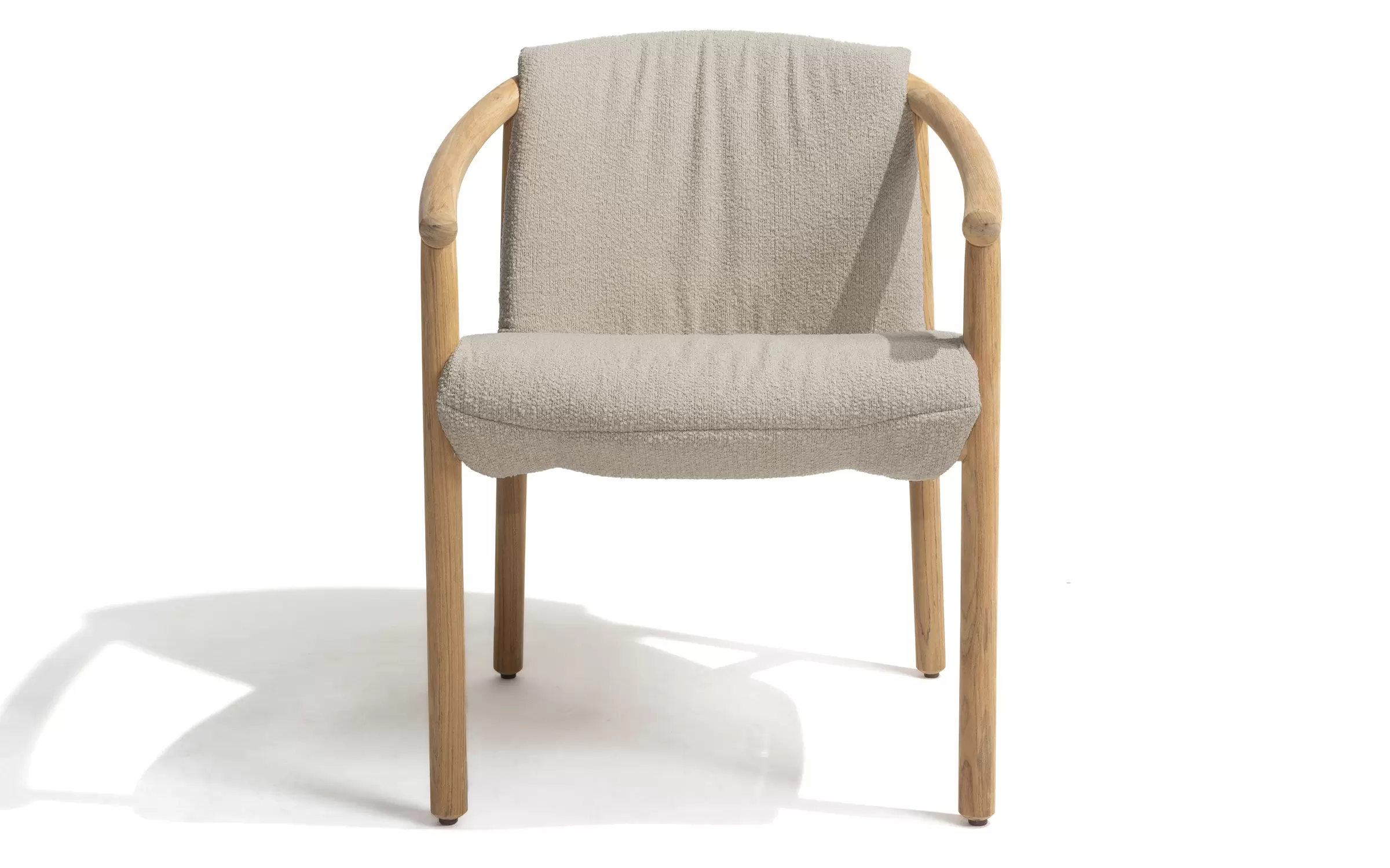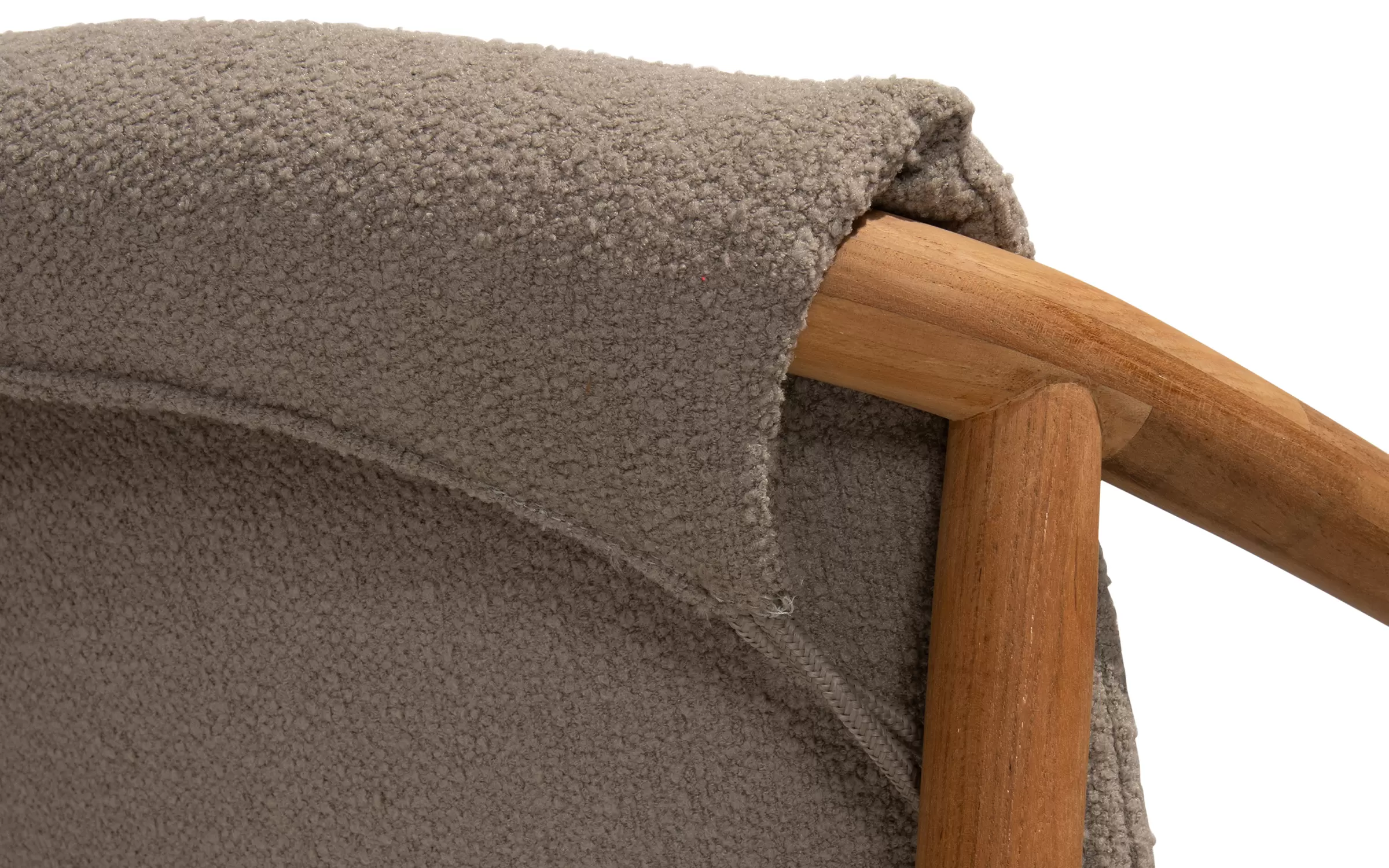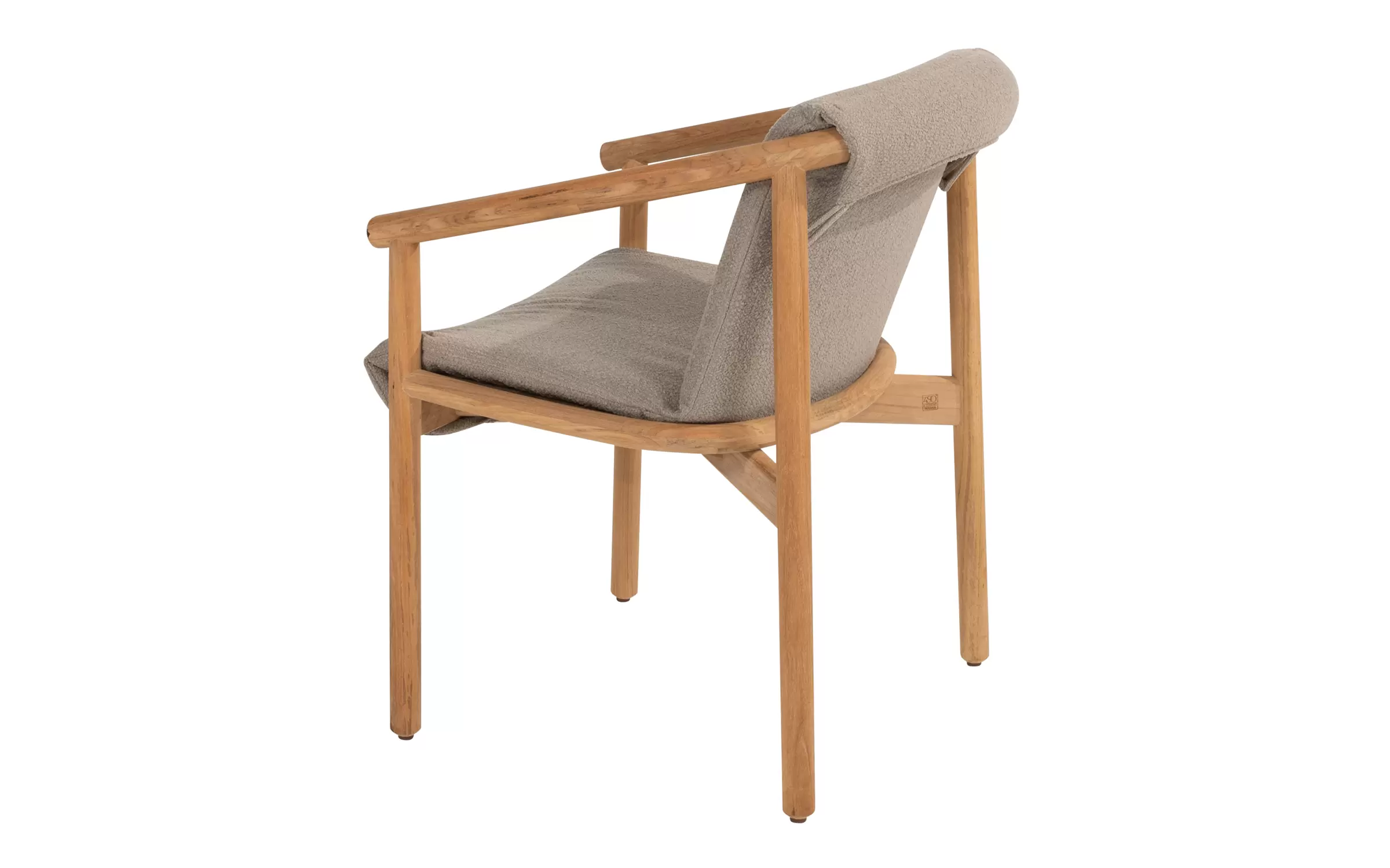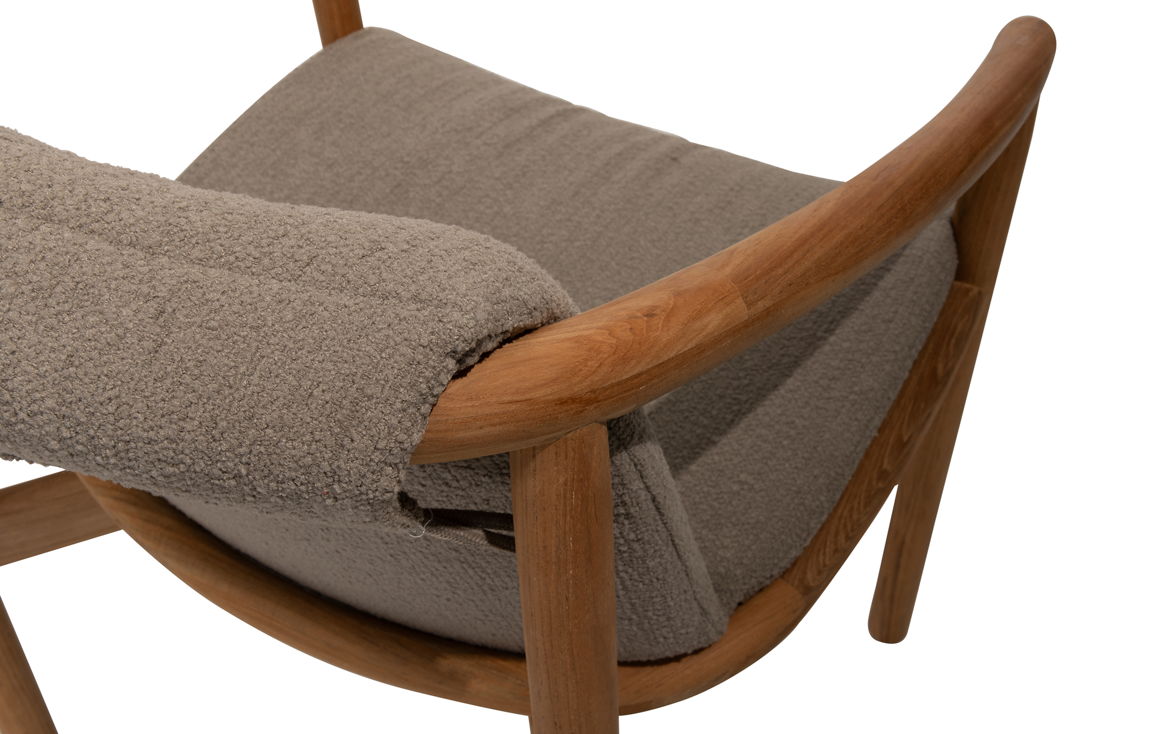 Tkanina w kolorze taupe pięknie łączy się z ciepłym drewnem tekowym. Ergonomiczna konstrukcja krzesła Tess zapewnia optymalny komfort siedzenia. W tym luksusowym fotelu możesz relaksować się godzinami.
