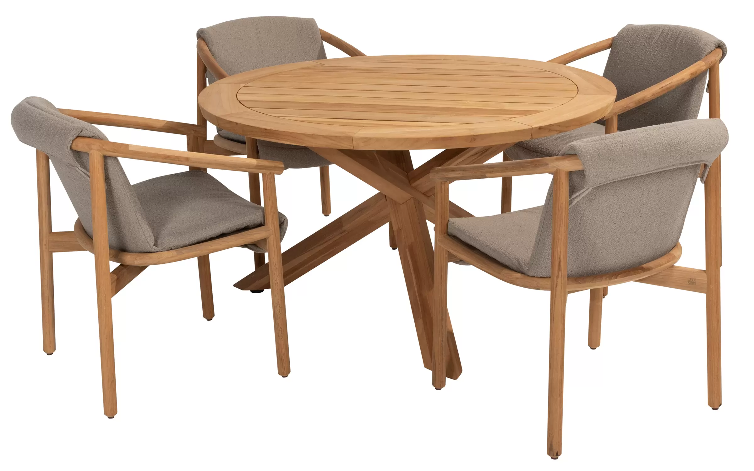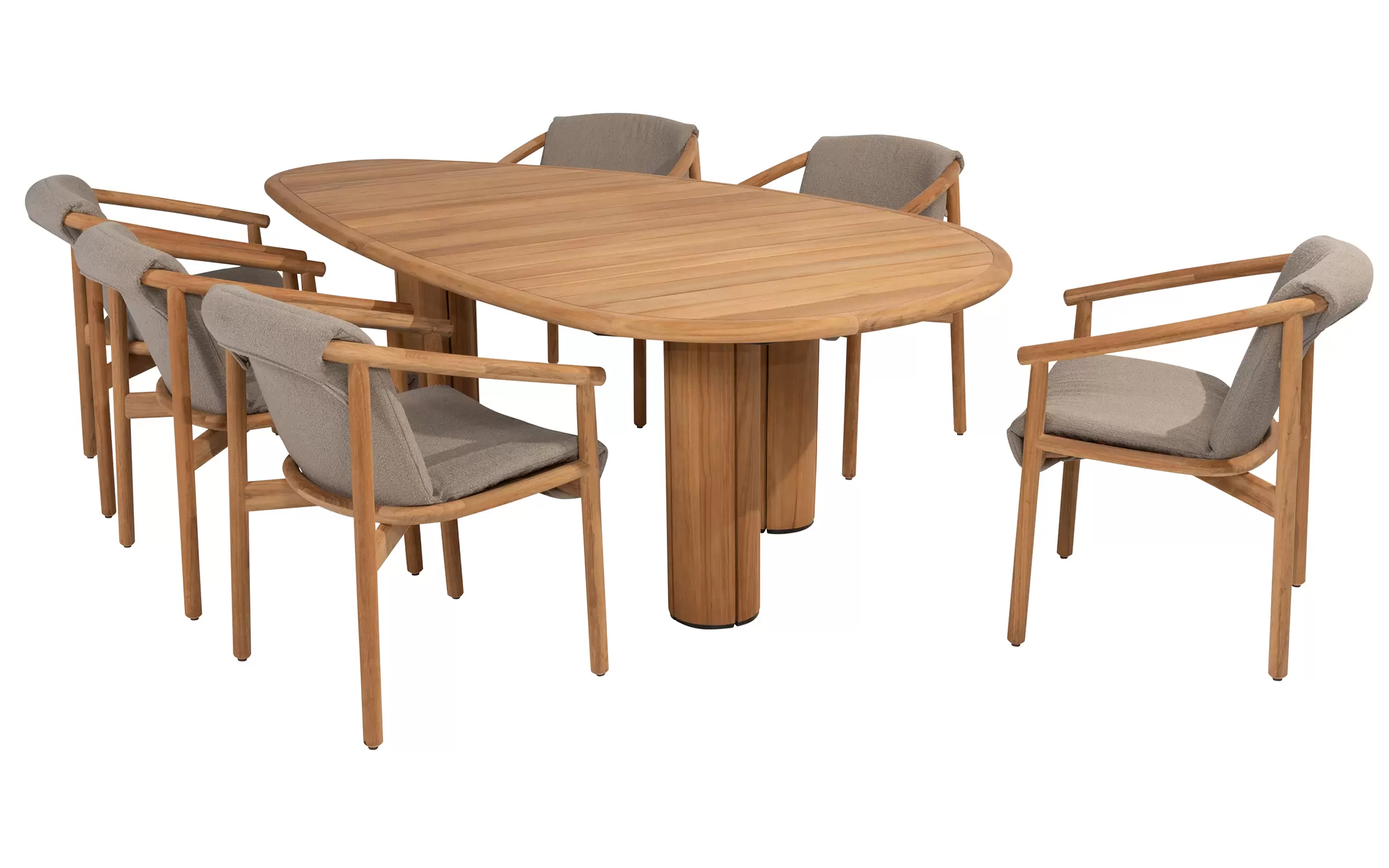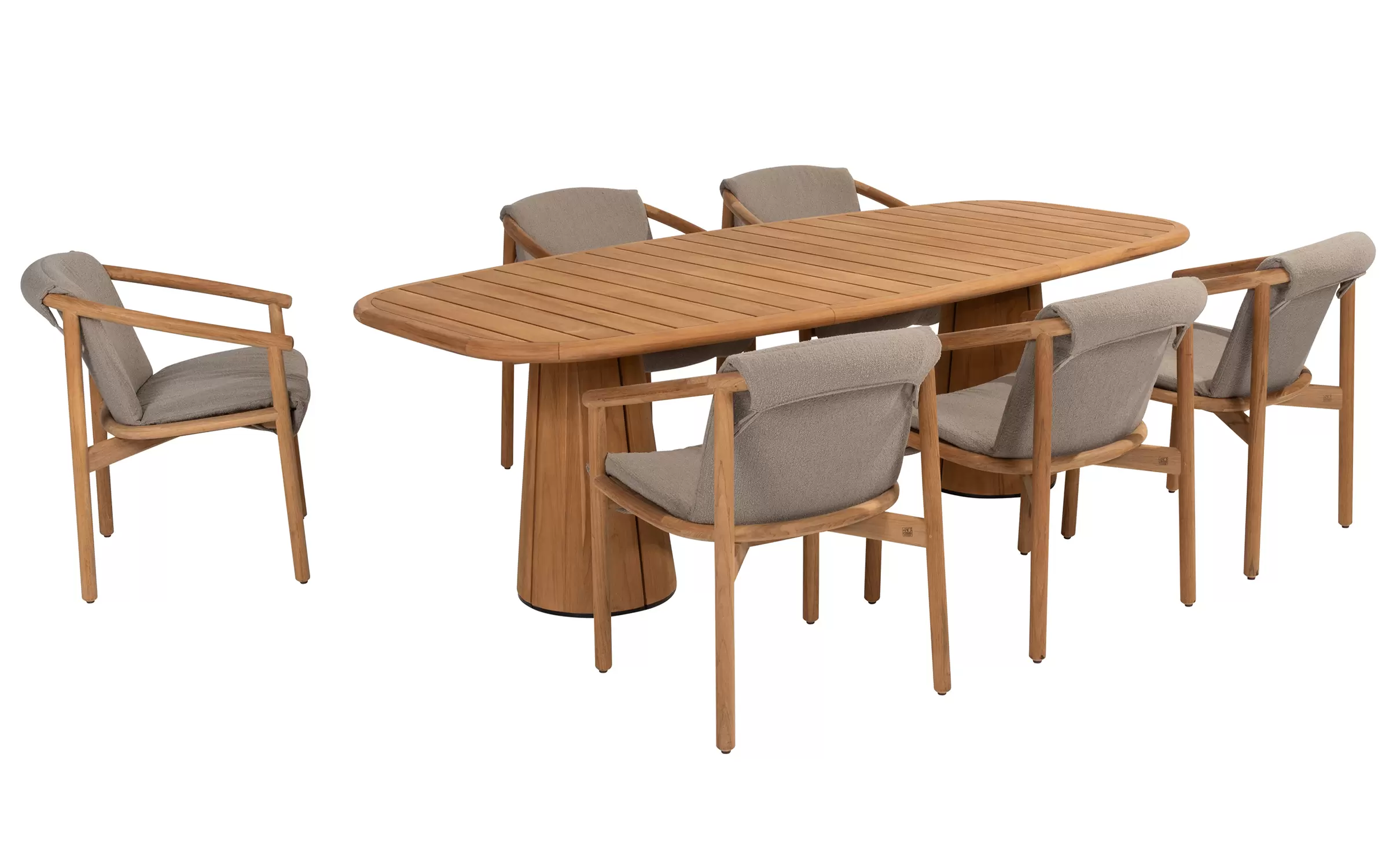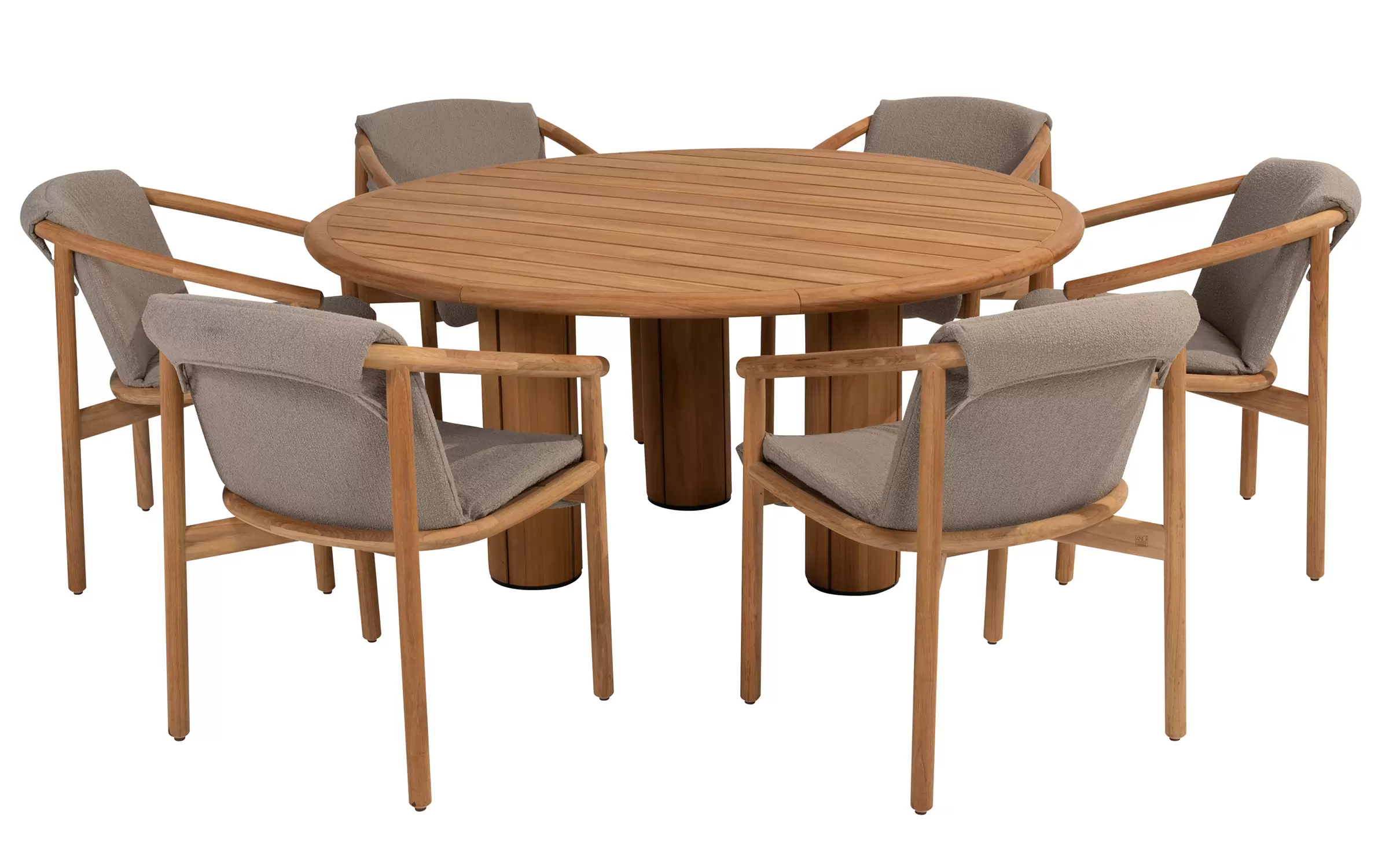 Tkanina w kolorze taupe pięknie łączy się z ciepłym drewnem tekowym. Ergonomiczna konstrukcja krzesła Tess zapewnia optymalny komfort siedzenia. W tym luksusowym fotelu możesz relaksować się godzinami.