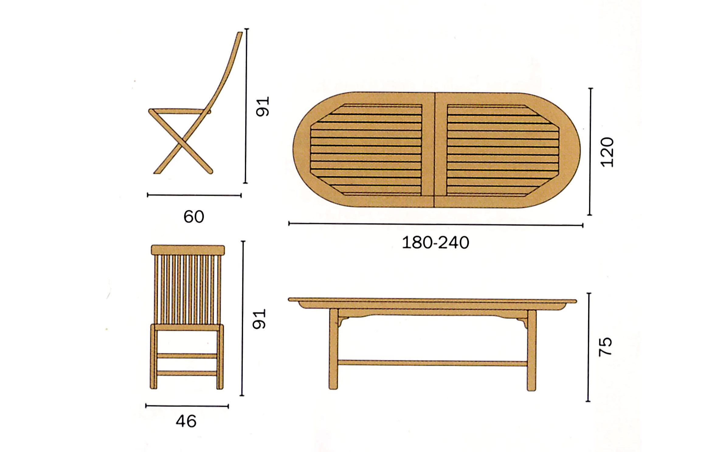 Wykonany z naturalnego drewna teak, odpornego na warunki atmosferyczne, wilgoć i promieniowanie UV. Drewno egzotyczne o wysokiej trwałości i eleganckim wyglądzie. Zalecana regularna konserwacja olejem teakowym.