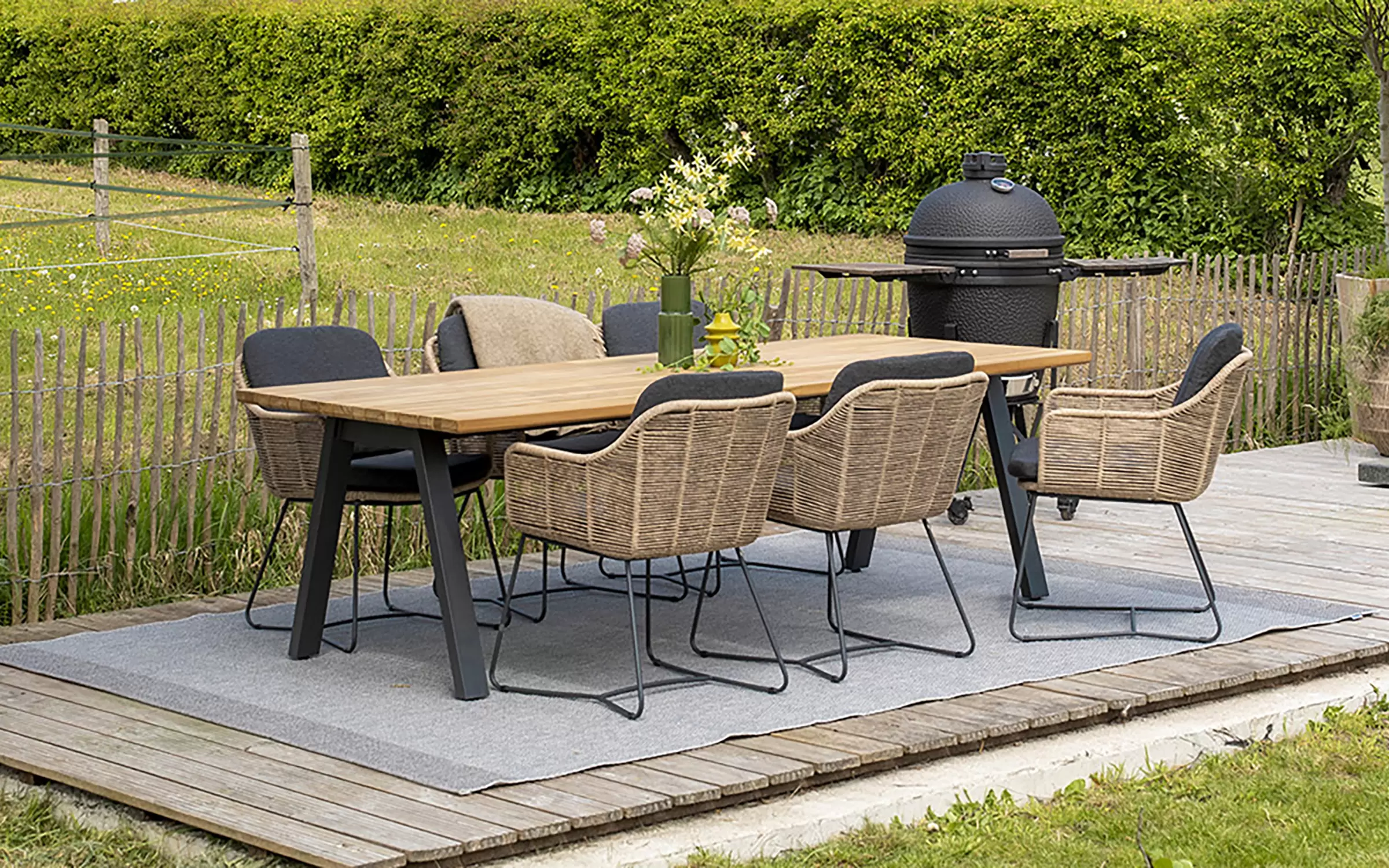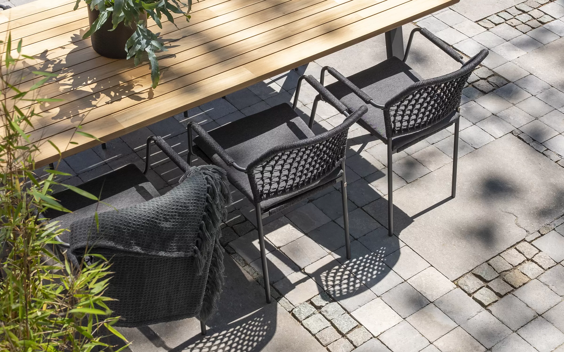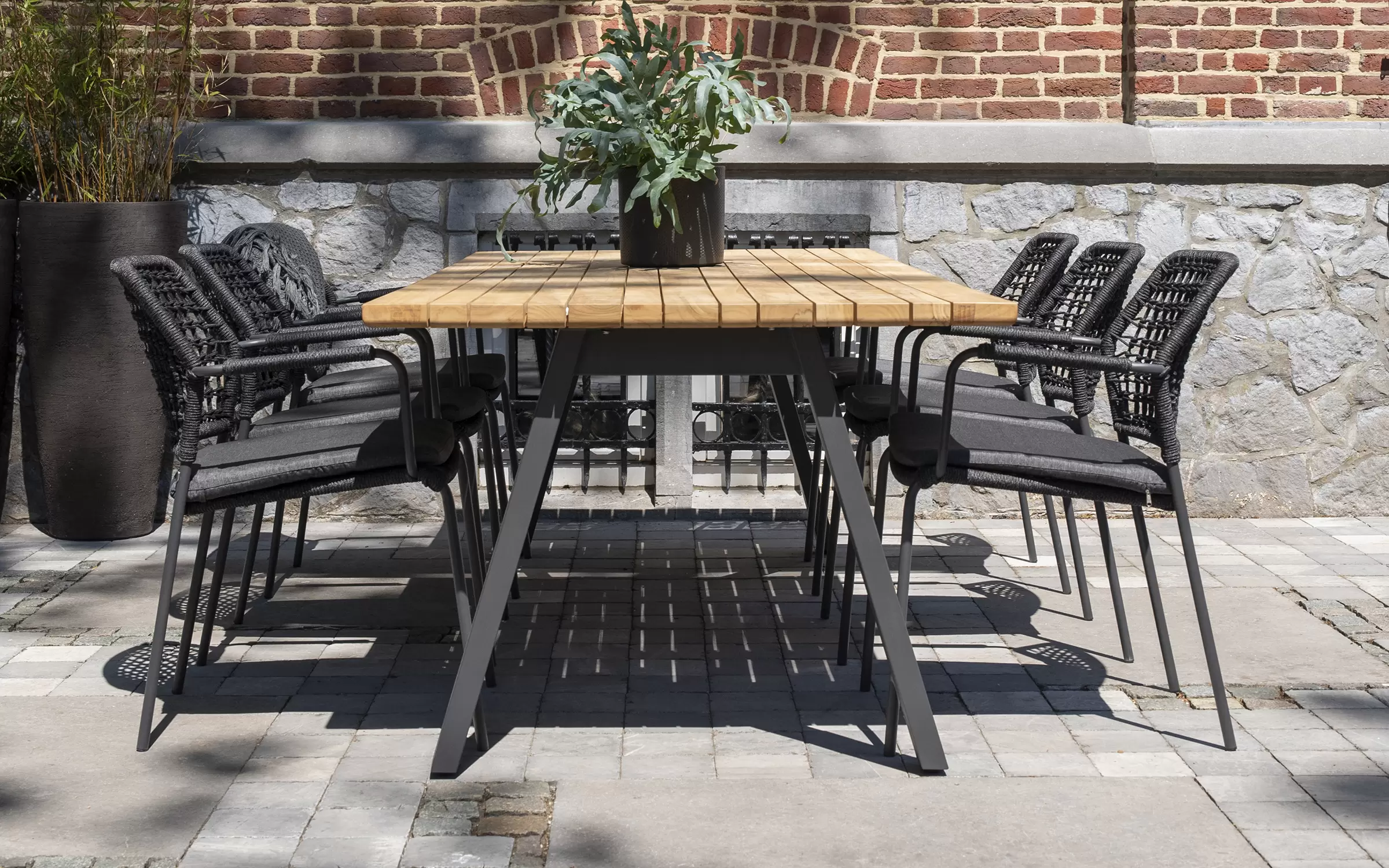 Aluminiowa rama jest o wiele grubsza niż ramy innych mebli ogrodowych, co daje meblom dużą stabilność i odporność na uderzenia. Aluminium jest również materiałem, który nie rdzewieje, co zapobiega powstawaniu plam na oplatającej ramę plecionce technorattanowej (w przeciwieństwie do konstrukcji stalowych). Aluminium to bezobsługowy materiał o nowoczesnym, ponadczasowym wyglądzie.