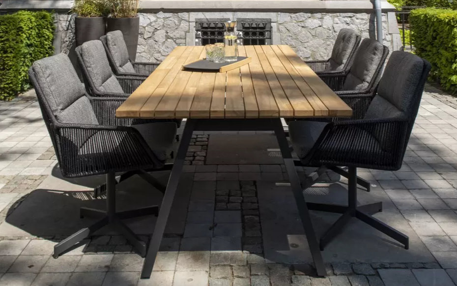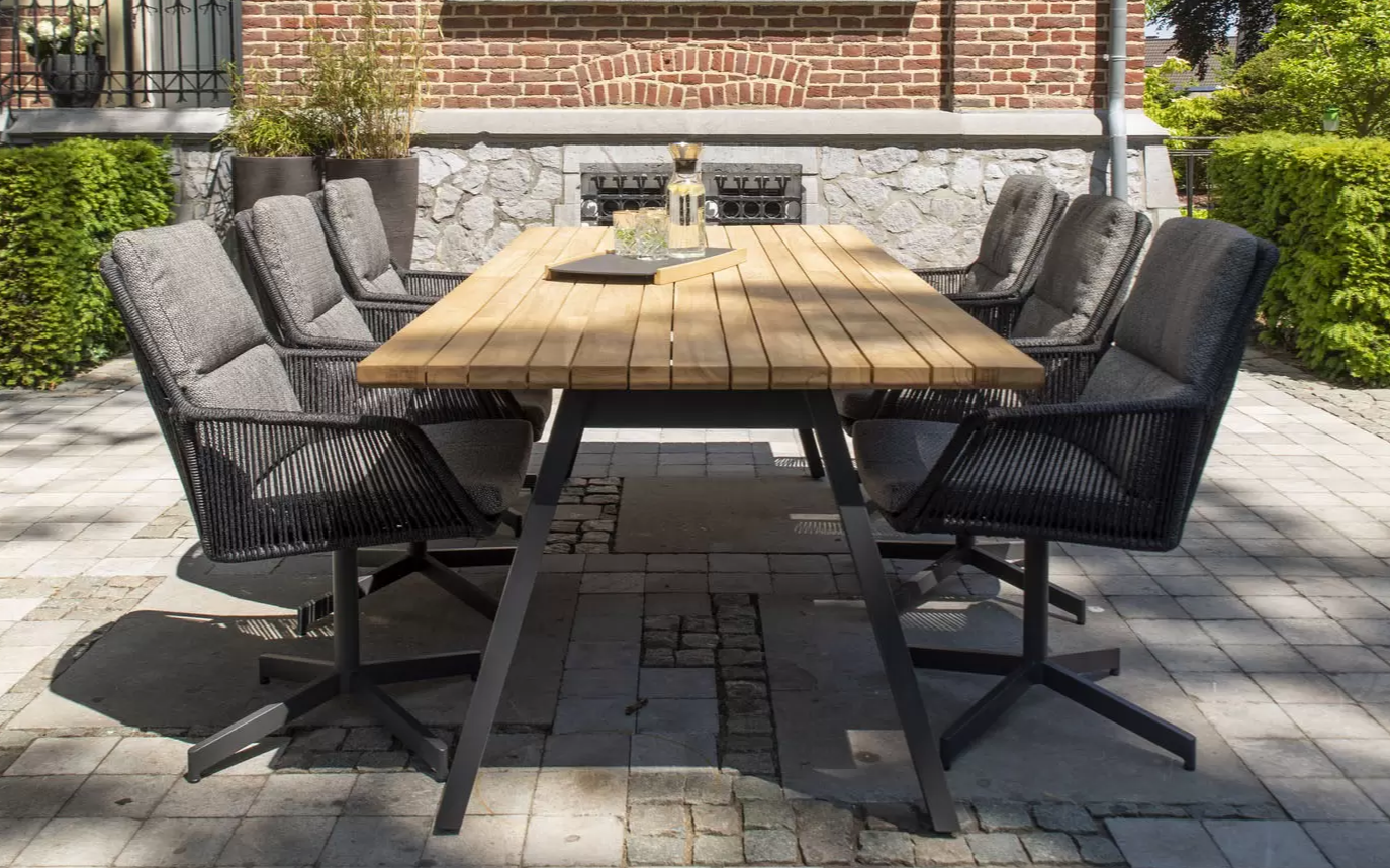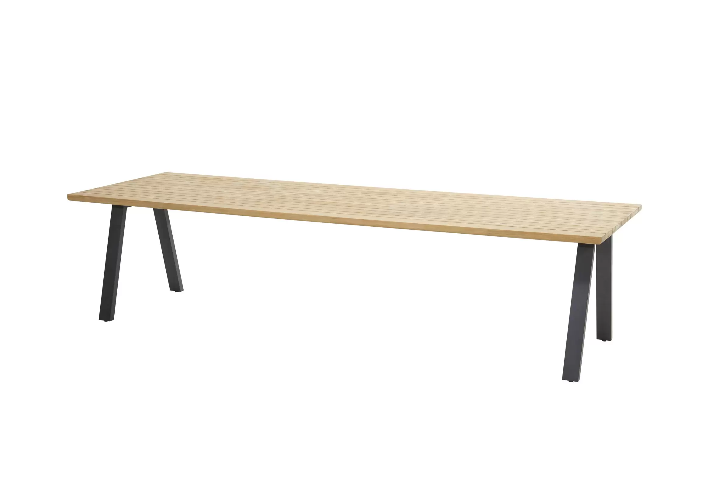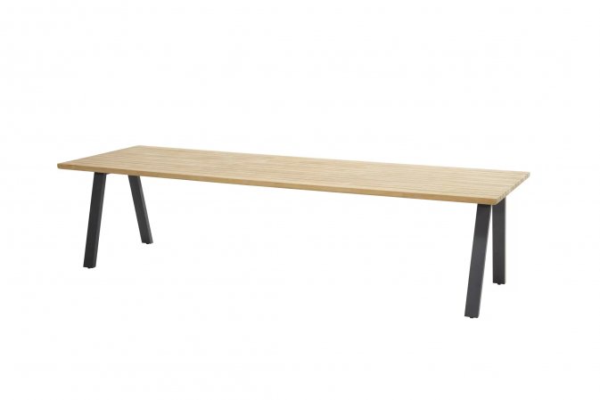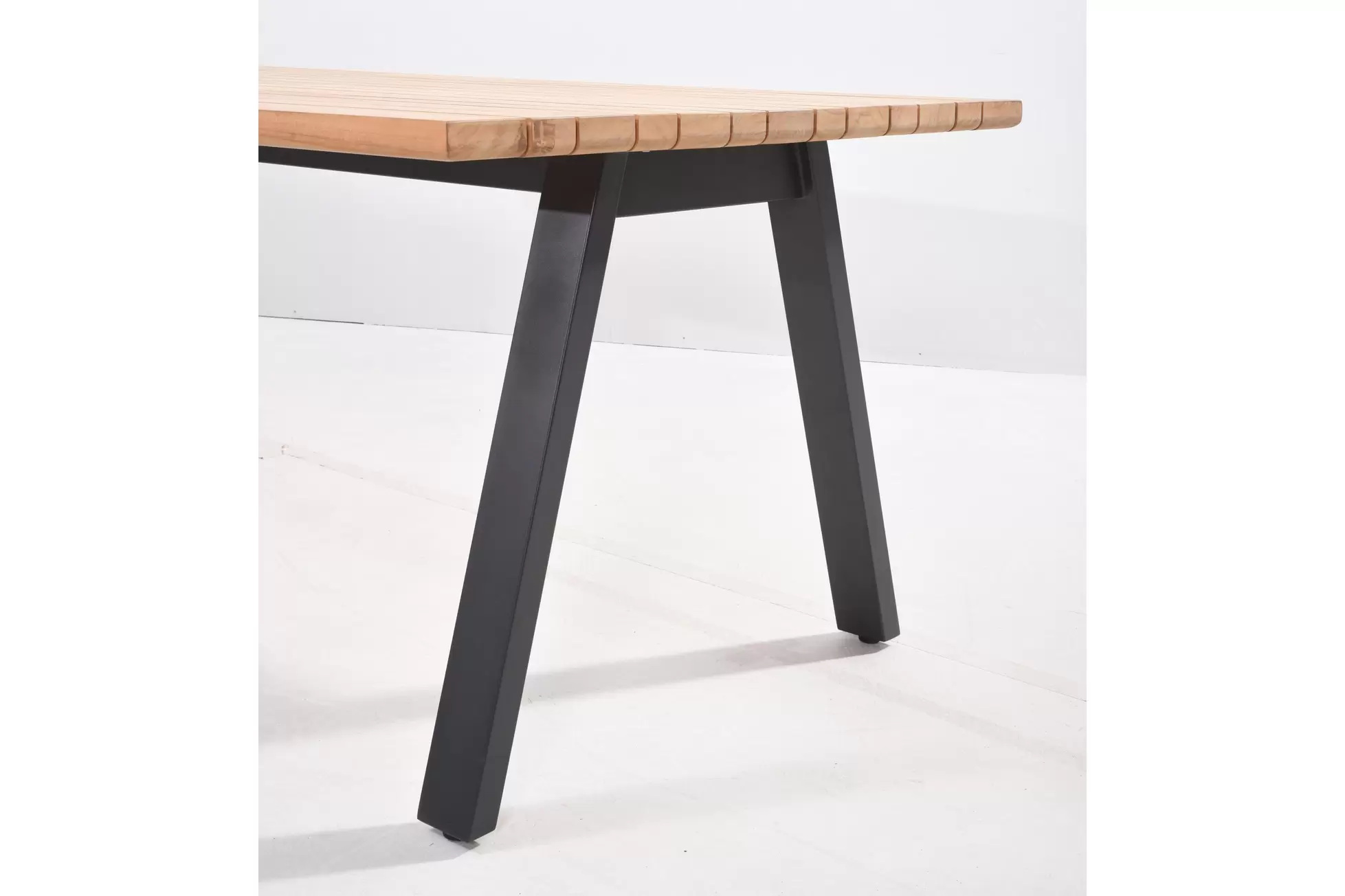 Stół ma podstawę ze stali nierdzewnej w kolorze antracytowym i blat z drewna tekowego premium.