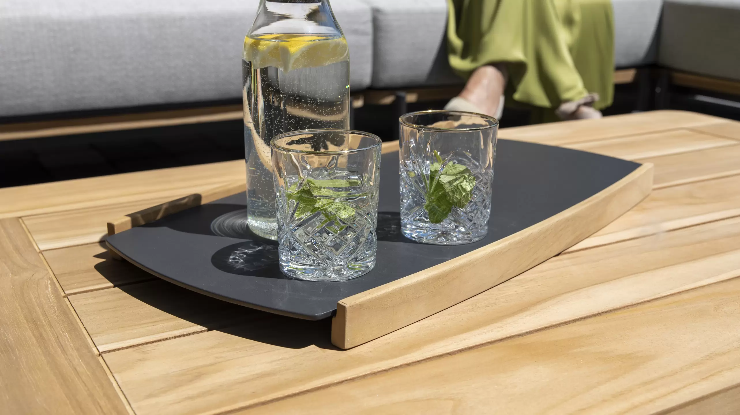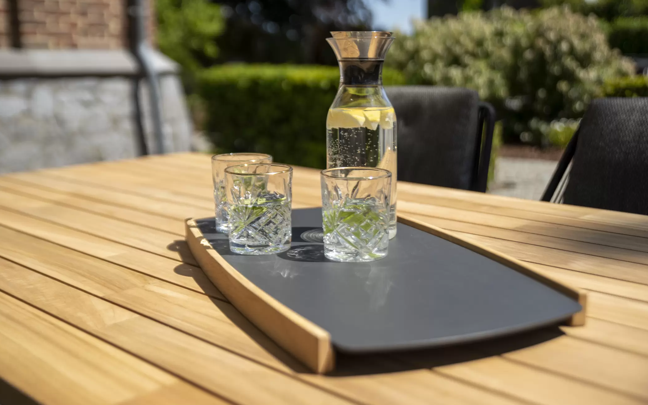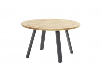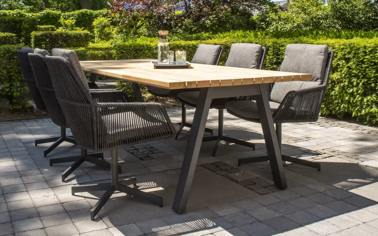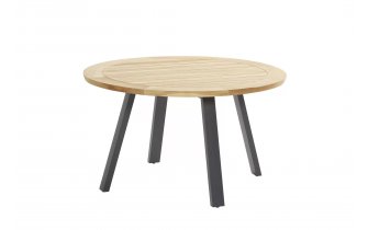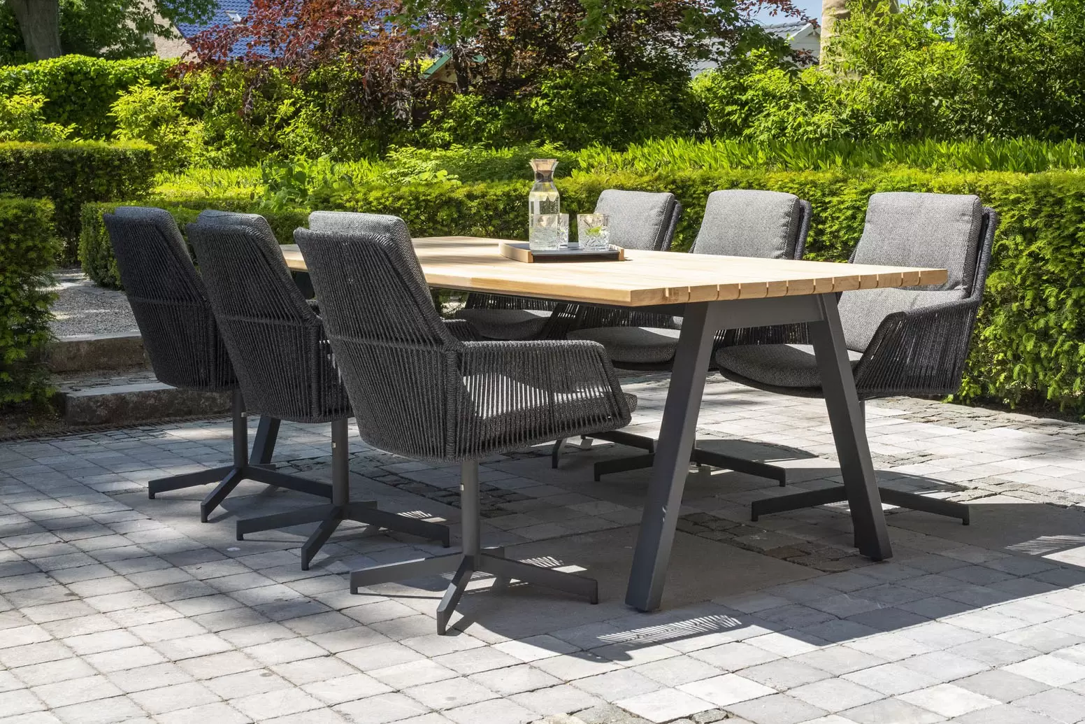 Stół ma podstawę ze stali nierdzewnej w kolorze antracytowym i blat z drewna tekowego premium.