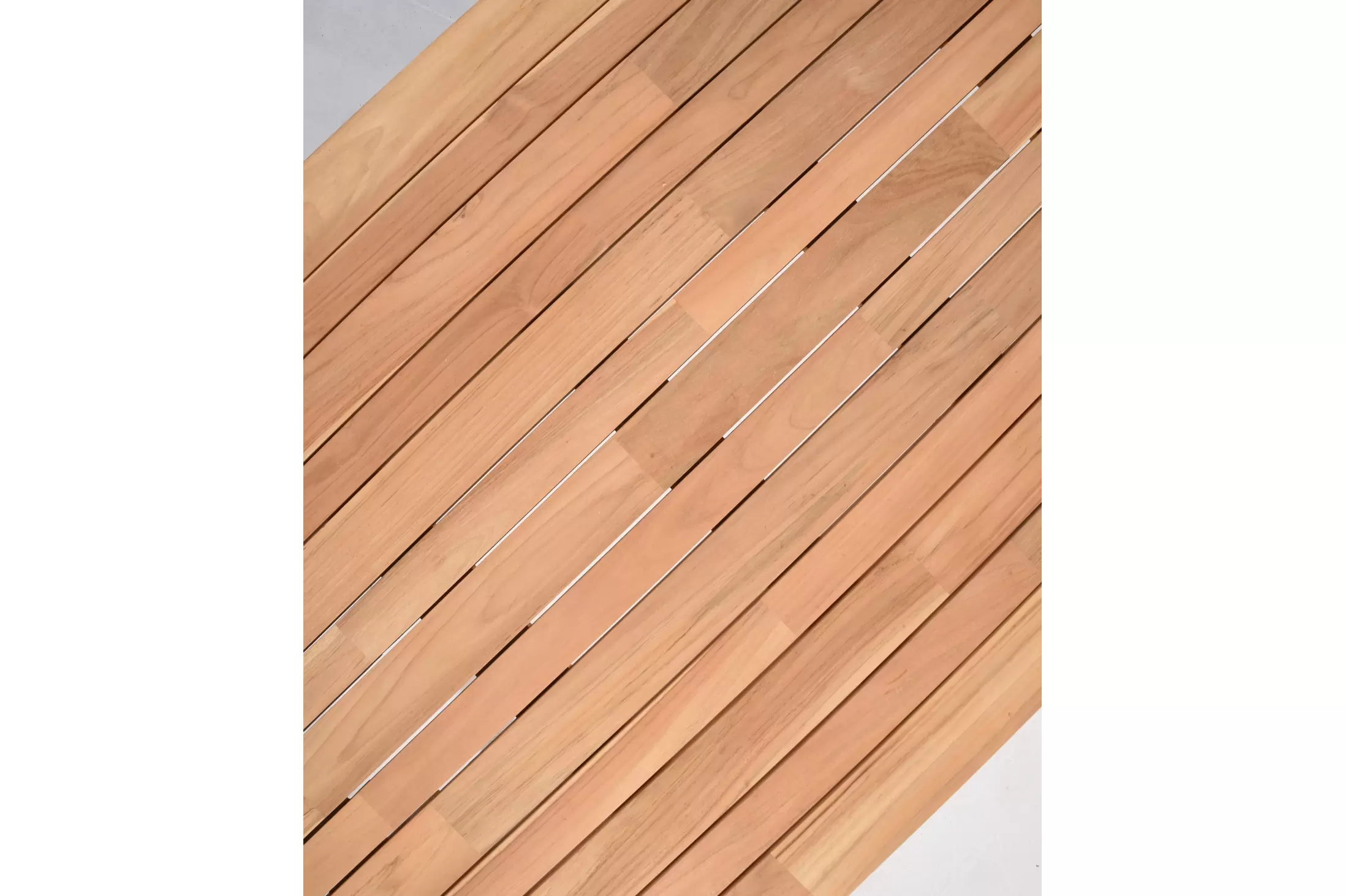 Uderzającym detalem tekowego blatu stołu Ambassador są różne szerokości desek. Ten piękny efekt jest wyraĹşnie widoczny na szczegółowych zdjęciach. Zapewnia oryginalny i nowoczesny wygląd.