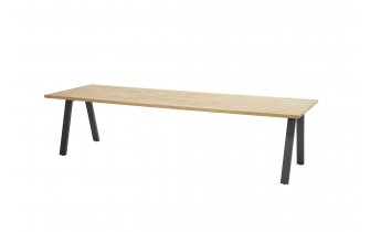 Stół ma podstawę z aluminium w kolorze antracytowym i blat z drewna tekowego o średnicy 130 cm.