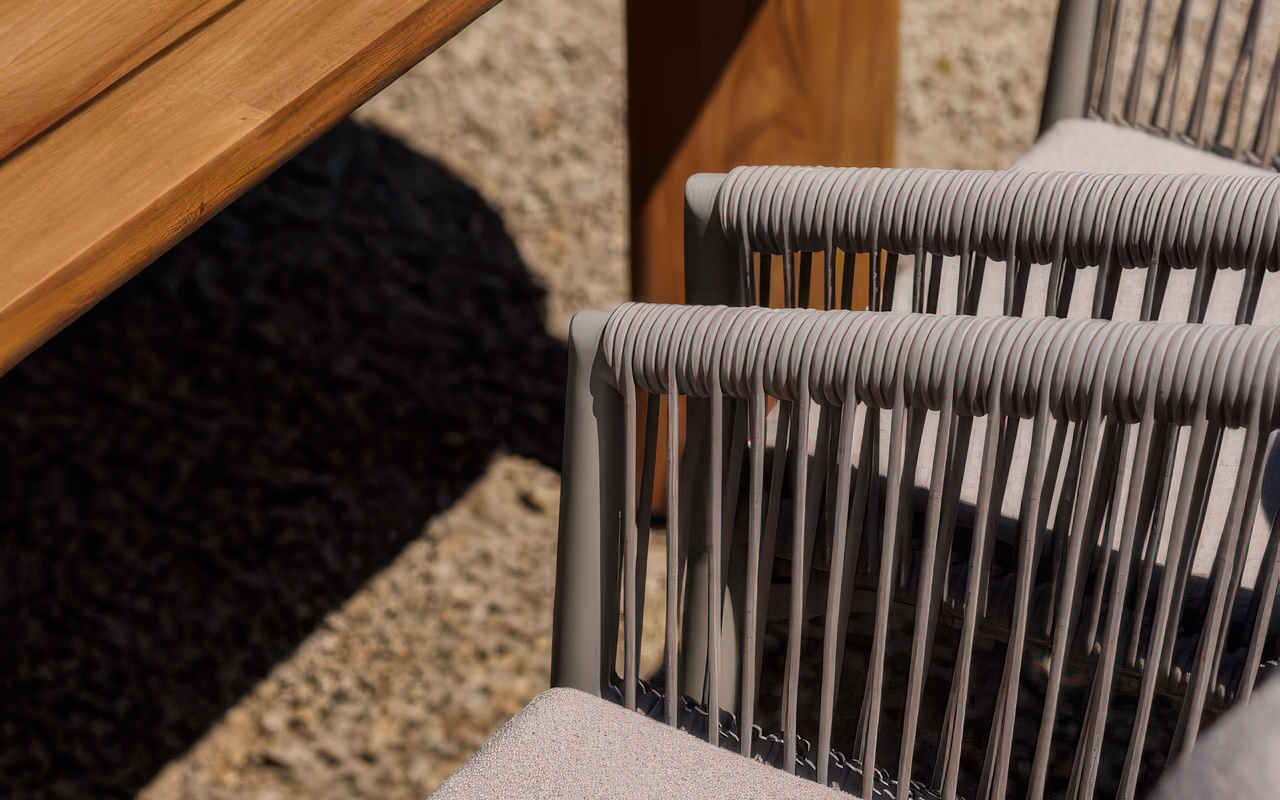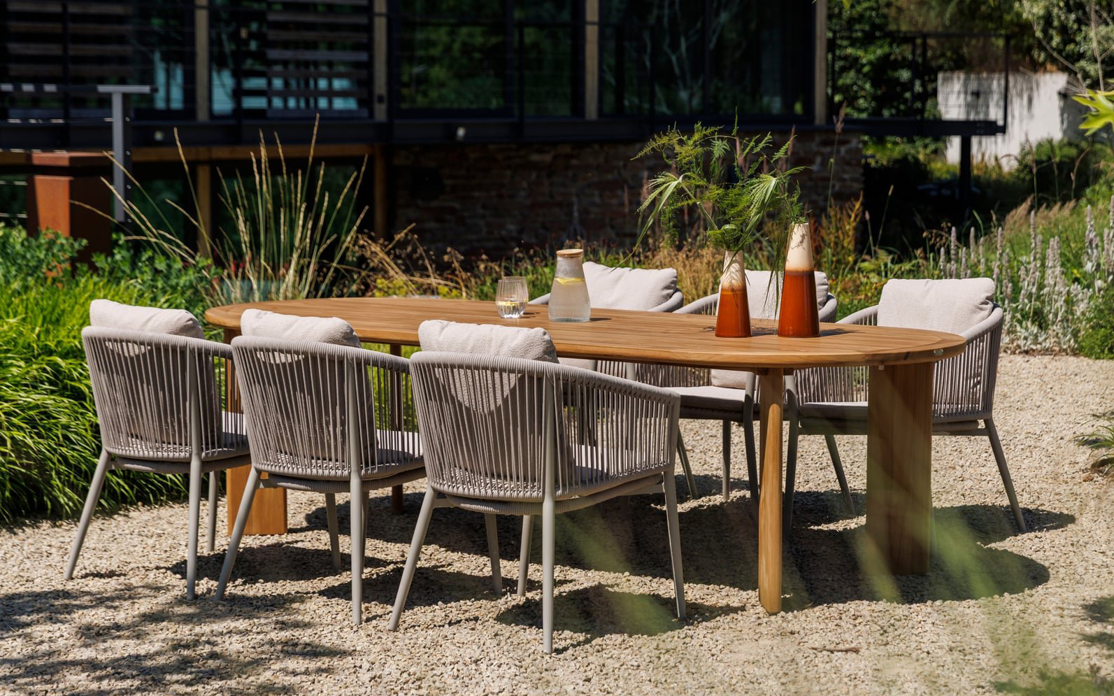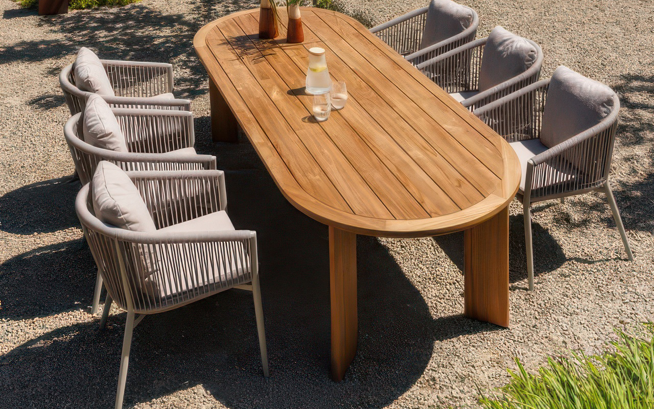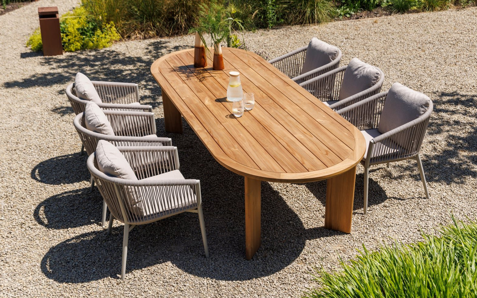 Sercem kompletu jest stół ANDALUCIA o długości 280 cm, w całości wykonany z drewna teakowego. Charakterystyczne, owalne wykończenia blatu nadają bryle nowoczesny sznyt i poprawiają ergonomię poruszania się wokół mebla. Teak, dzięki wysokiej zawartości naturalnych olejów, jest wyjątkowo odporny na wilgoć i degradację biologiczną, pozostając materiałem komfortowym w kontakcie ze skórą nawet podczas upałów.