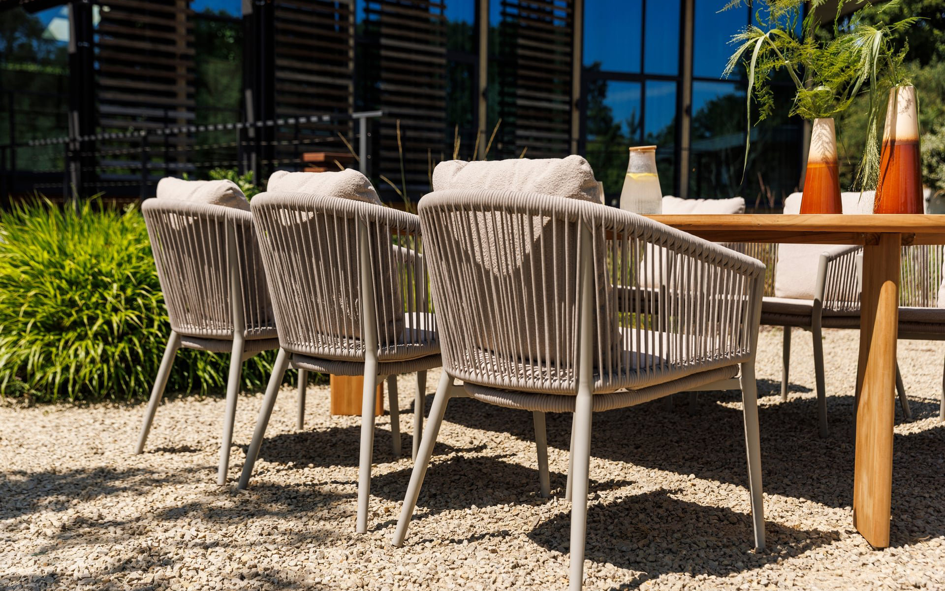W skład zestawu wchodzi 6 krzeseł MALAGA w beżowej tonacji. Ich konstrukcję oparto na aluminium malowanym proszkowo, co zapewnia pełną ochronę przed korozją przy zachowaniu niskiej wagi mebli. Oparcia wykończone linami syntetycznymi nadają krzesłom wizualną lekkość, a miękkie poduszki w kolorze beżowym dopełniają spójną kolorystykę i podnoszą standard wypoczynku.