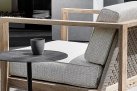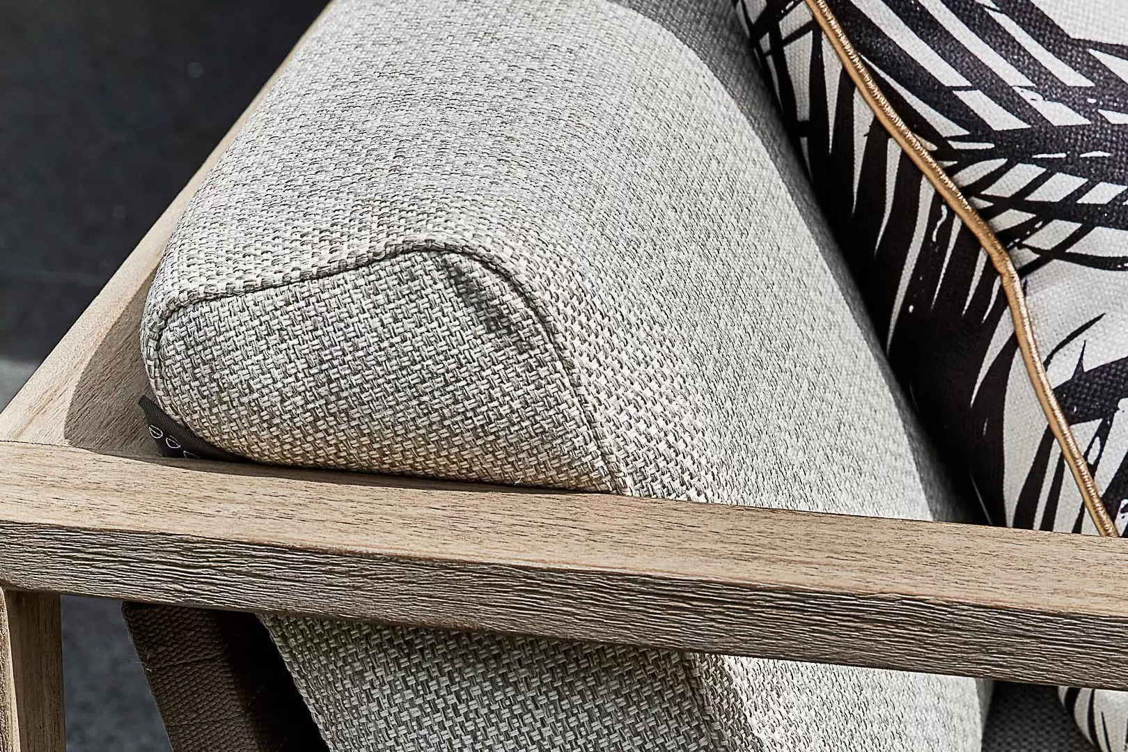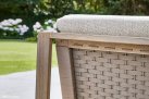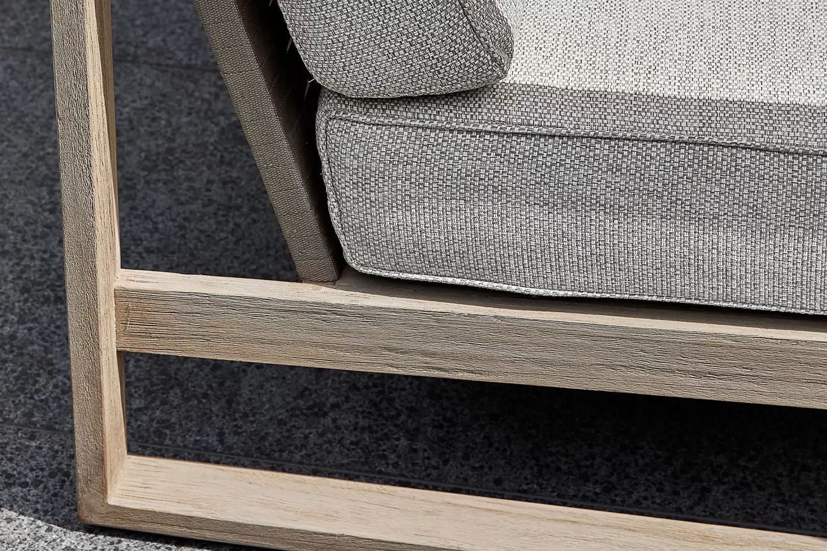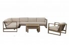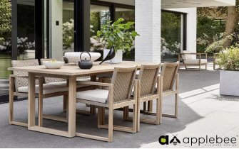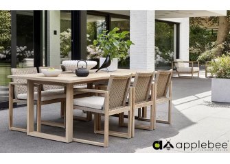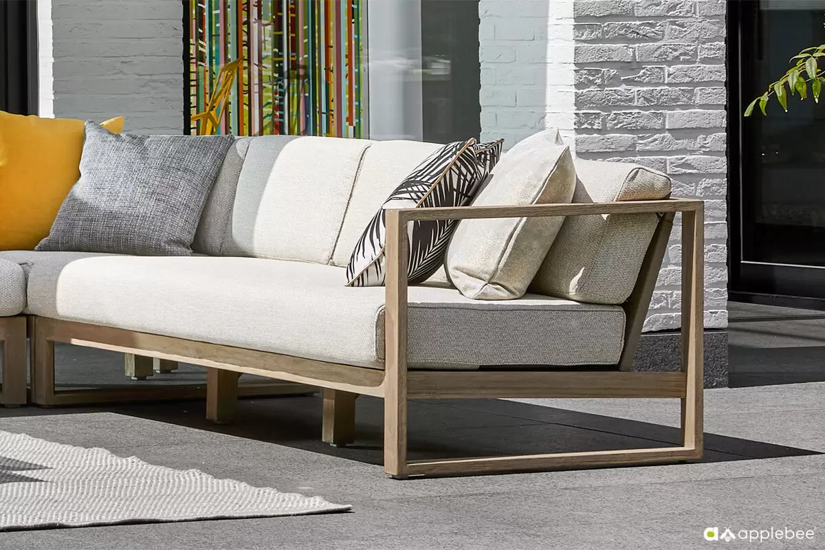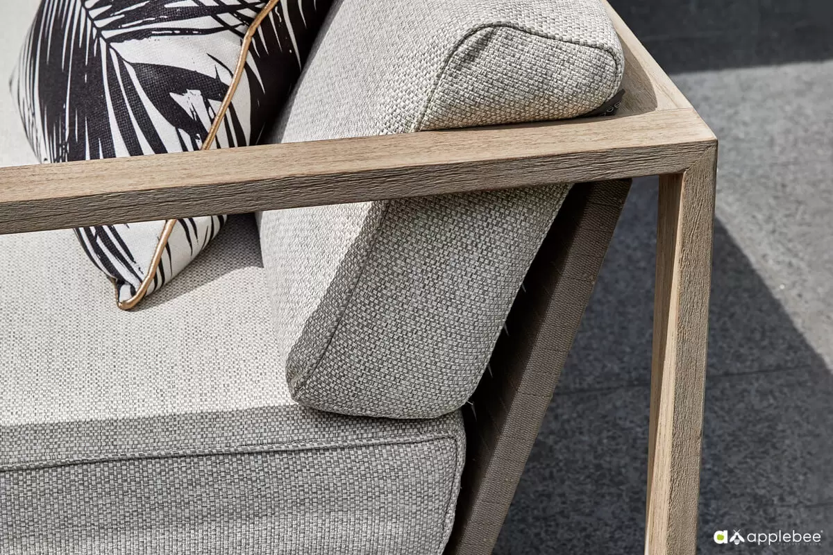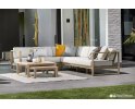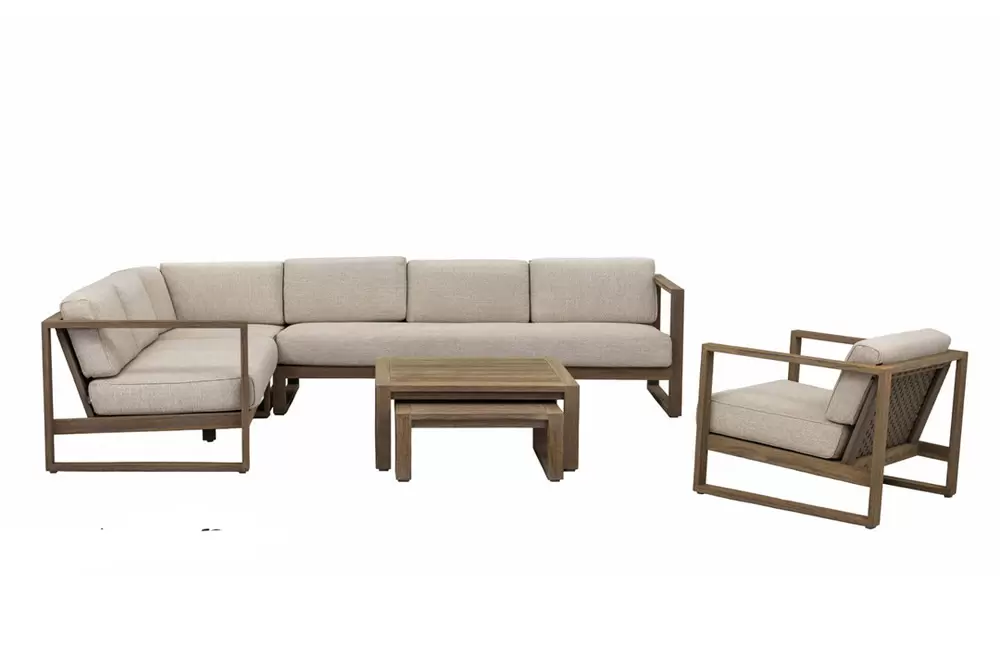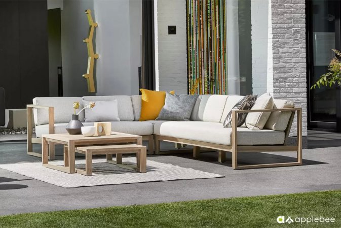Narożnik Applebee Antigua wykonany jest z drewna tekowego z wykończeniem robust i plecionki z pasów polipropylenowych. Grube poduszki w kolorze beżu zapewniają pełny relaks, a dzięki technologii Bee-Wett są odporne na wodę i warunki pogodowe. W kolekcji Antiqua dostępny jest także fotel, leżak, krzesła obiadowe i stół.
