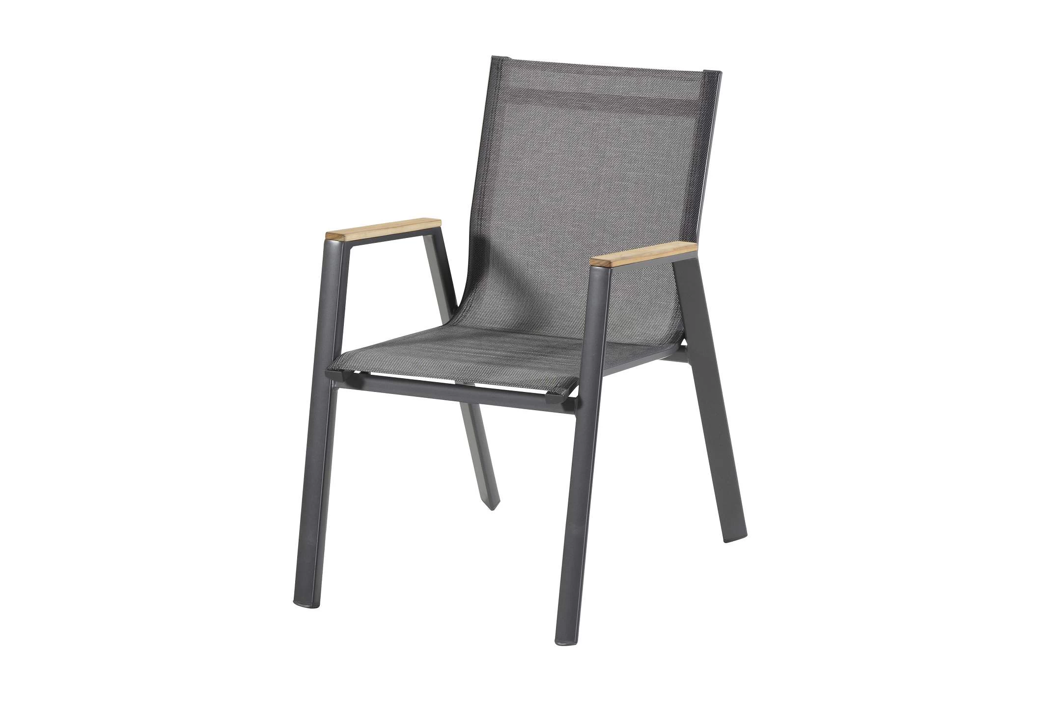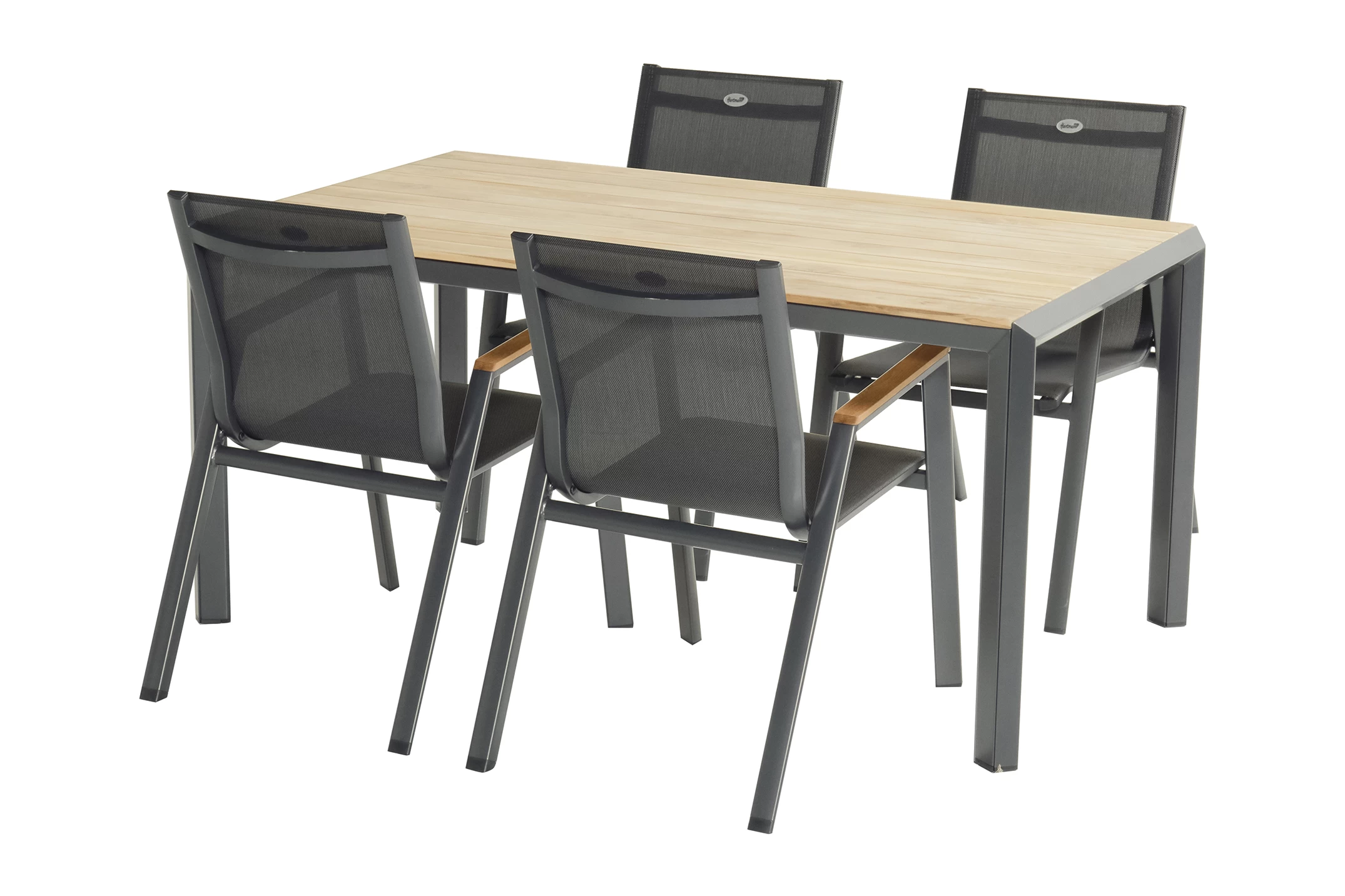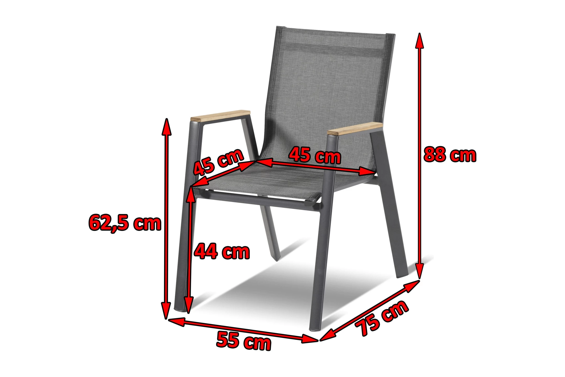 Stół do jadalni Hartman Aruba ma piękną aluminiową podstawę i blat z drewna FSC. Teak to trwały materiał do wyboru każdego rodzaju mebli. Teak ma tzw właściwość starzenia - z czasem stół zaczyna nabierać srebrno-szarego odcienia. Aby utrzymać oryginalny kolor należy kilkukrotnie w czasie roku odświeżać preparatami do drewna teakowego. Do stołu pasuje krzesło ogrodowe Hartman Aruba o ergonomicznym kształcie. Podłokietniki krzesła wyposażone są w drewno tekowe FSC dla większego komfortu siedzenia. Siedzisko i oparcie z tekstyliny. Materiał jest odporny na warunki atmosferyczne i nie wymaga konserwacji. Jeśli planujesz przechowywać krzesła na zimę w altanie lub garażu, zajmą naprawdę minimum miejsca.