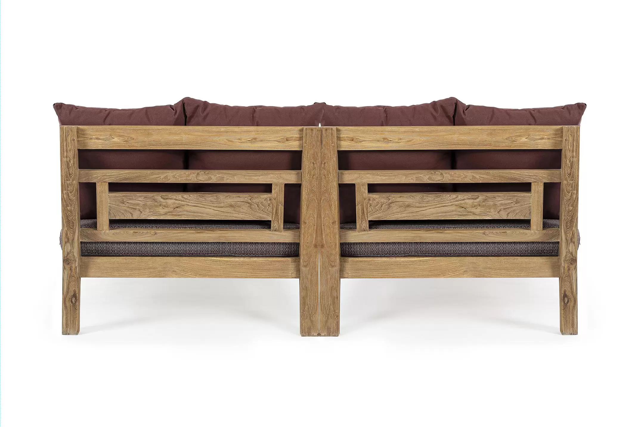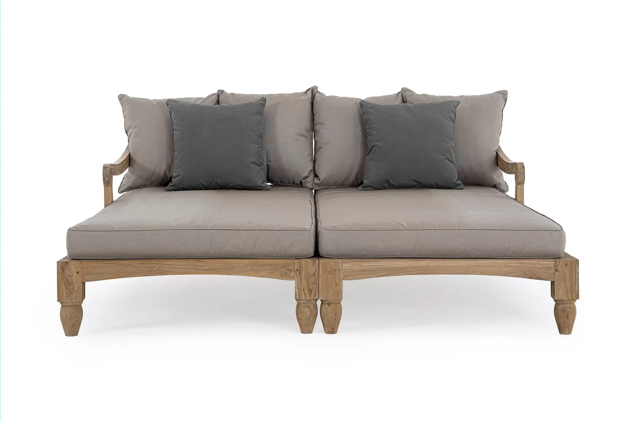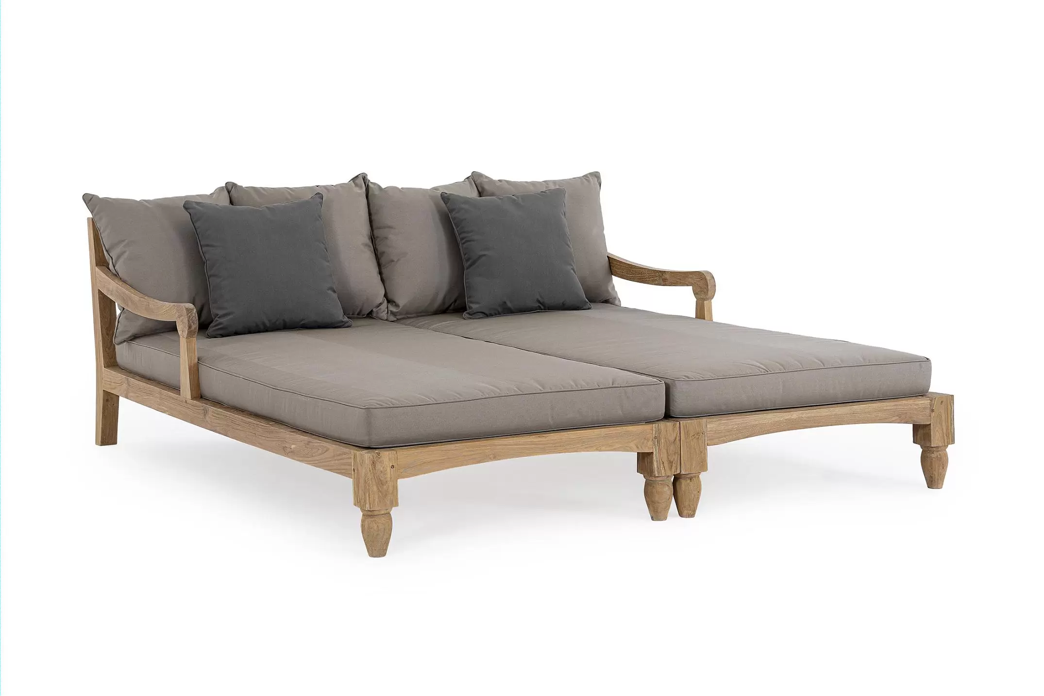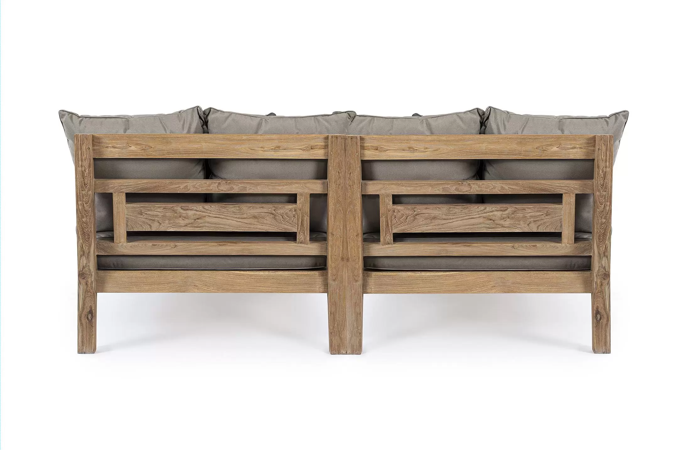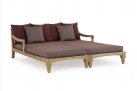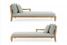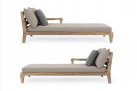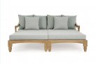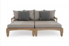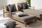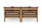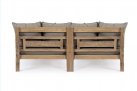 Zestaw 2 symetrycznych sof wykonany z piaskowanego drewna teakowego pokrytego wodnym lakierem nadającym naturalny a zarazem lekko głębszy kolor.