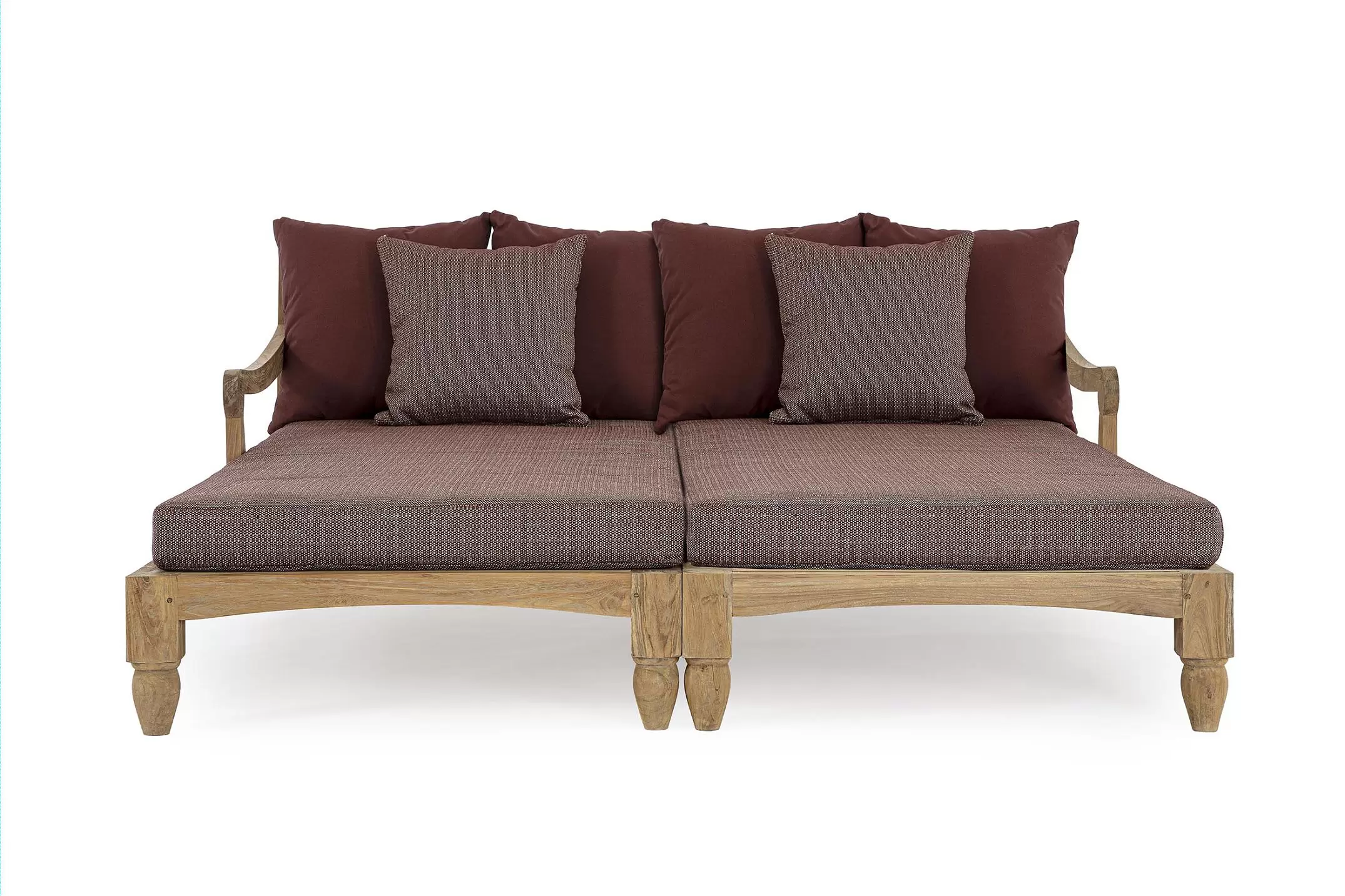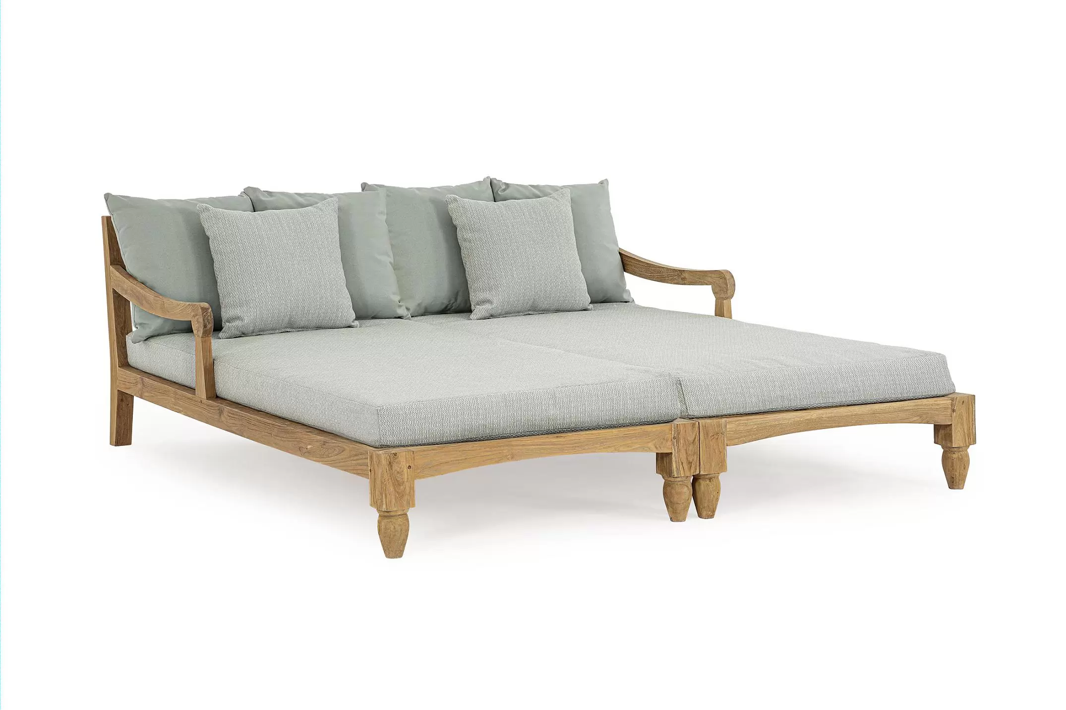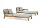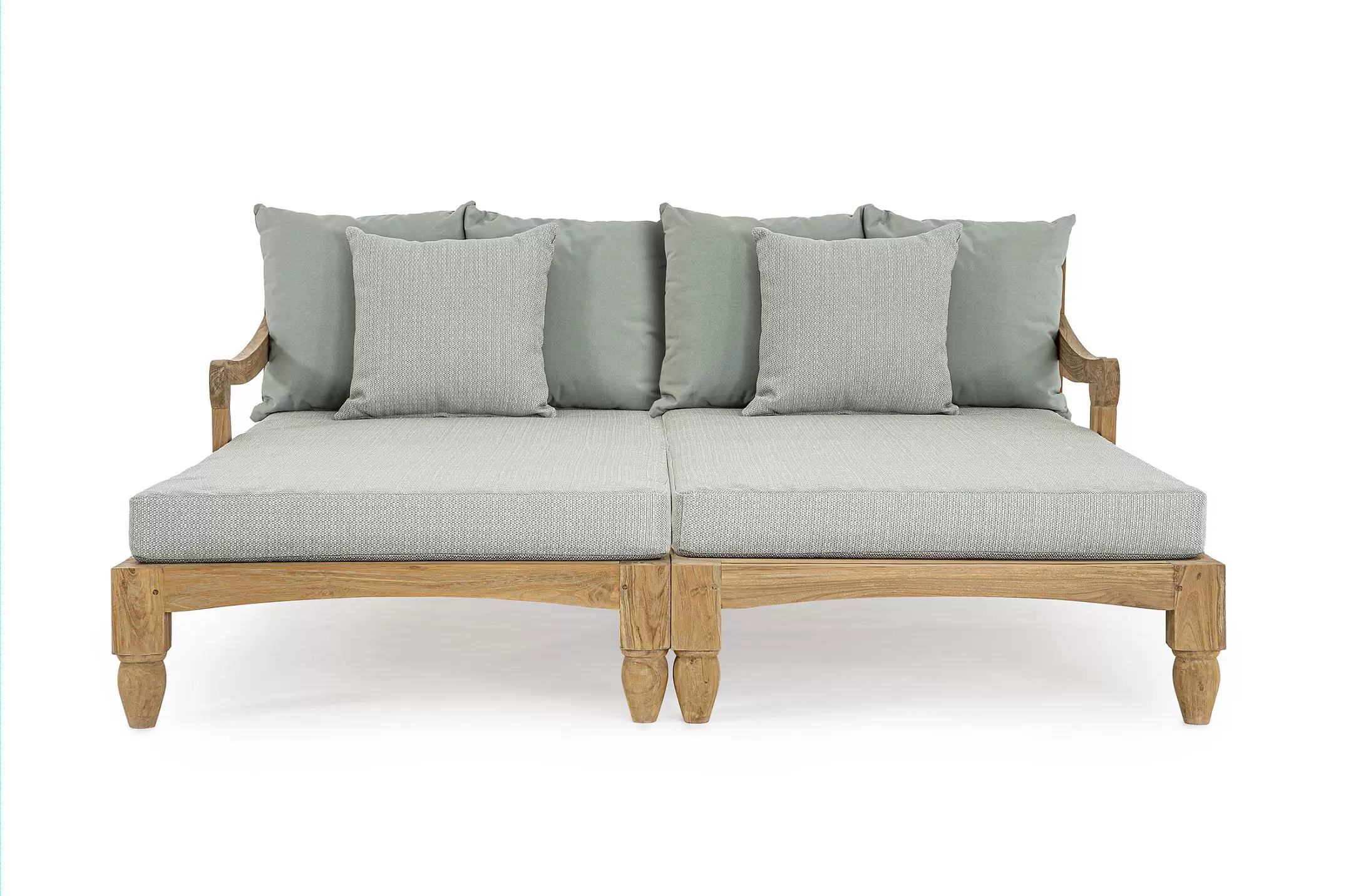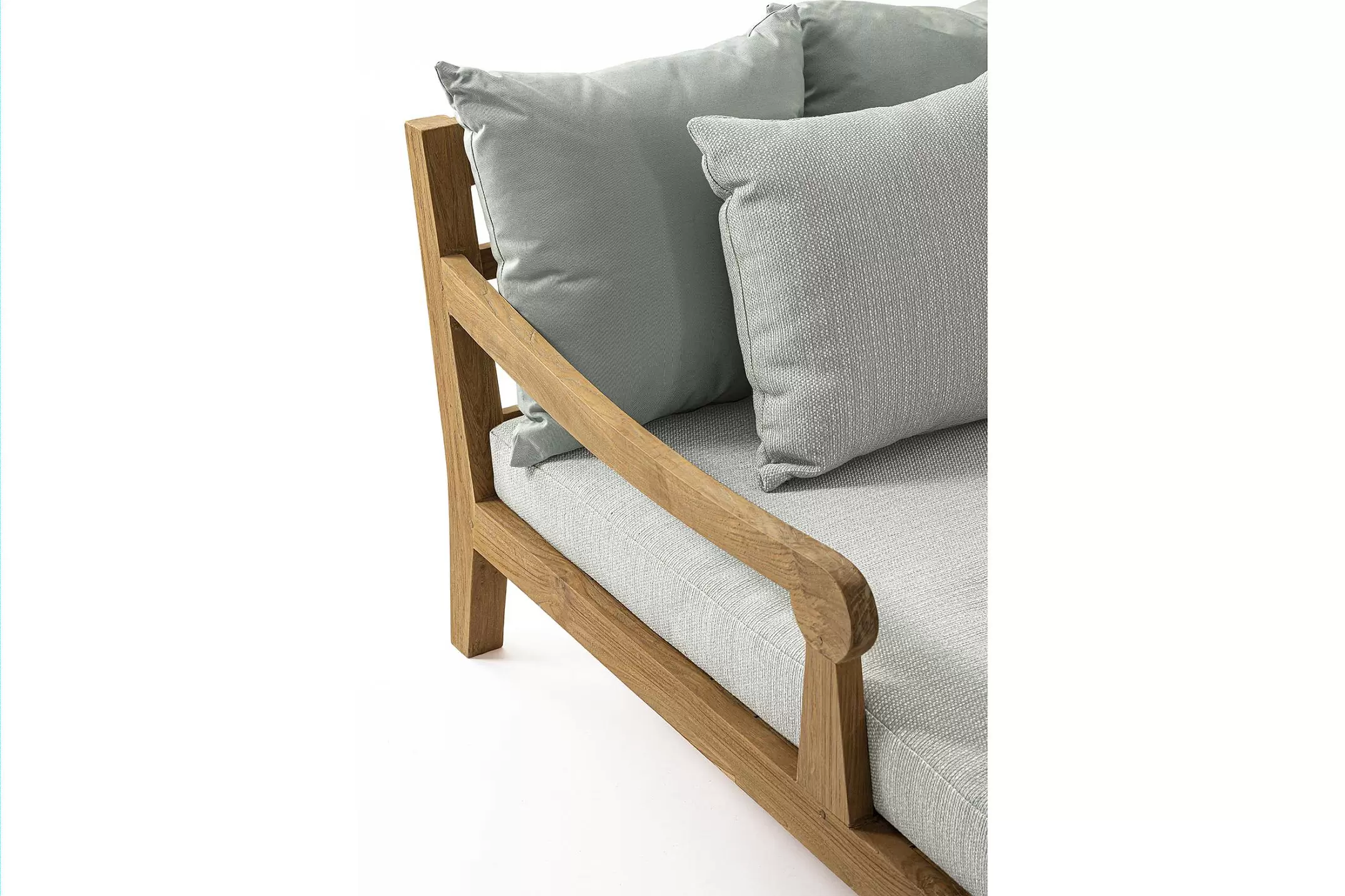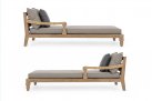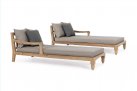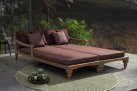 Zestaw 2 symetrycznych sof wykonany z piaskowanego drewna teakowego pokrytego wodnym lakierem nadającym naturalny a zarazem lekko głębszy kolor.