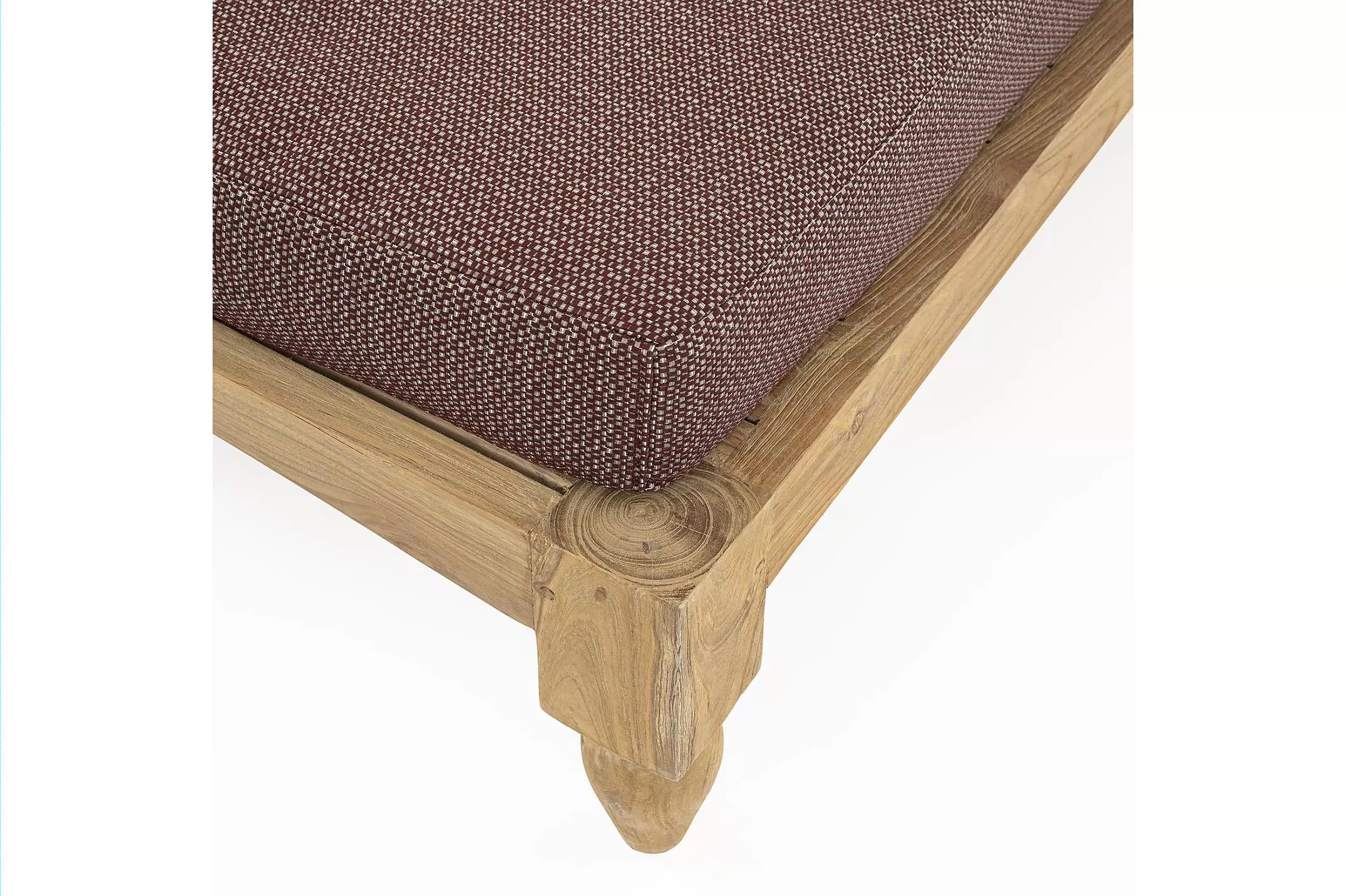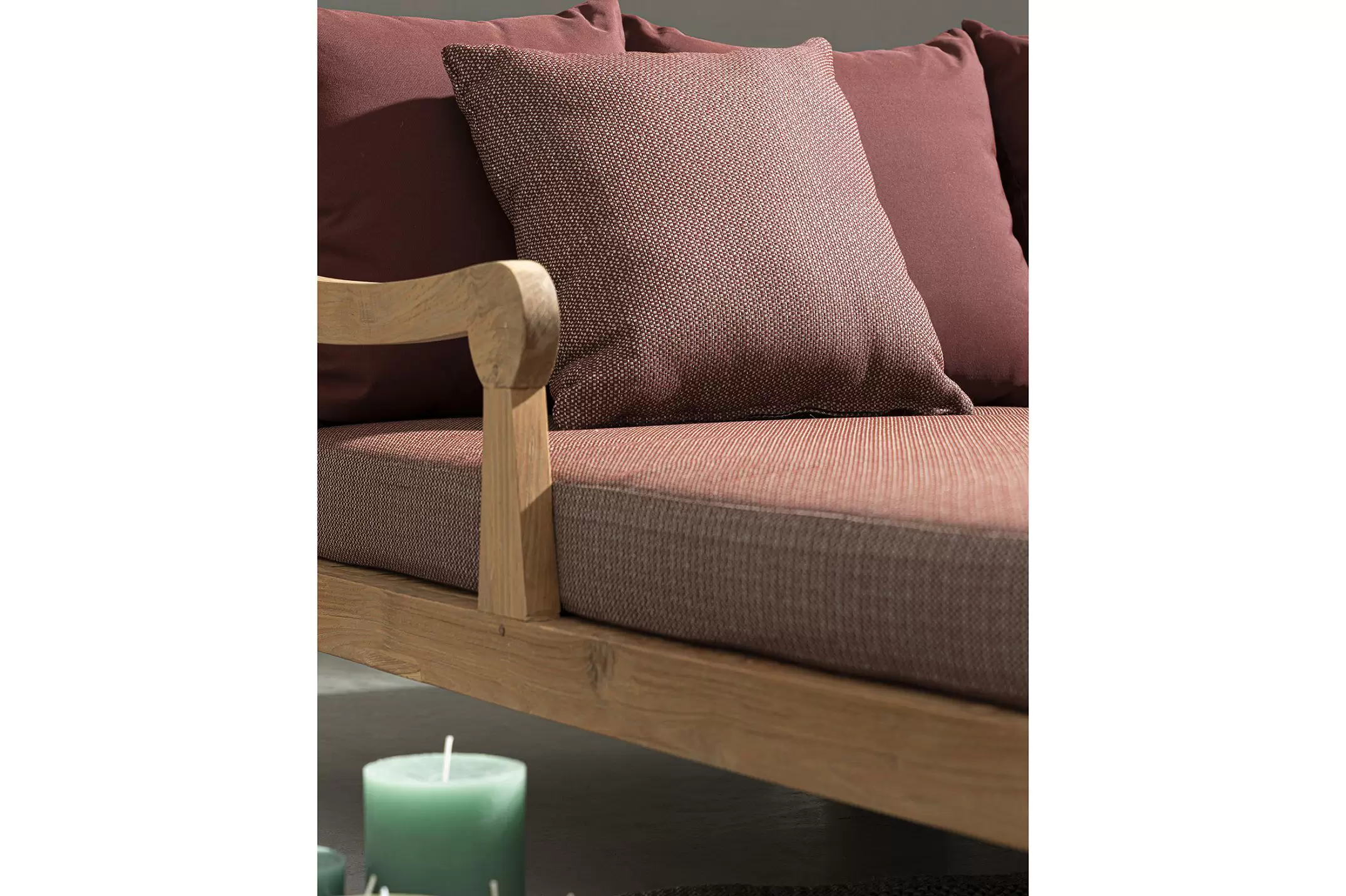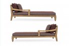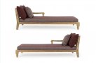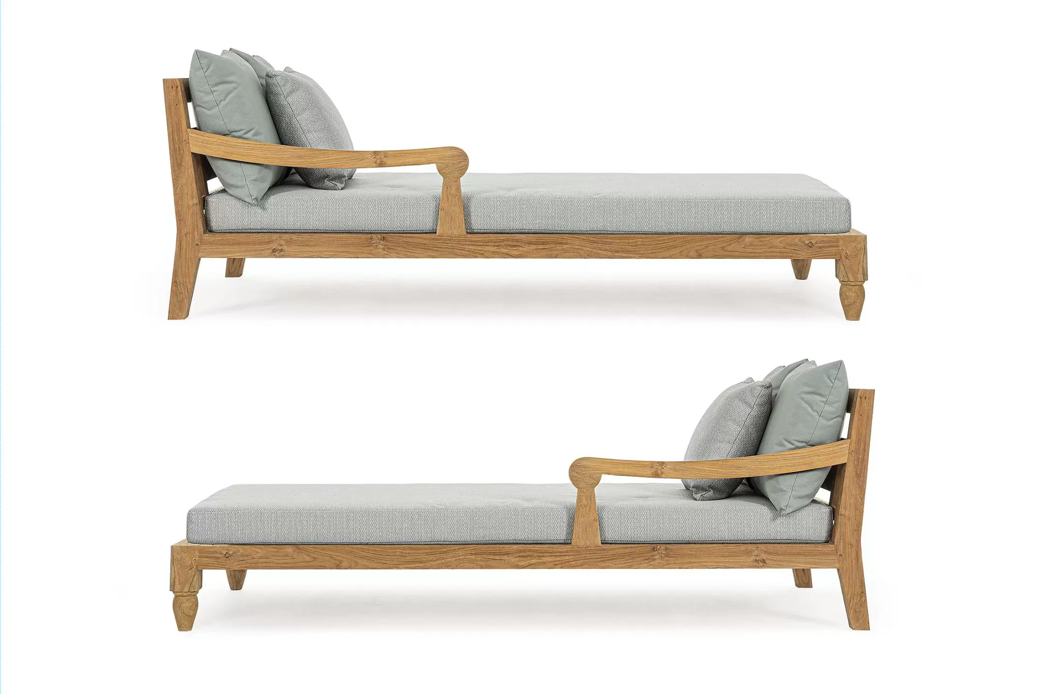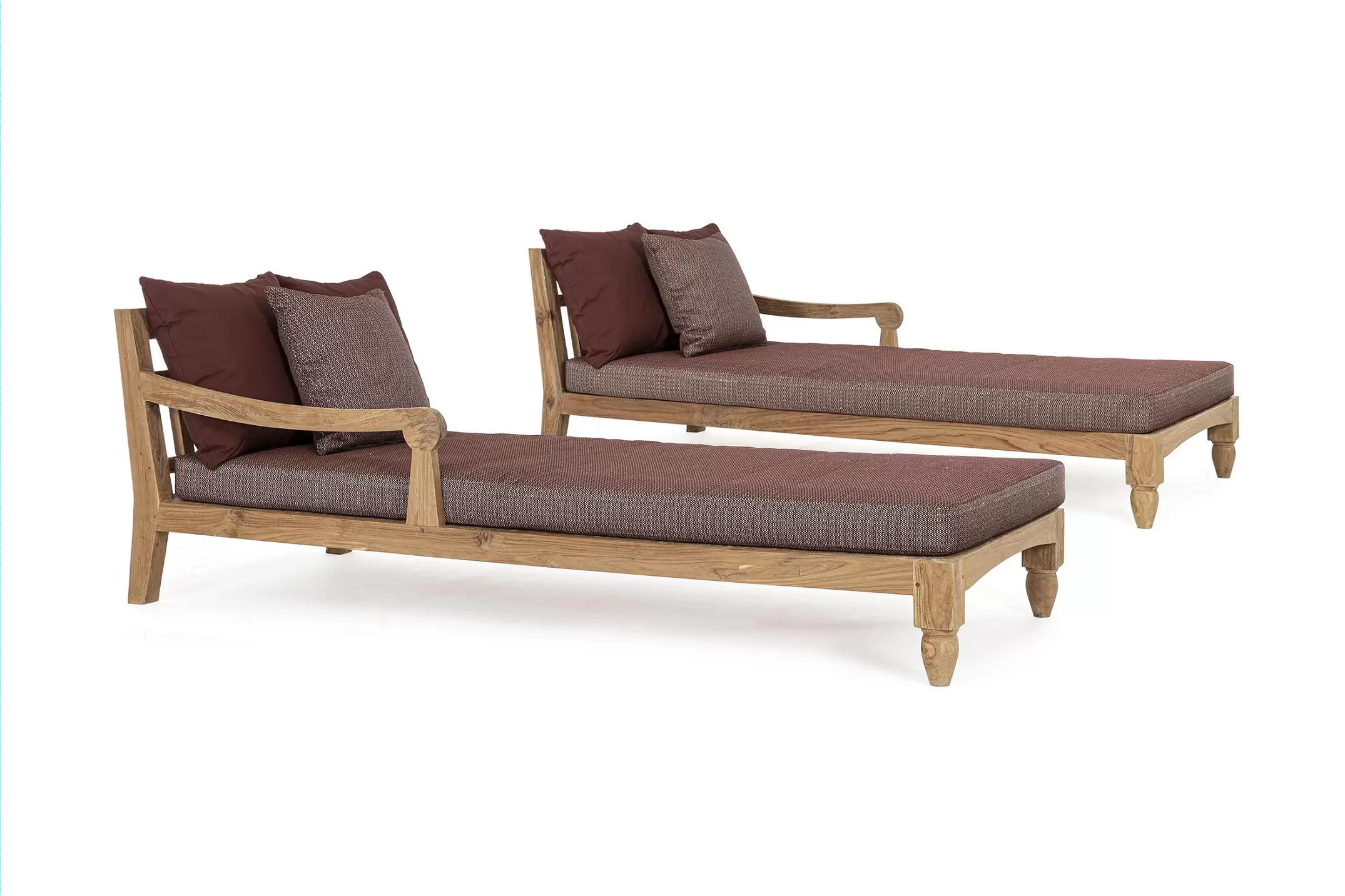 Zestaw 2 symetrycznych sof wykonany z piaskowanego drewna teakowego pokrytego wodnym lakierem nadającym naturalny a zarazem lekko głębszy kolor.
