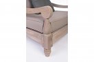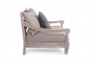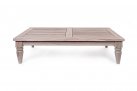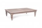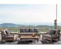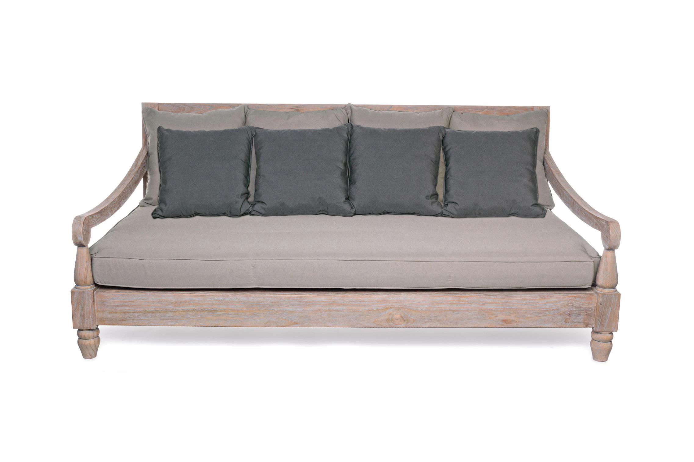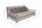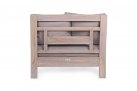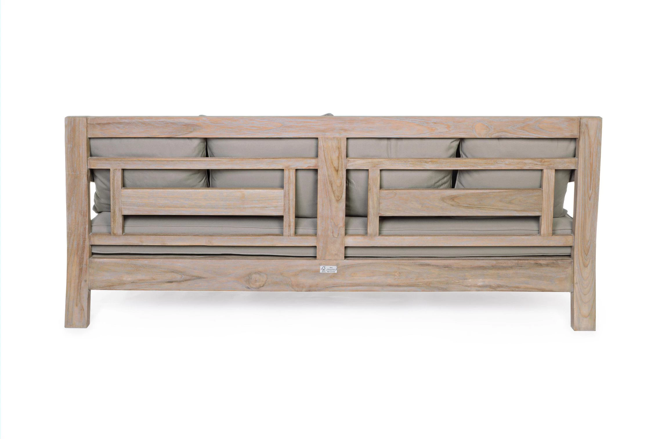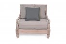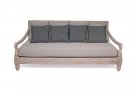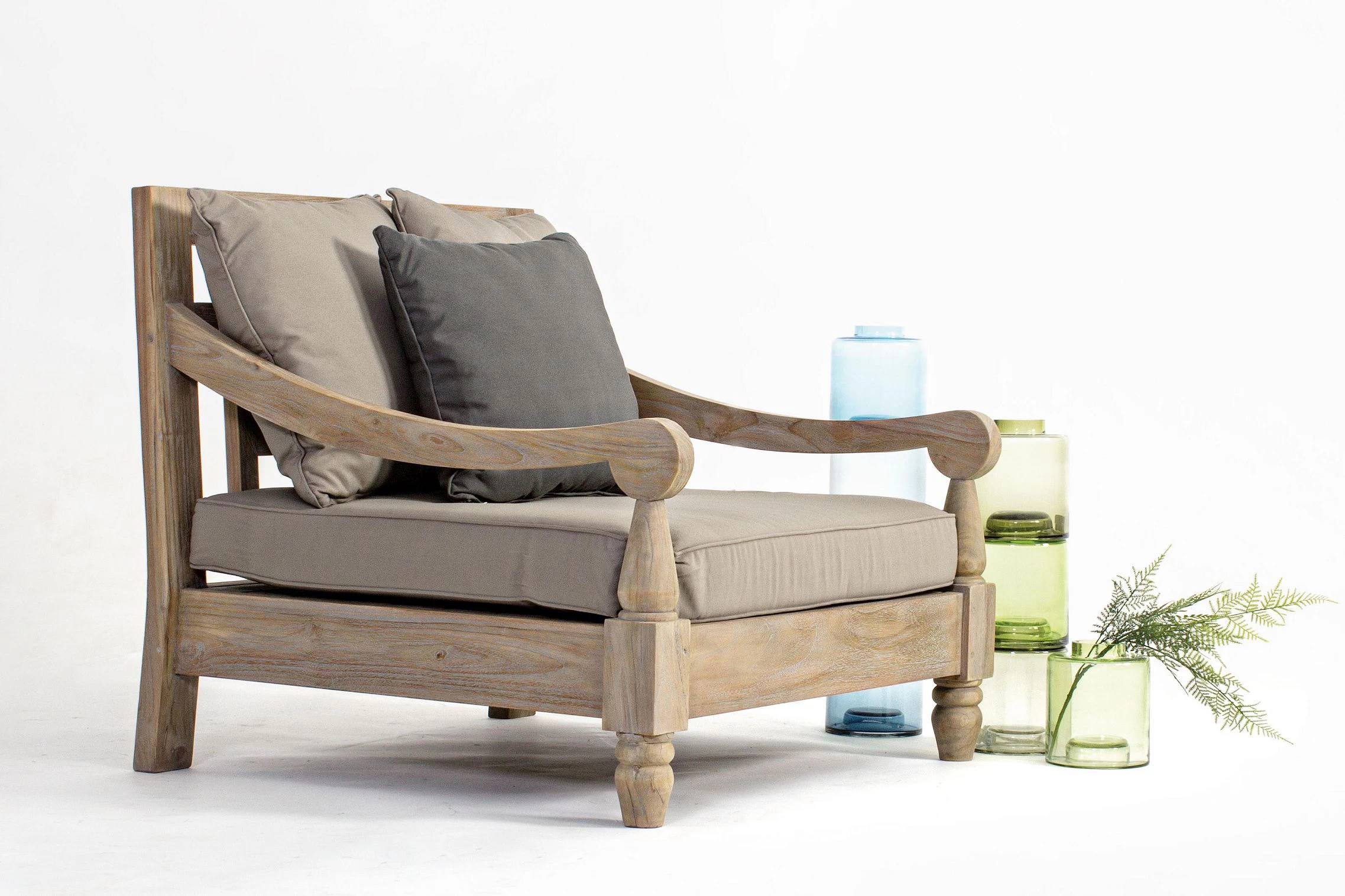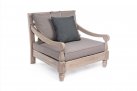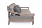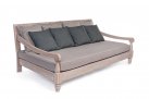 Meble do ogrodowego patio wypoczynkowe z drewna teakowego z efektem postarzania. Głęboką sofa/łóżko, 2 głębokie fotele i stolik kawowy.