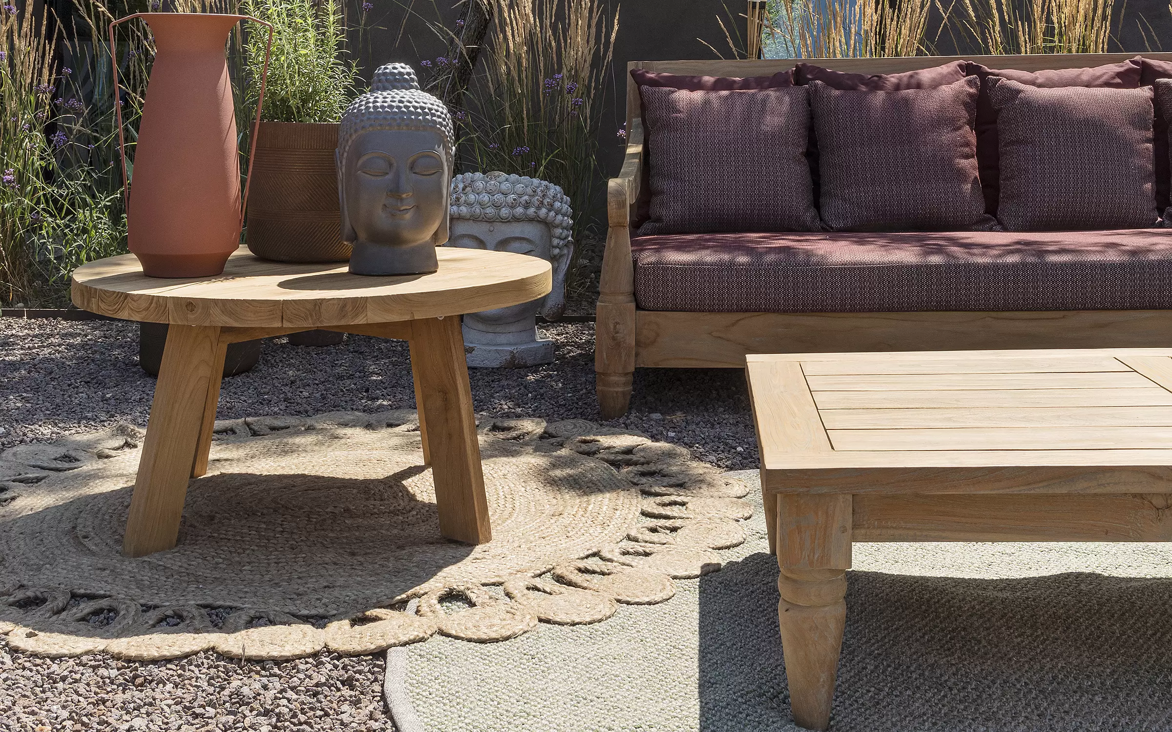 Okrągły stolik kawowy z drewna tekowego w naturalnym rustykalnym wykończeniu na 4 nogach z grubym blatem z desek.