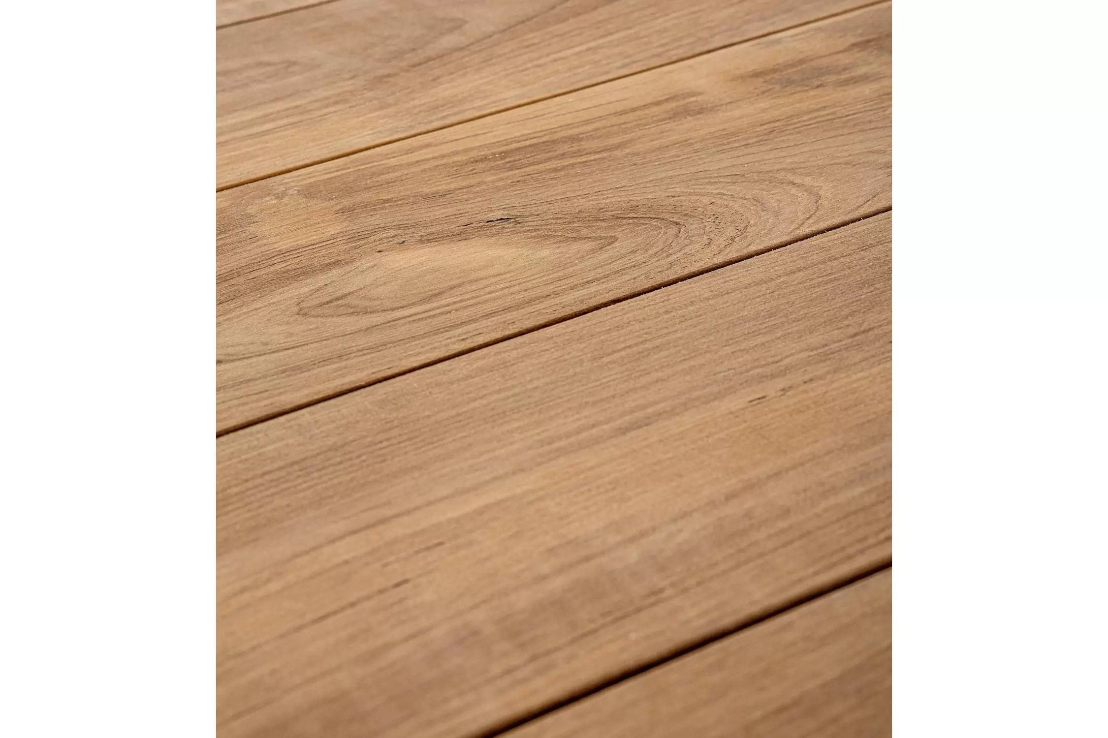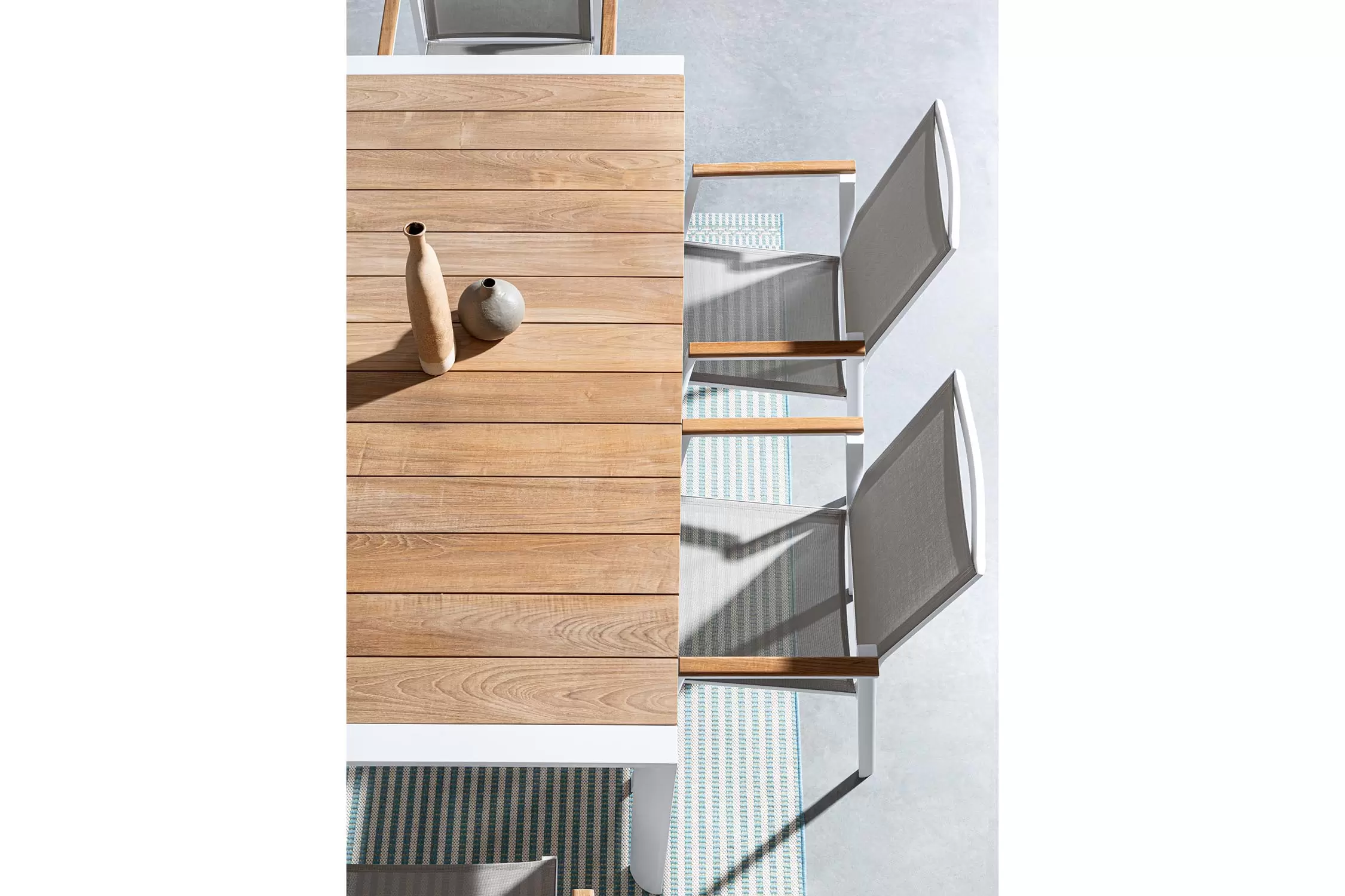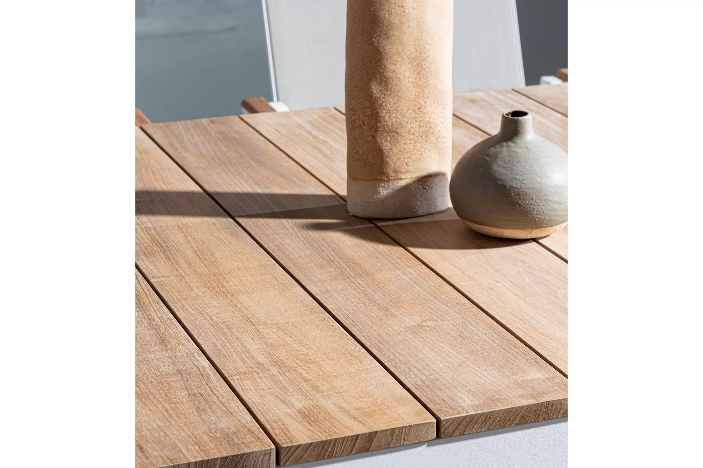 Blat stołu z desek teak. Elementy montażowe ze stali nierdzewnej.