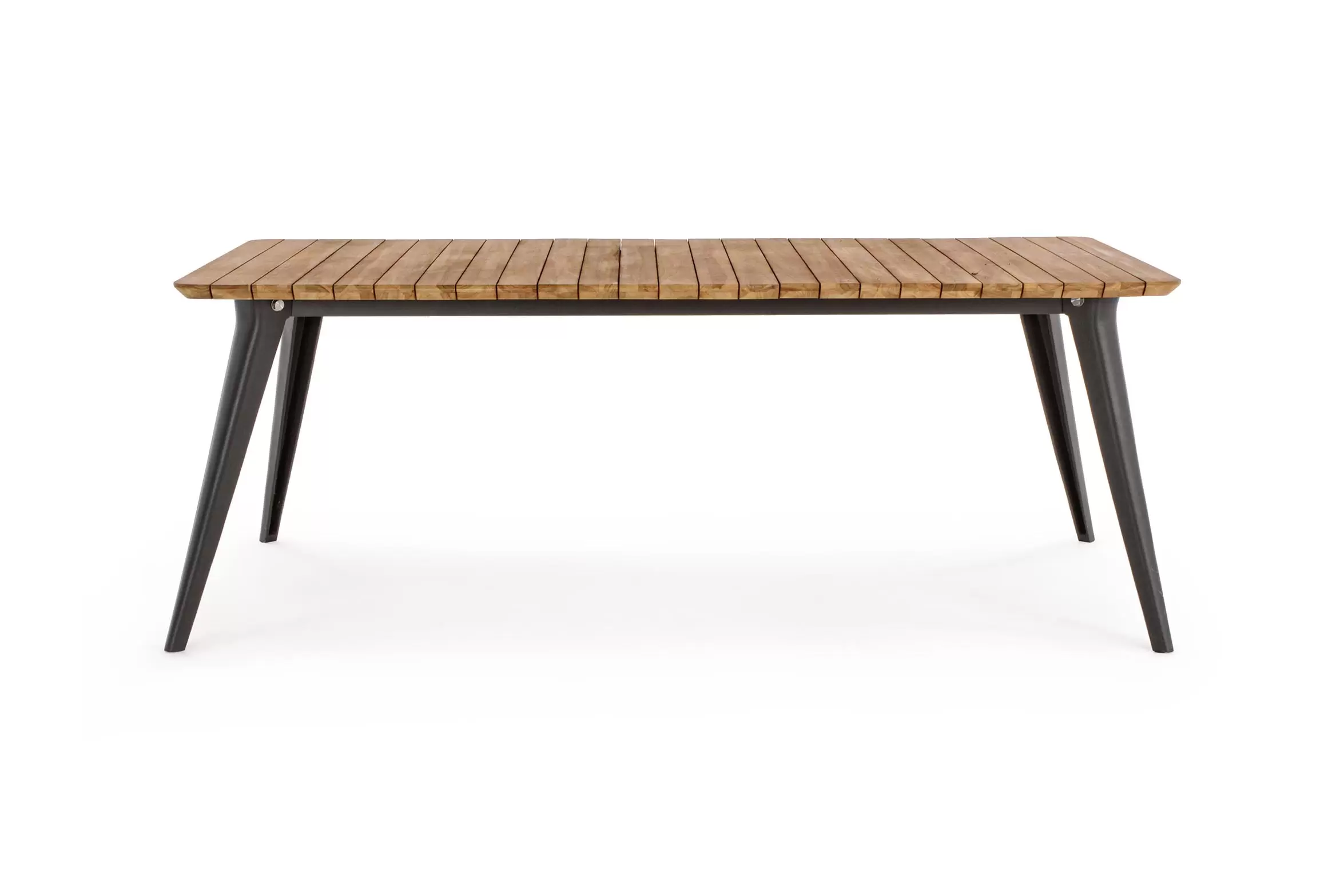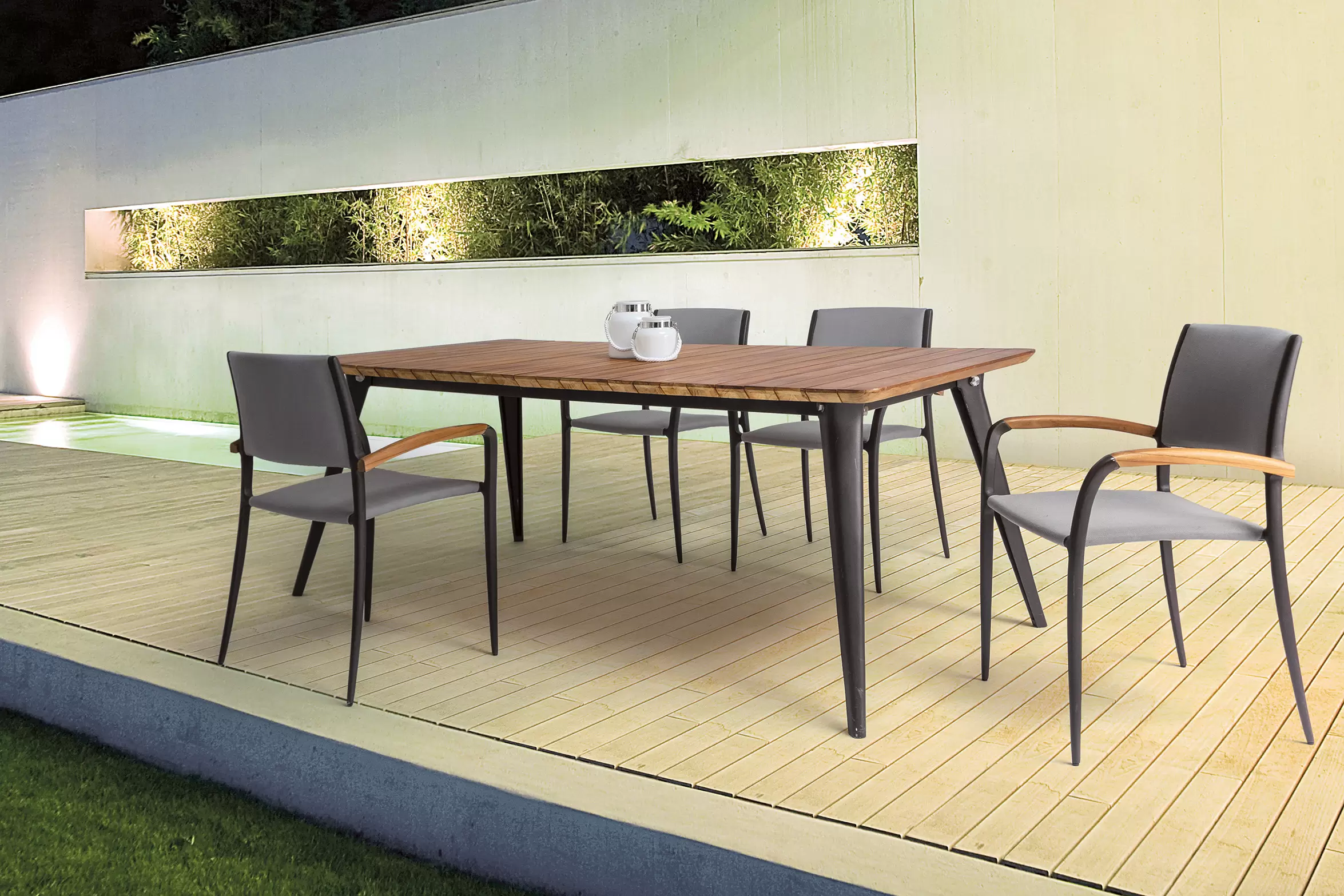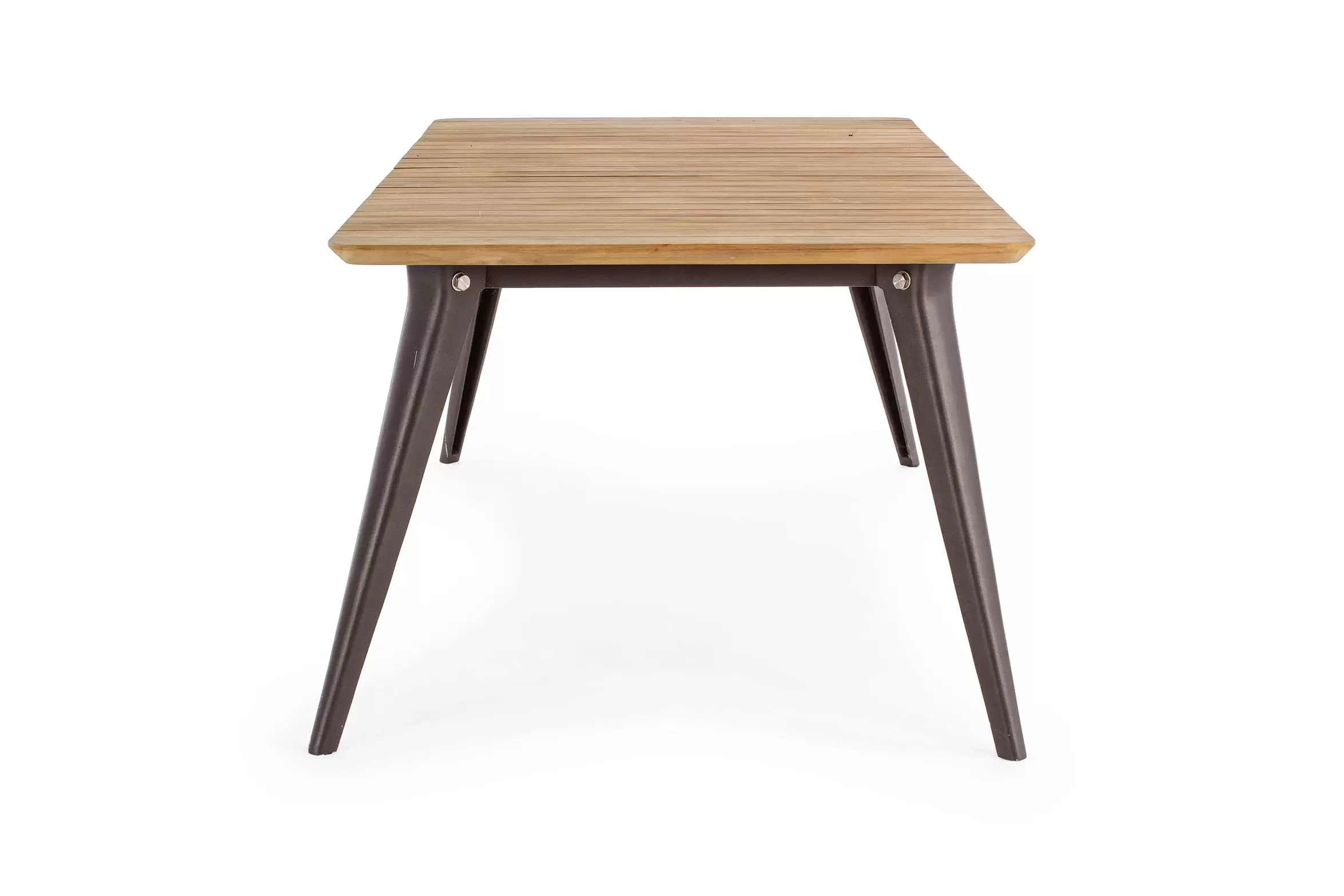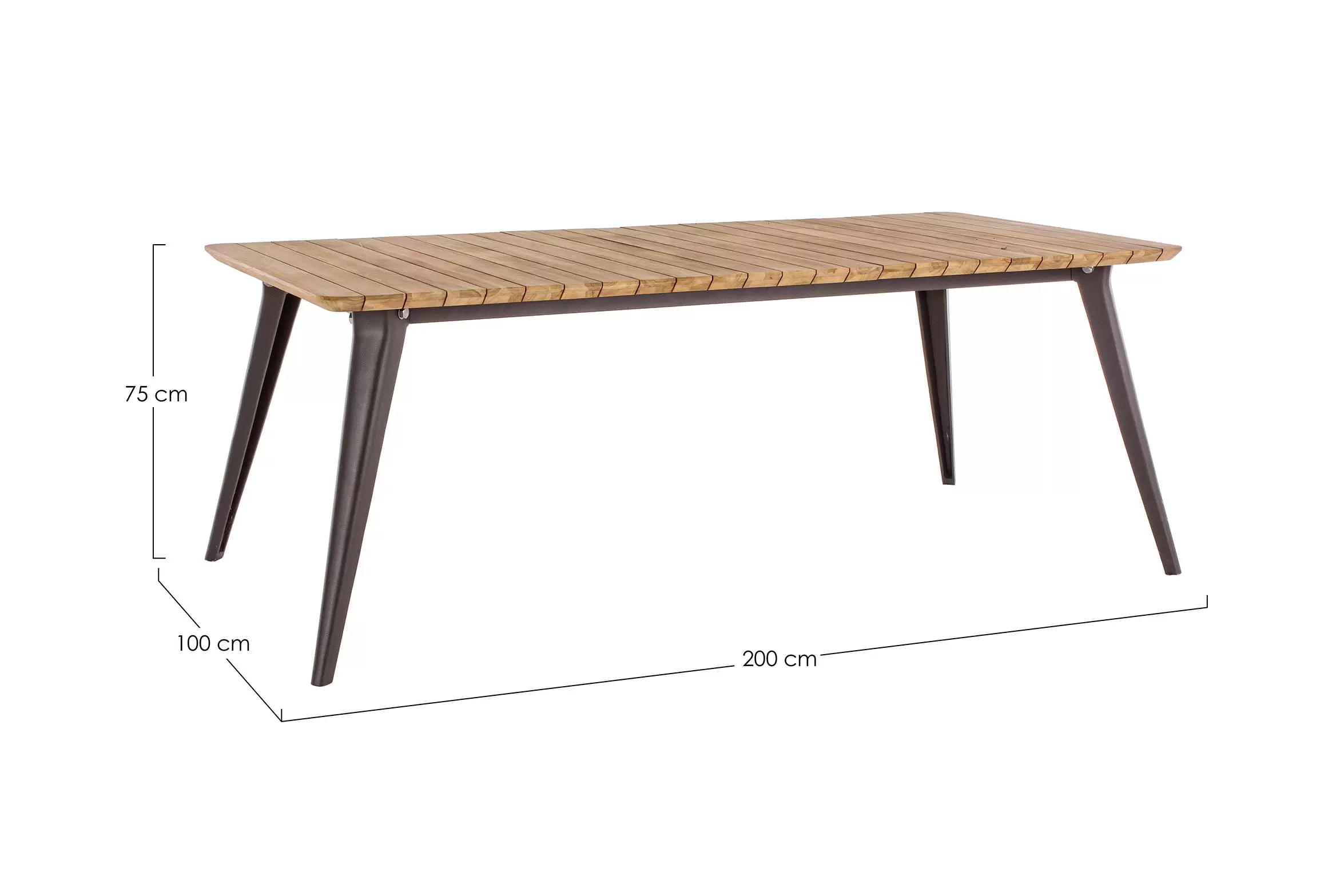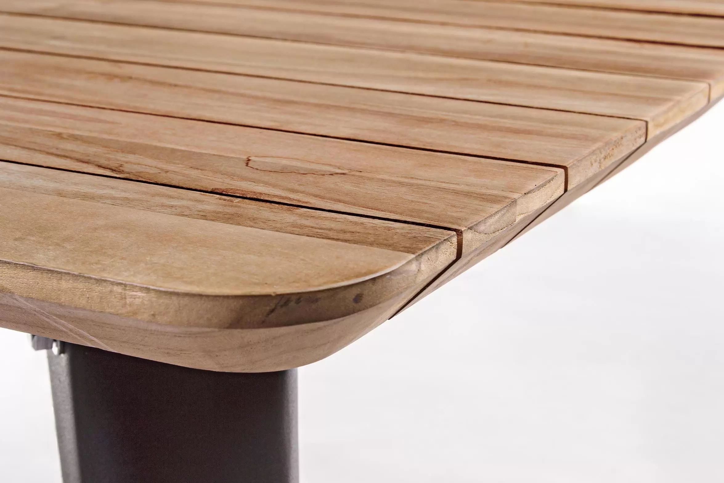 Aluminiowa konstrukcja nóg malowana proszkowo na kolor antracyt. Blat stołu z teku - svlk (prawne drewno indonezyjskie).