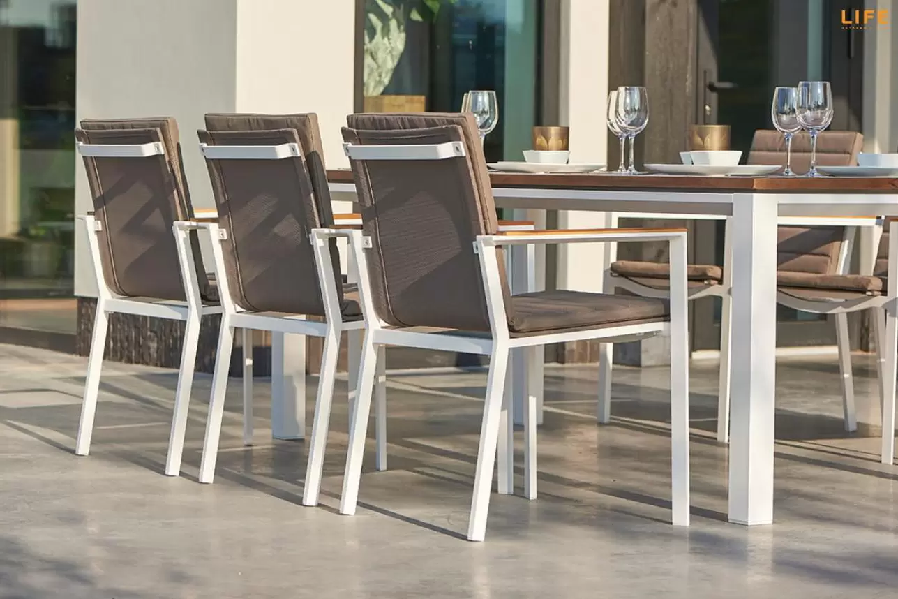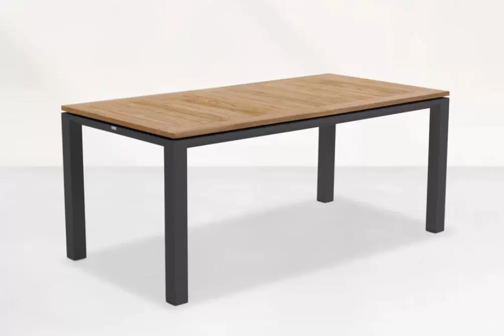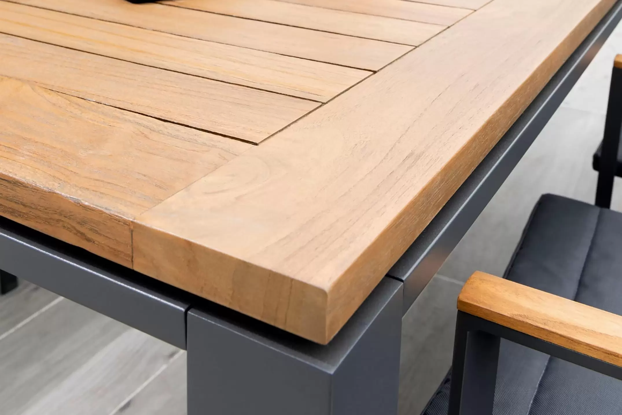 Stół ogrodowy z podstawą z aluminium w kolorach białym lub ciemnoszarym oraz TEAKOWYM blatem.