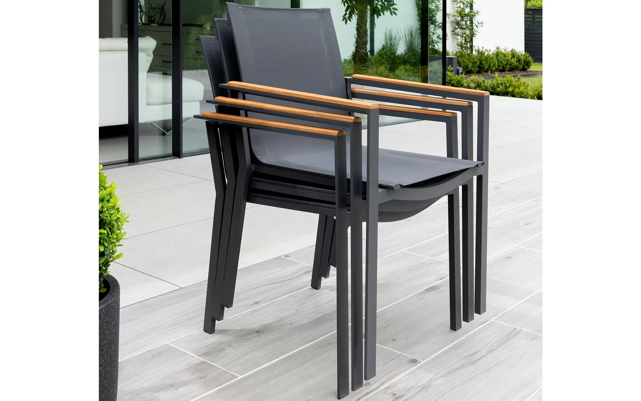 Zestaw uzupełniają fotele sztaplowane Primavera. z siedziskami z tekstyliny.