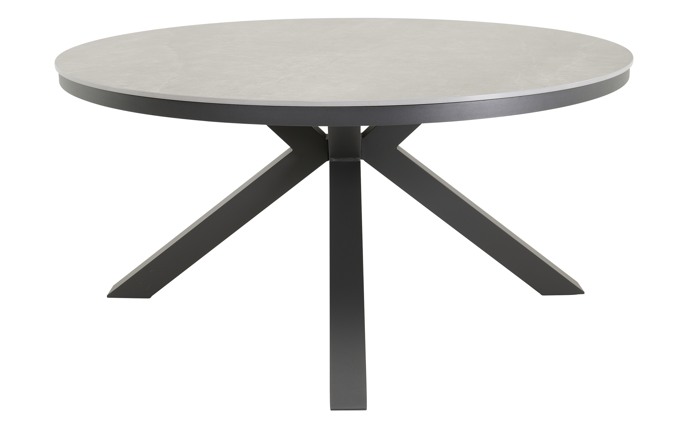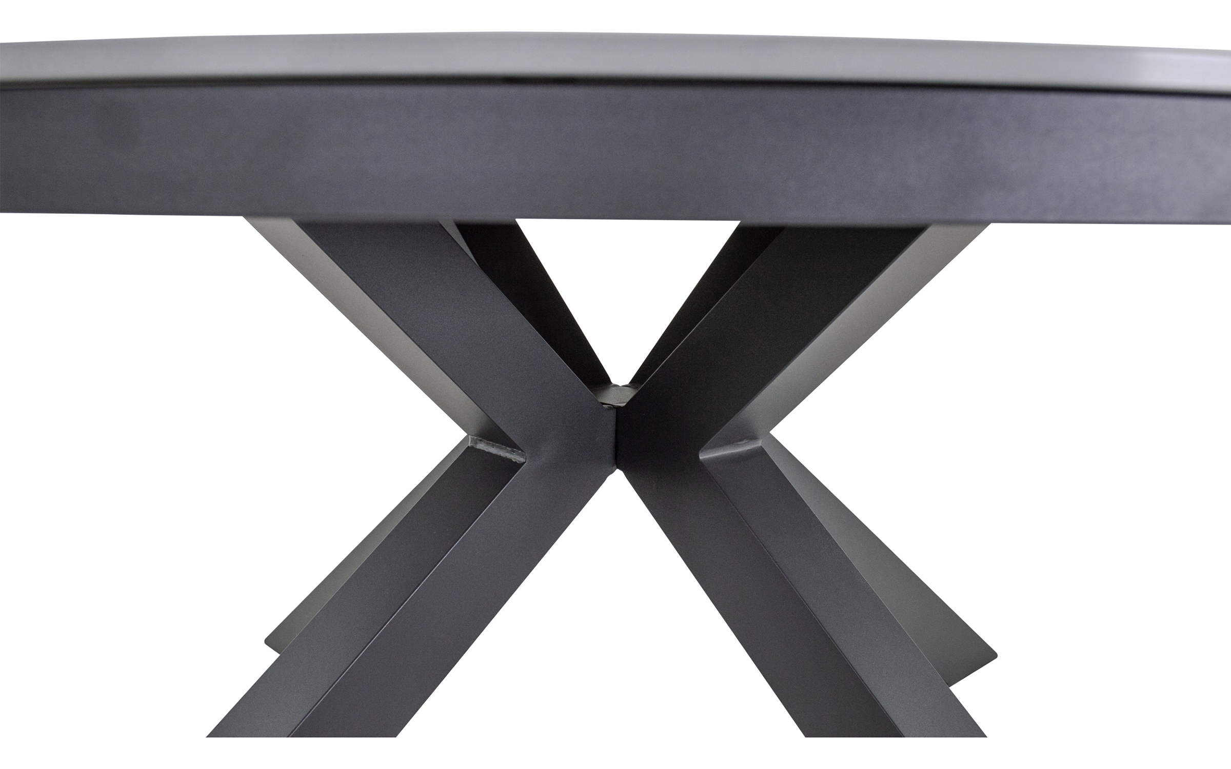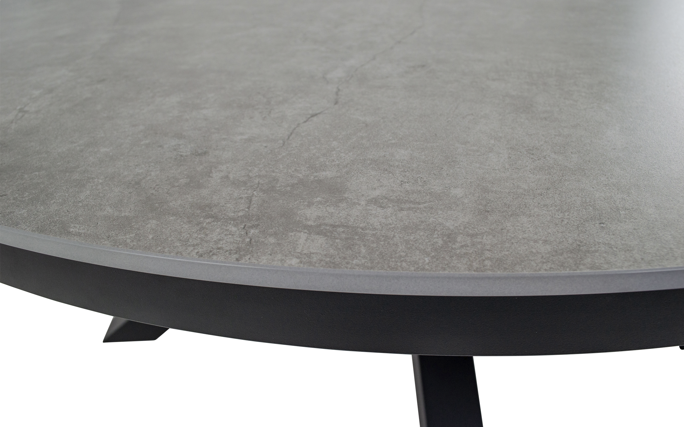 Konstrukcja stołu została wykonana z aluminium malowanego proszkowo, co gwarantuje trwałość i odporność na warunki atmosferyczne. Krzyżowe nogi o profilu 12×12 cm nadają całości stabilności oraz podkreślają nowoczesny, industrialny charakter mebla. Okrągły blat z kamienia spiekanego o grubości 12 mm zachwyca subtelną strukturą i eleganckim wykończeniem. Materiał ten jest wyjątkowo praktyczny – odporny na zarysowania, wysoką temperaturę, promieniowanie UV i wilgoć – dzięki czemu świetnie sprawdza się w codziennym użytkowaniu na zewnątrz.