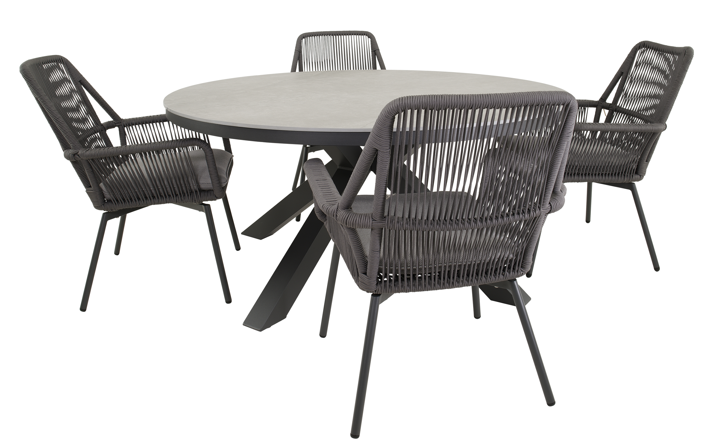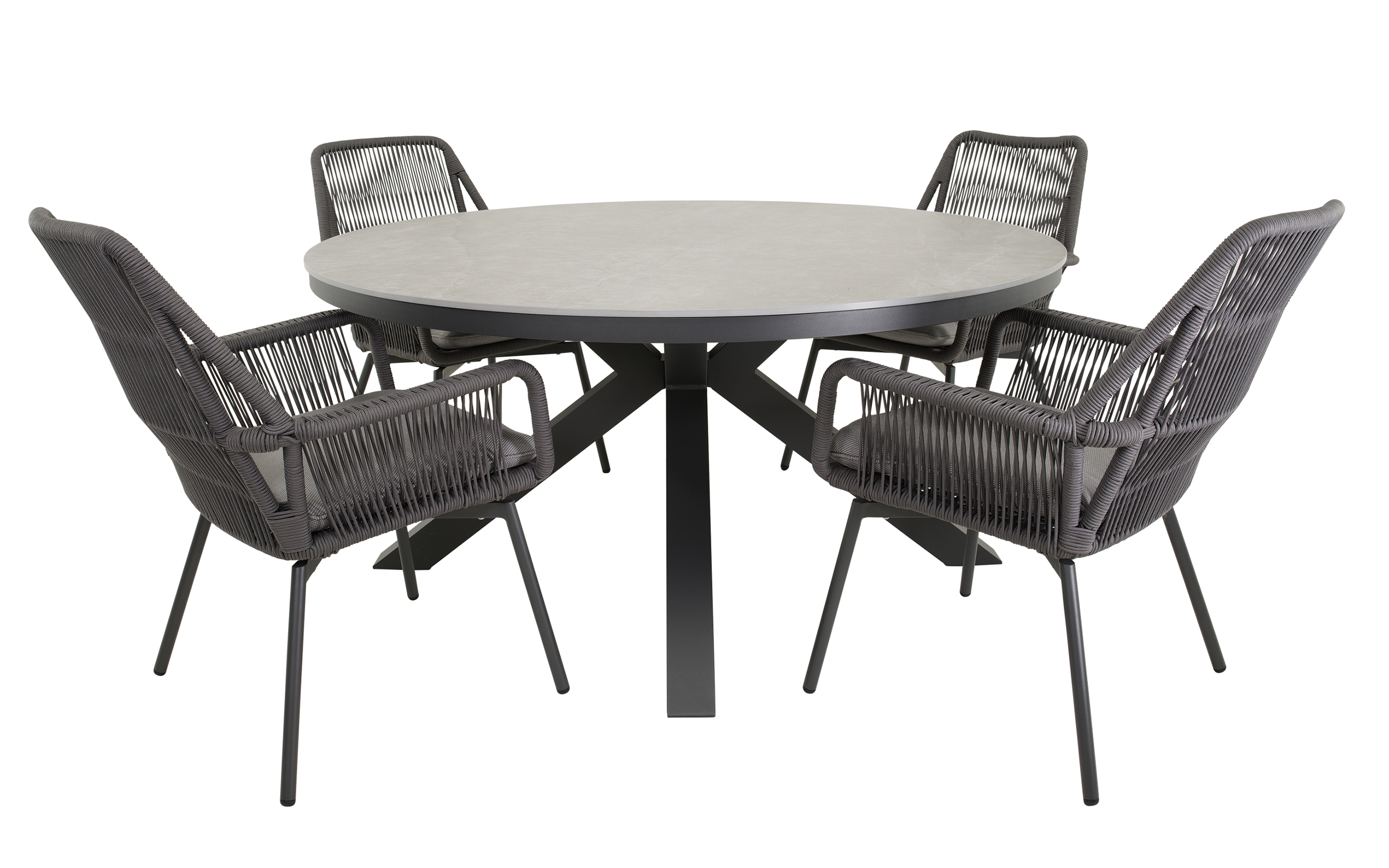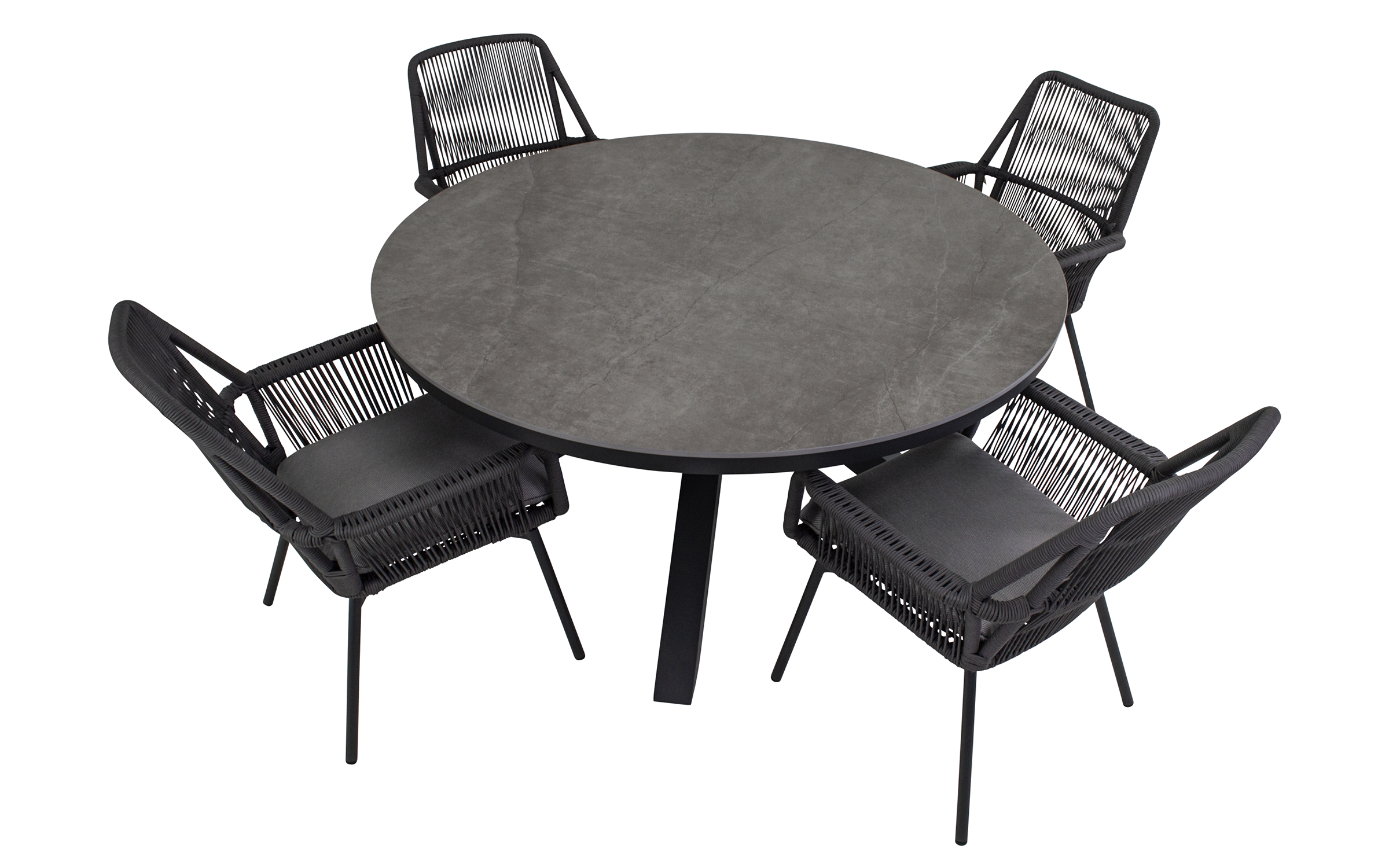 Konstrukcja stołu została wykonana z aluminium malowanego proszkowo, co gwarantuje trwałość i odporność na warunki atmosferyczne. Krzyżowe nogi o profilu 12×12 cm nadają całości stabilności oraz podkreślają nowoczesny, industrialny charakter mebla. Okrągły blat z kamienia spiekanego o grubości 12 mm zachwyca subtelną strukturą i eleganckim wykończeniem. Materiał ten jest wyjątkowo praktyczny – odporny na zarysowania, wysoką temperaturę, promieniowanie UV i wilgoć – dzięki czemu świetnie sprawdza się w codziennym użytkowaniu na zewnątrz.