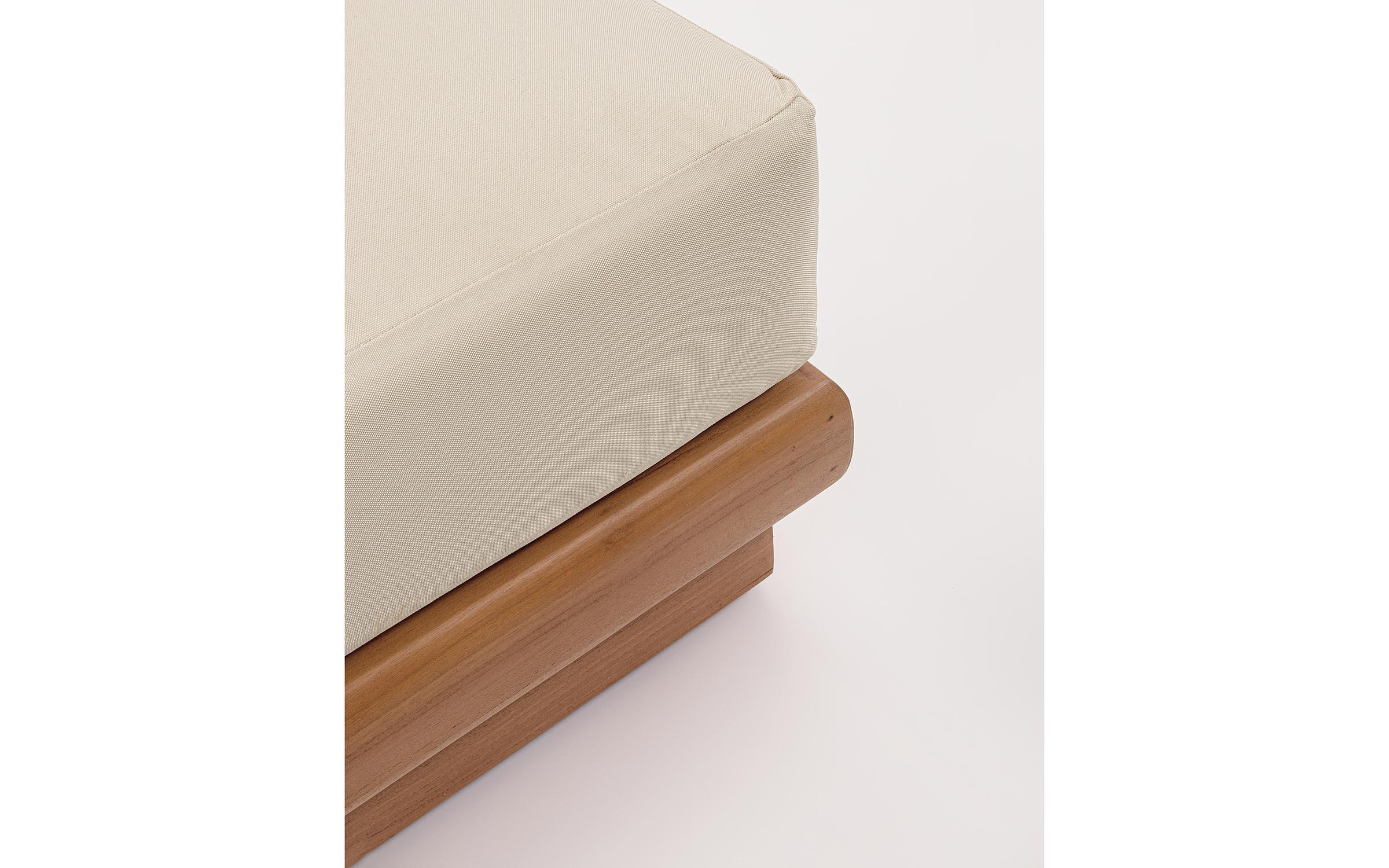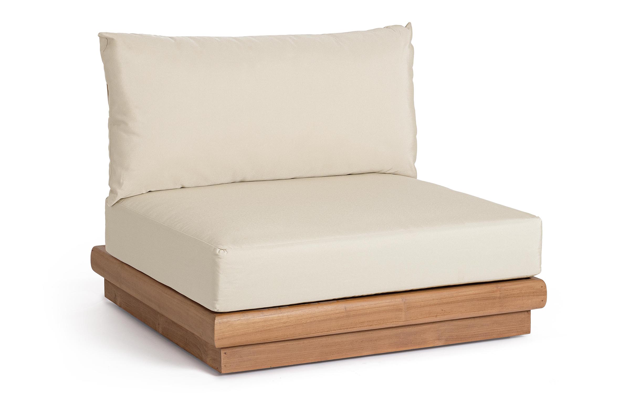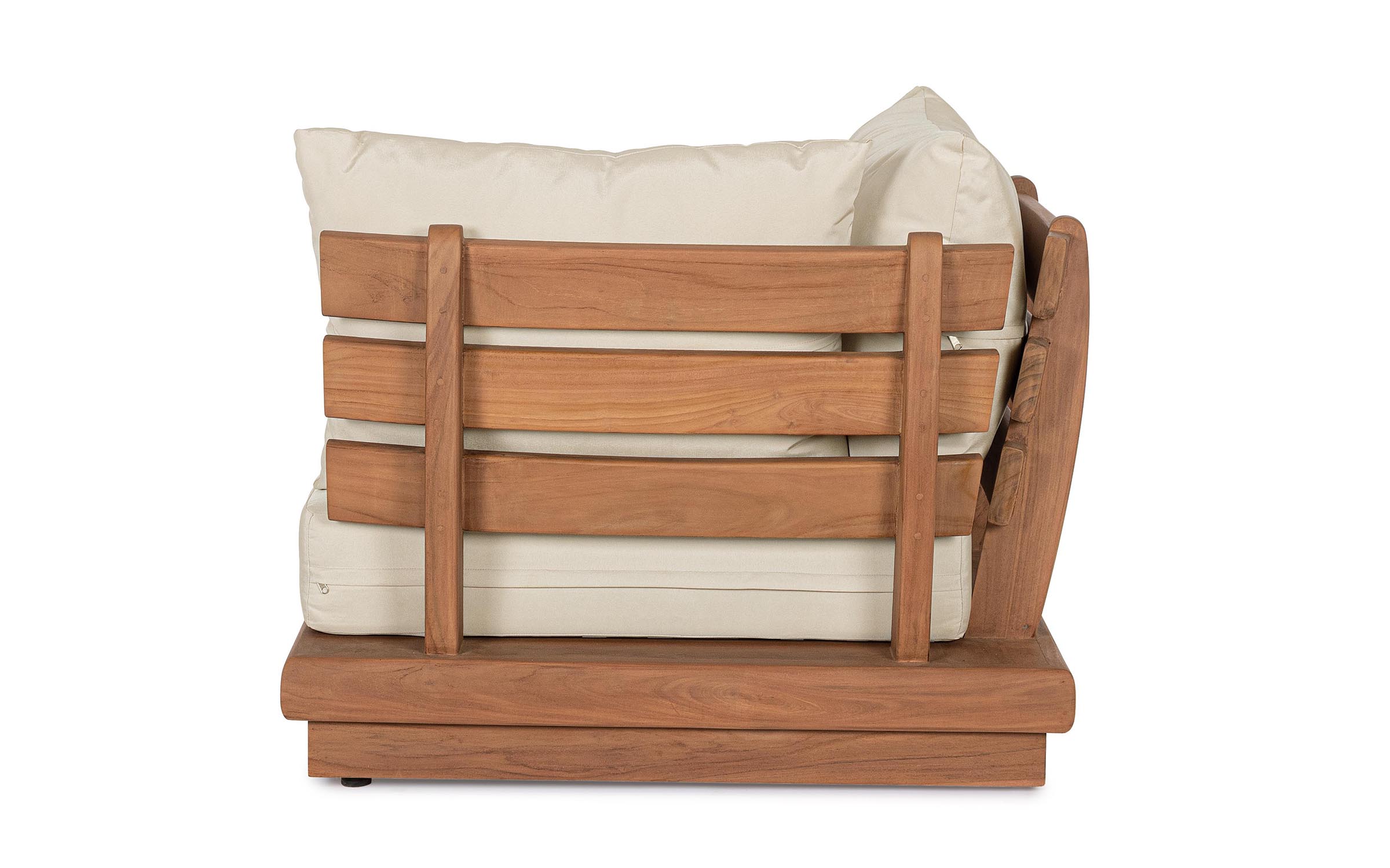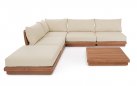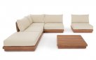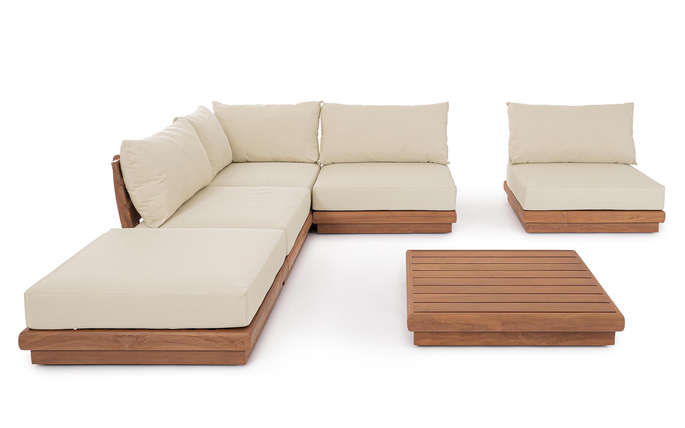 Modułowe meble ogrodowe wykonane z teaku premium z beżowymi poduszkami. Z elementów kolekcji można tworzyć dowolne kombinacje.