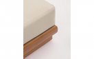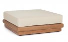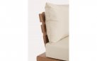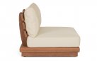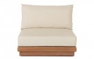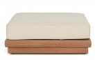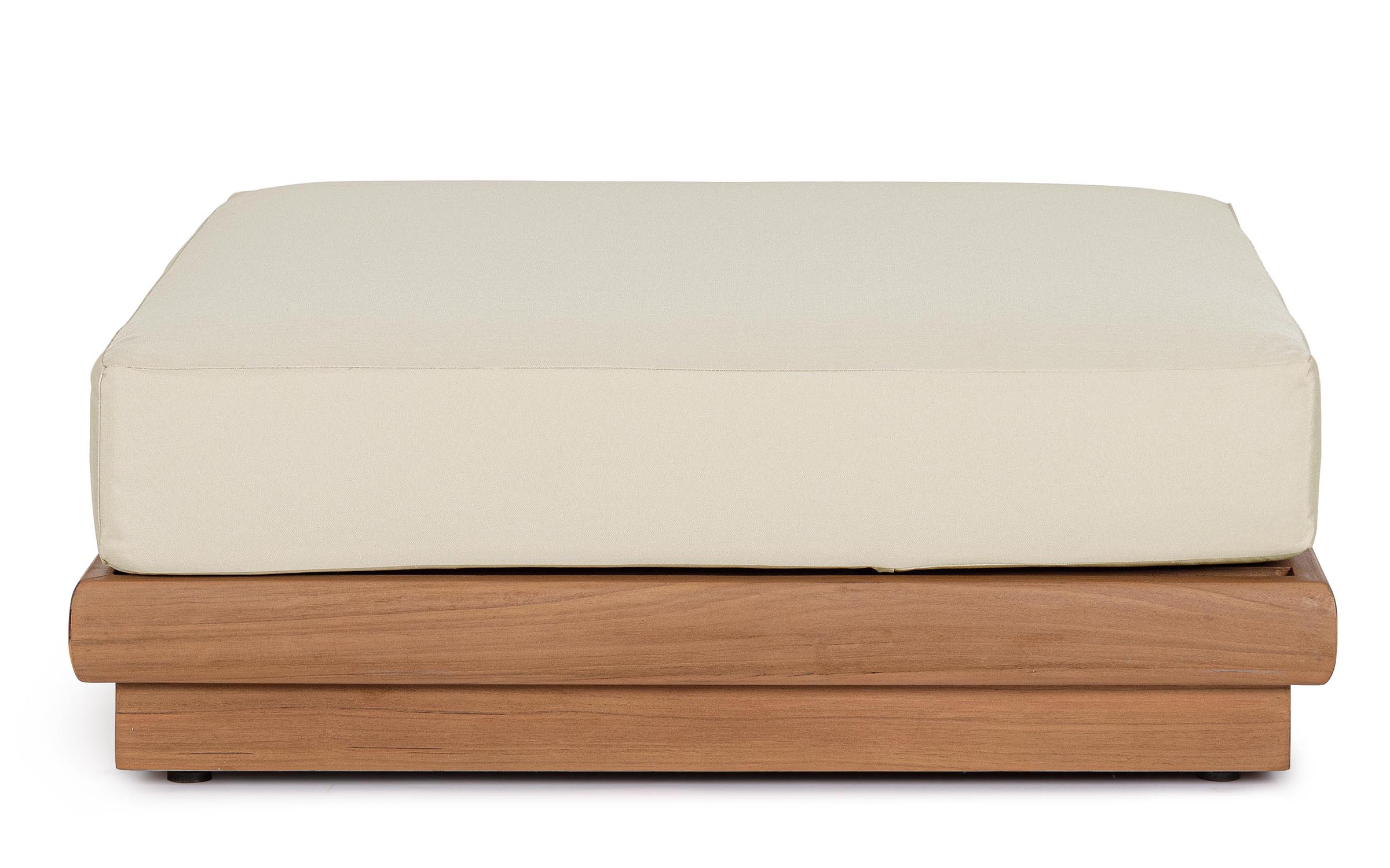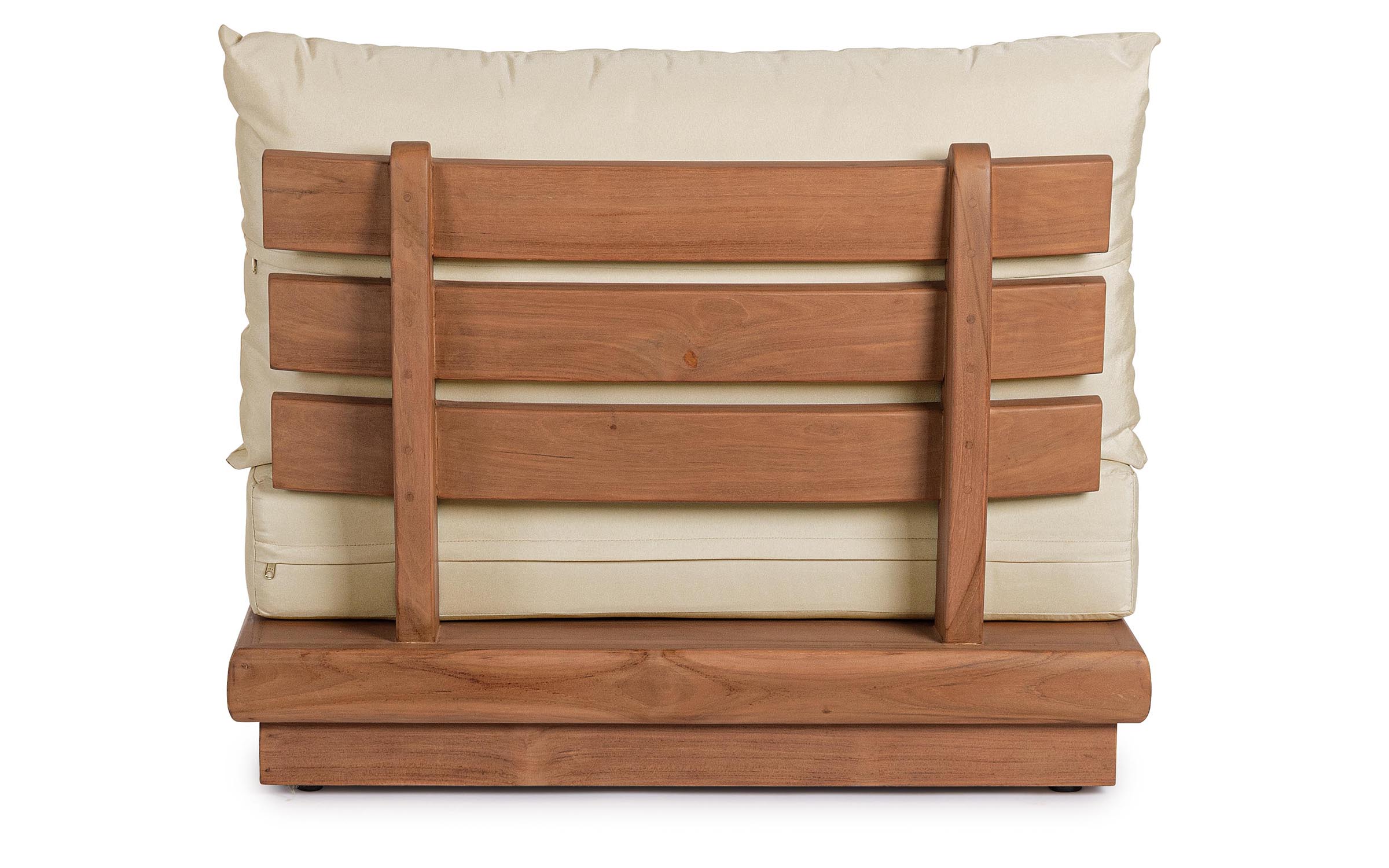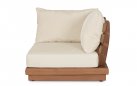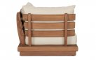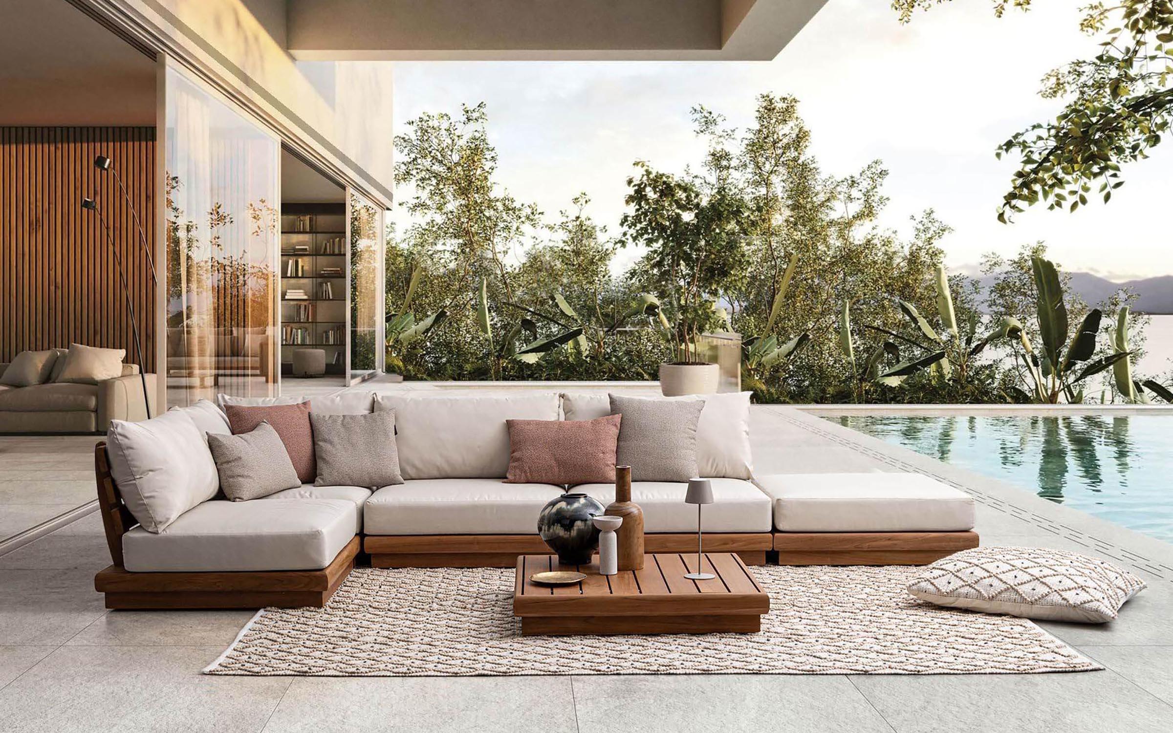 Modułowe meble ogrodowe wykonane z teaku premium z beżowymi poduszkami. Z elementów kolekcji można tworzyć dowolne kombinacje.