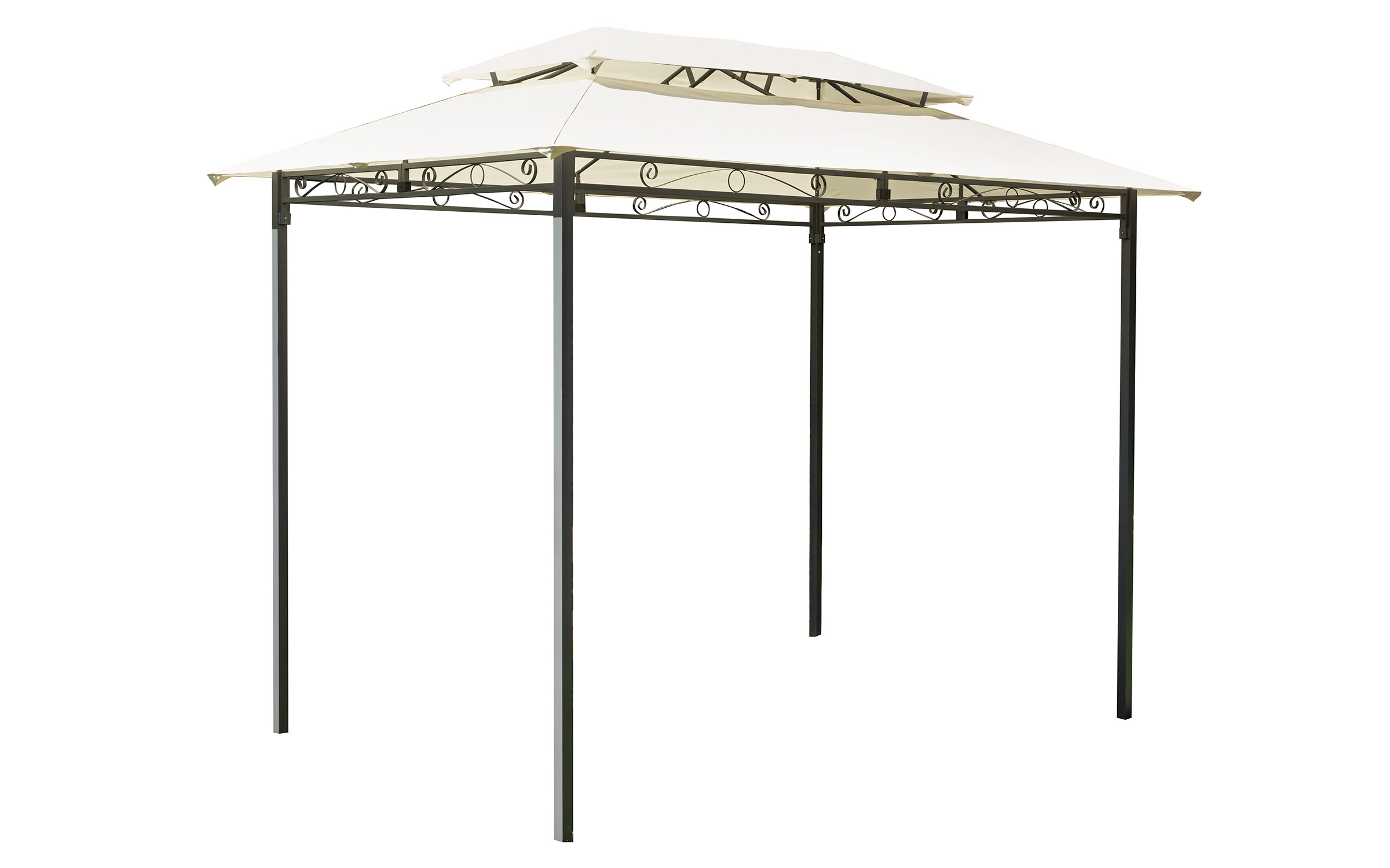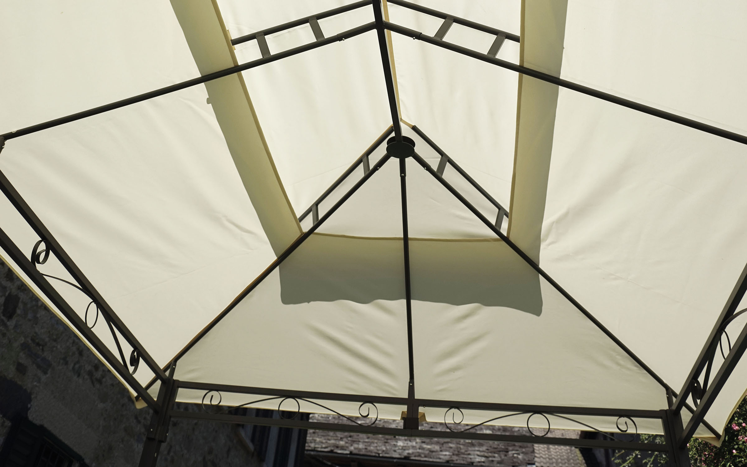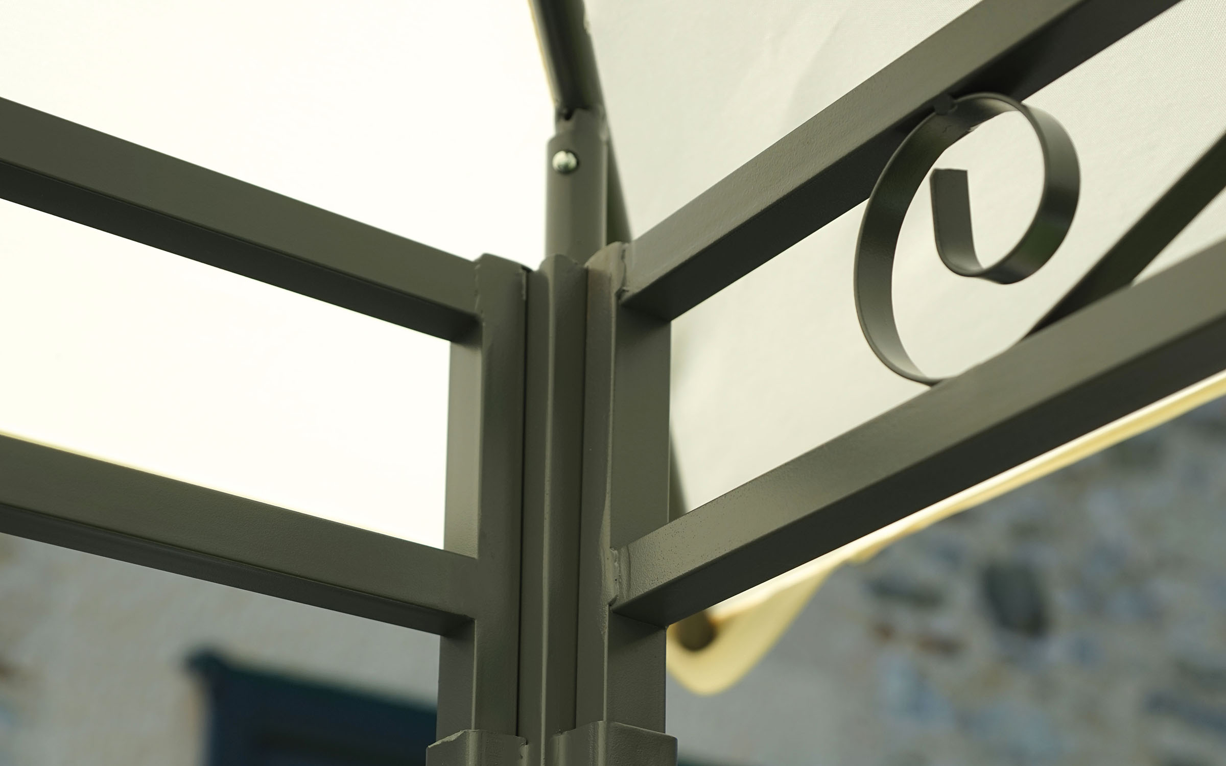 Stylowy namiot ogrodowy o wymiarach 3×2 m, idealny na taras, balkon lub do ogrodu. Konstrukcja wykonana z stali malowanej proszkowo w kolorze antracytowym. Poszycie z tkaniny poliestrowej ecru o wysokiej odporności na warunki atmosferyczne.