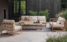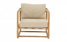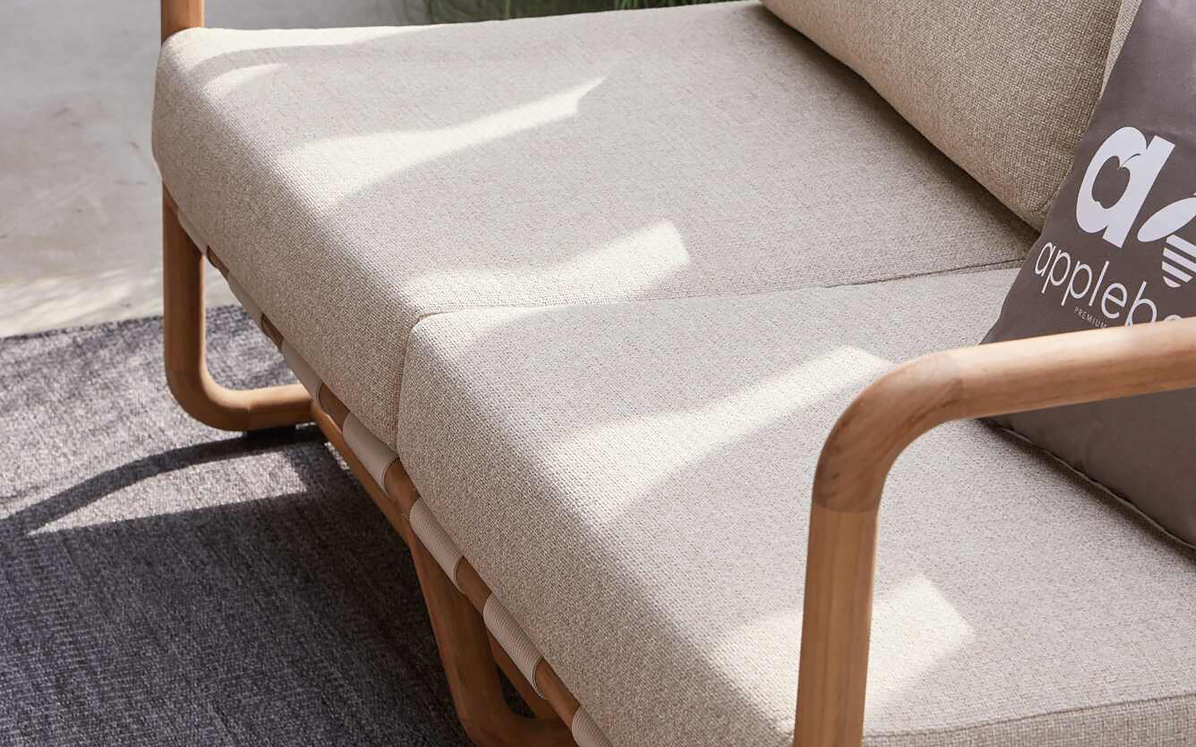 Konstrukcja z naturalnego drewna teak – odpornego na wilgoć, promieniowanie UV i zmienne warunki atmosferyczne. Teak zawiera naturalne oleje chroniące przed pleśnią i insektami. Poduszka z wypełnieniem Bee Wett – szybkoschnąca pianka o otwartej strukturze. Poszewka z tkaniny Olefin – odporna na zabrudzenia, pleśń i blaknięcie, łatwa w czyszczeniu. Wszystkie materiały przystosowane do użytku zewnętrznego przez cały sezon.
