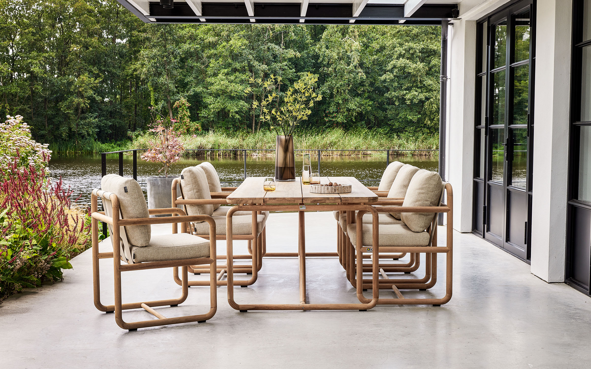 Naturalne drewno teak – wyjątkowo trwałe i odporne na wilgoć, promieniowanie UV oraz zmienne warunki atmosferyczne. Teak zawiera naturalne oleje chroniące przed pleśnią i insektami. Drewno nie wymaga impregnacji, a z czasem nabiera szlachetnej, srebrzystej patyny. Idealne do użytku zewnętrznego przez cały sezon.