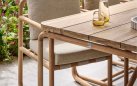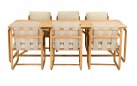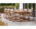 Dolce Dining Set to elegancki zestaw stołowy inspirowany estetyką lat 70. Zaokrąglone profile, naturalne drewno teakowe i widoczne pasy podtrzymujące poduszki tworzą harmonijną całość. Krzesła zapewniają wysoki komfort dzięki poduszkom All Weather Bee Wett w kolorze jasny beż. Stół o długości 240 cm pomieści wygodnie 6 osób.
