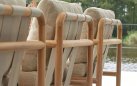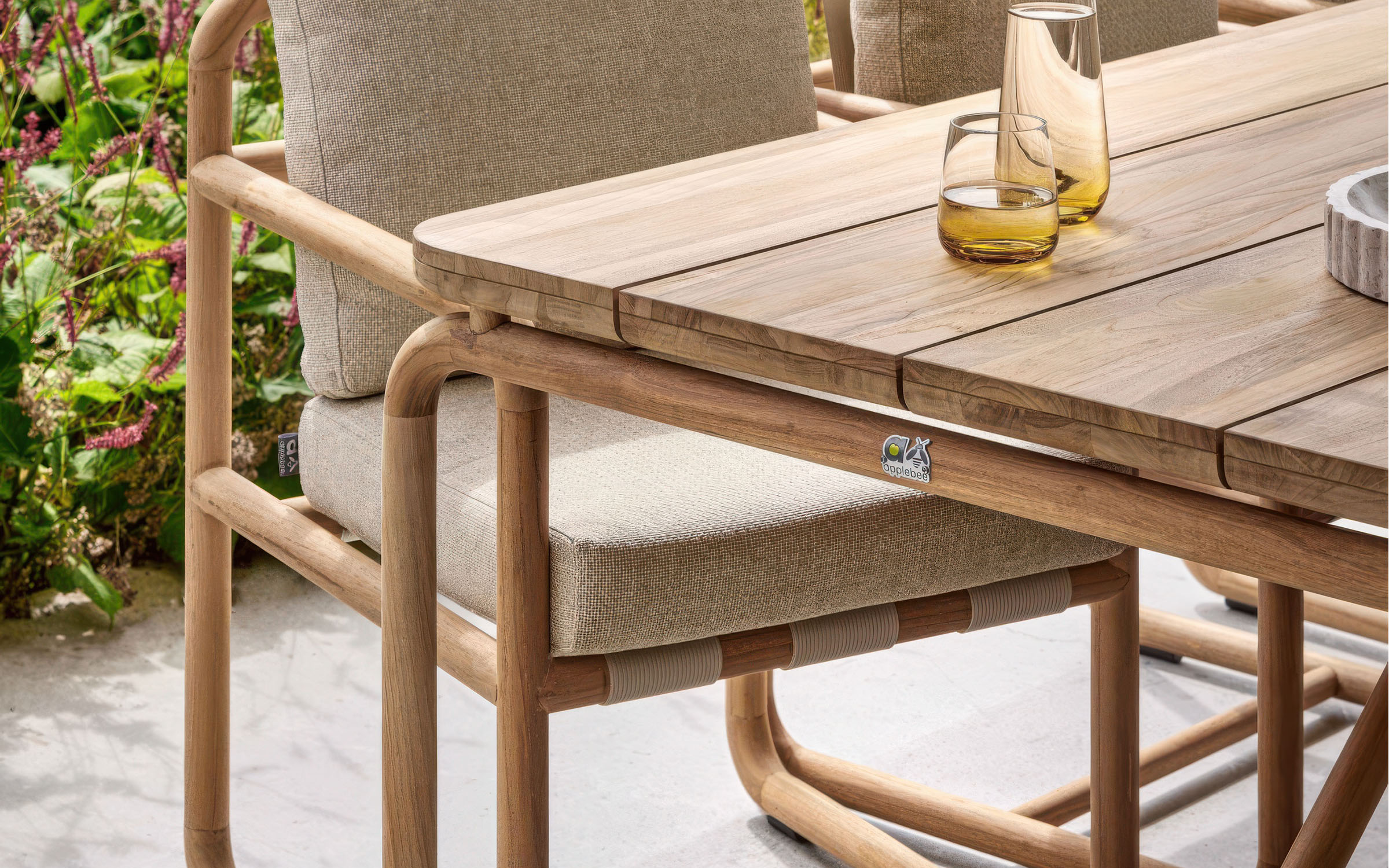 Konstrukcja z naturalnego teaku – drewno odporne na wilgoć, promieniowanie UV i zmienne warunki atmosferyczne. Teak zawiera naturalne oleje chroniące przed pleśnią i insektami. Poduszki z wypełnieniem Bee Wett – szybkoschnąca pianka o otwartej strukturze. Poszewki z tkaniny Olefin – odporne na zabrudzenia, pleśń i blaknięcie, łatwe w czyszczeniu. Wszystkie materiały przystosowane do użytku zewnętrznego przez cały sezon.